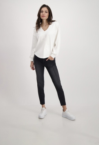 На сайте указаны российские размеры. Толстовка с длинными рукавами, V-образным вырезом и принтом. Длинные рукава с приспущенной линией плеч заканчиваются широкой манжетой с воланами. Прямой фасон дополняется V-образным вырезом и закругленным низом, а передняя часть украшена объемной надписью в тон. Вы чувствуете себя наиболее комфортно в простых и удобных топах? Тогда вам не обойтись без этой модели. Рост модели: 179 см. Длина по спине: 68 см.