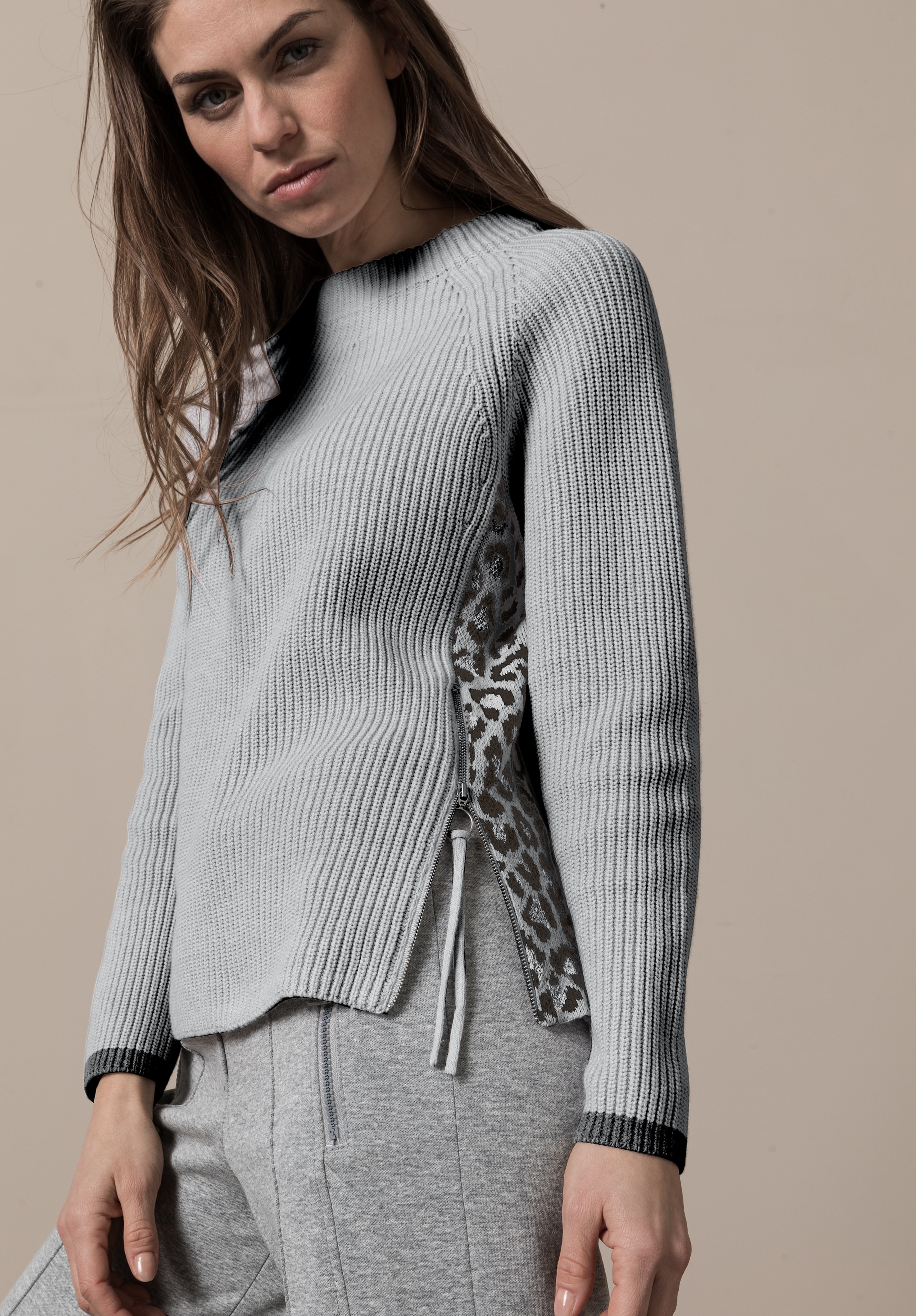 На сайте указаны российские размеры. Свитер крупной вязки с животным принтом сбоку. Высококачественная хлопковая смесь для удобной посадки. Боковая молния и контрастный низ рукавов. Круглый вырез, прямой крой, слегка удлиненная спинка. Длина джемпера в 44 размере - 62 см.