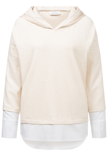 На сайте указаны российские размеры. Удобный пуловер с капюшоном, блузочной вставкой и блестящими деталями. Простая толстовка с капюшоном сочетает в себе все эти свойства со встроенной блузочной вставкой. Капюшон привлекает особое внимание, так как выполнен из слегка мерцающего атласа и умело выделяется на фоне остального потового материала. Модель ростом 177 см Измерения для 44 размера: Окружность груди: 113 см Обхват бедер: 112 см Длина спинки: 70 см Длина рукава: 71 см