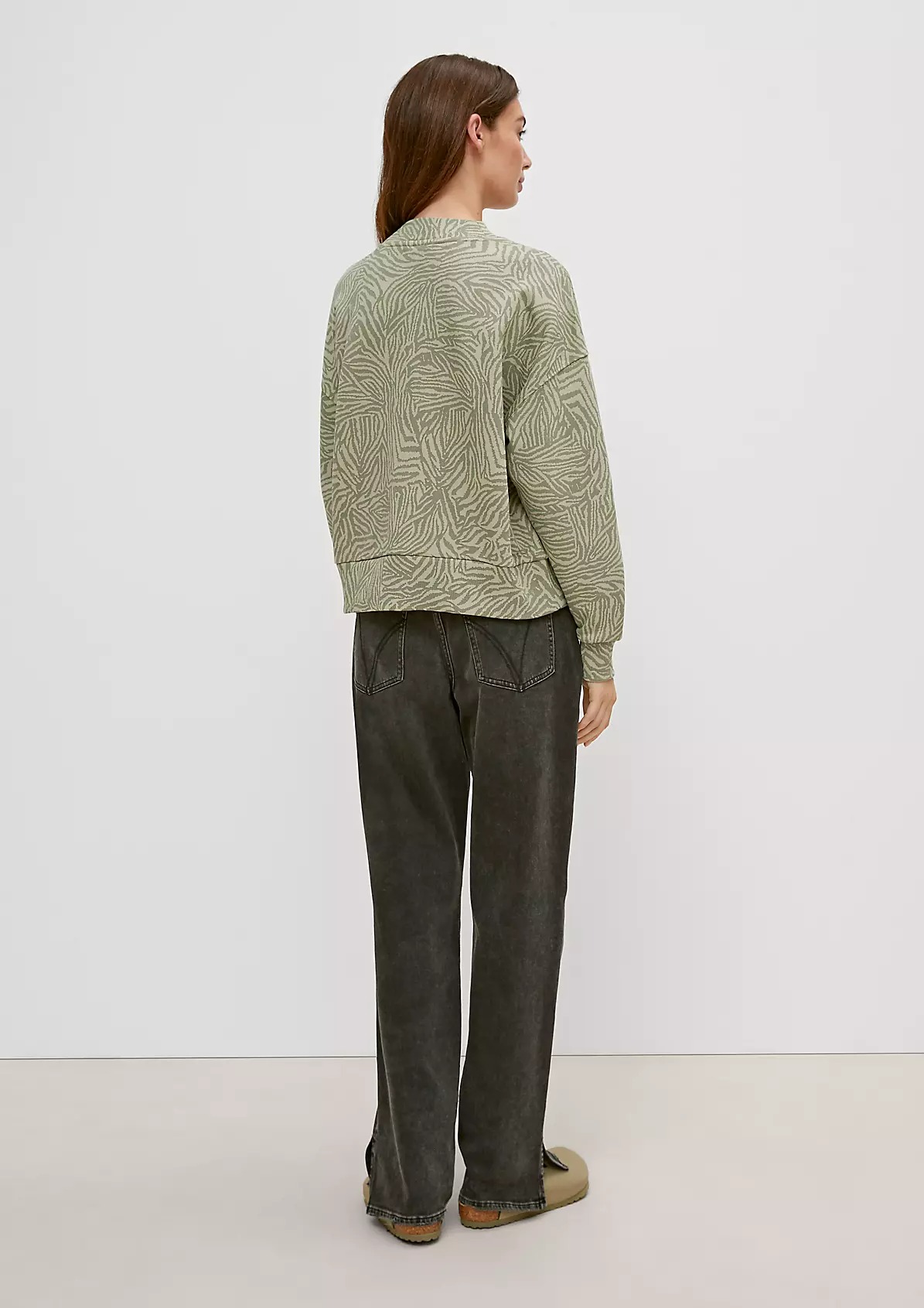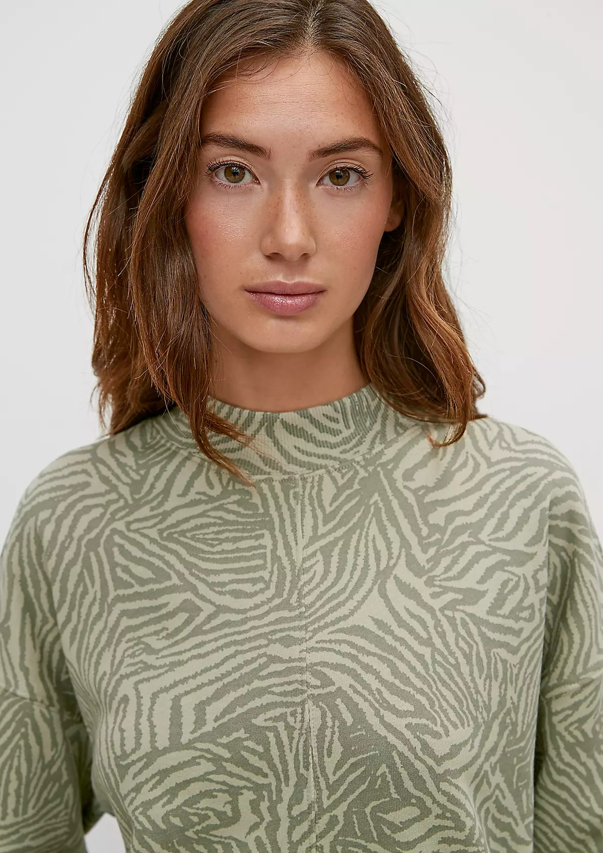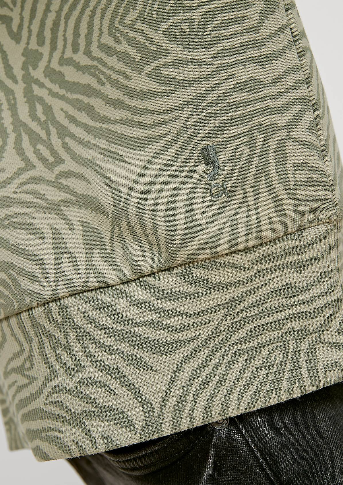 На сайте указаны российские размеры. Укороченный джемпер из мягкой ткани с анималистичным принтом. Круглый вырез горловины с отделкой в рубчик. Длинные рукава с ребристыми манжетами. Эластичный низ, с отделкой в рубчик. Длина спины: 56 см в размере 42. Рост модели 176 см.