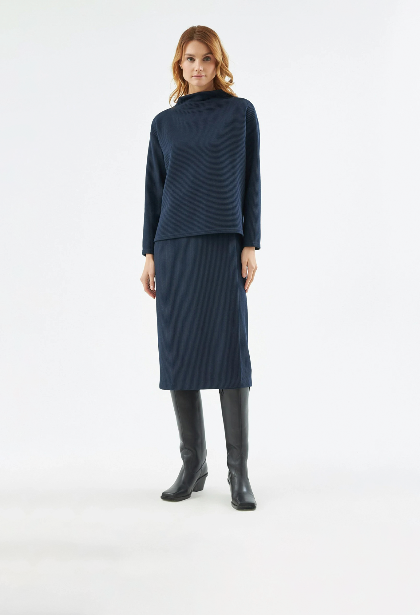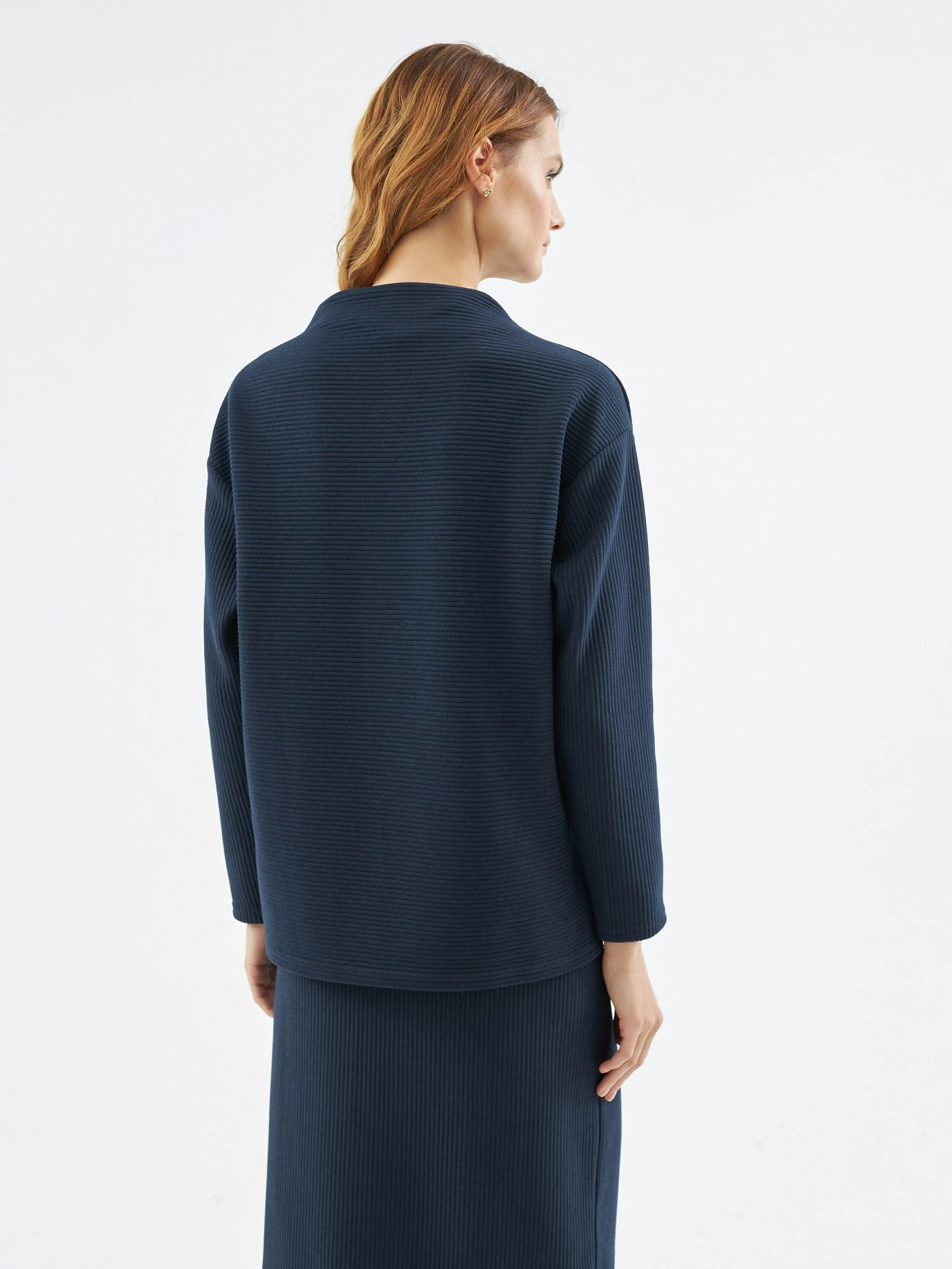 На сайте указаны российские размеры. Джемпер прямого силуэта из фактурного трикотажа тёмно-синего цвета, со спущенным плечом, рукавом полной длины и цельнокроеным воротником-стойка. Рост модели на фото - 175 см.