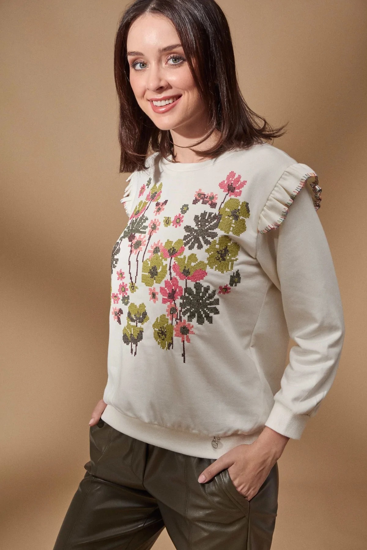 На сайте указаны российские размеры. Белая толстовка, вышитая цветами, с длинными рукавами. Также на рукавах, отделанных манжетами, имеется небольшой рюш на части чашки, отделанной разноцветной вышивкой. Рост нашей модели 170 см. Длина 59 см для размера 44.