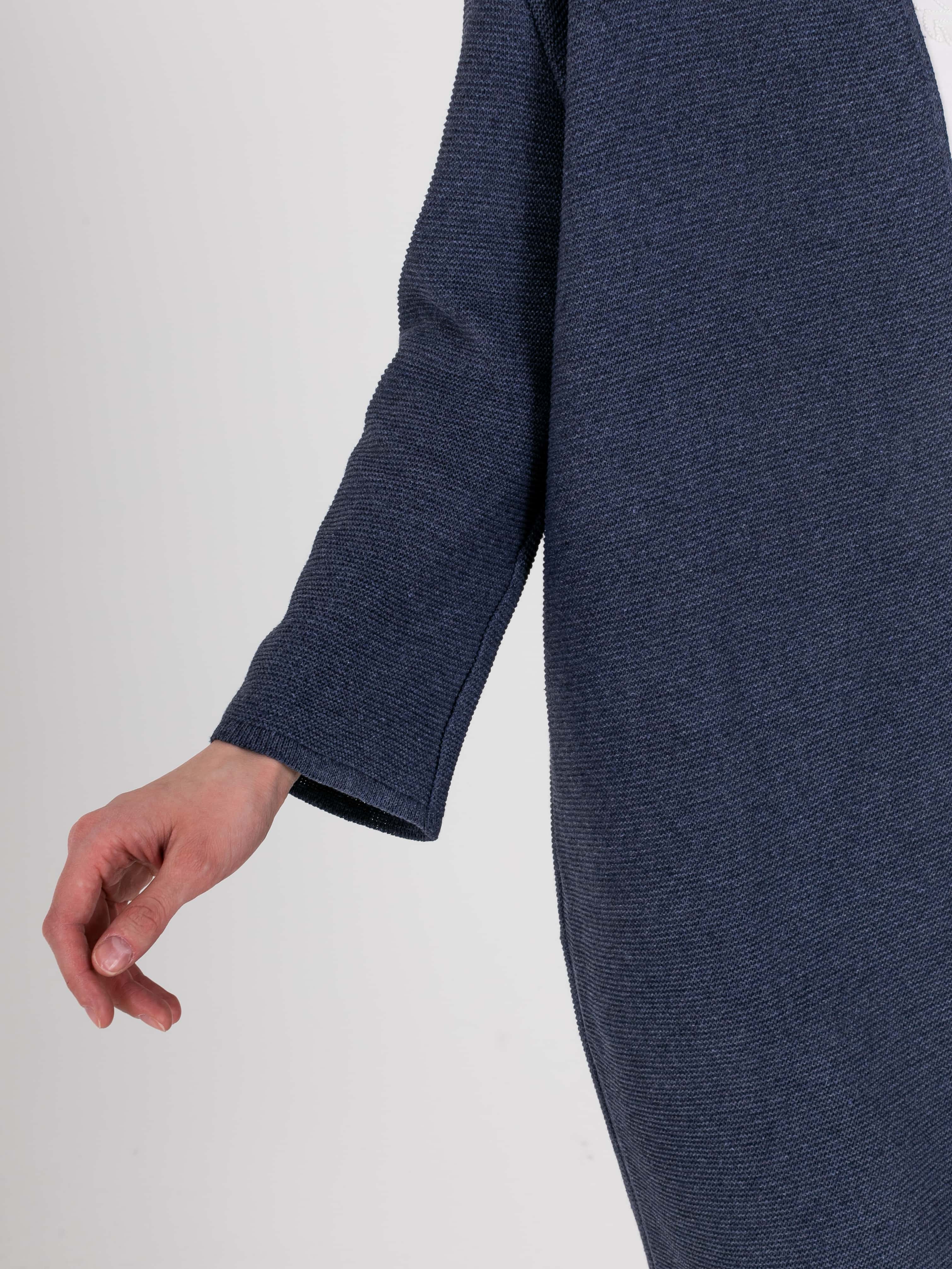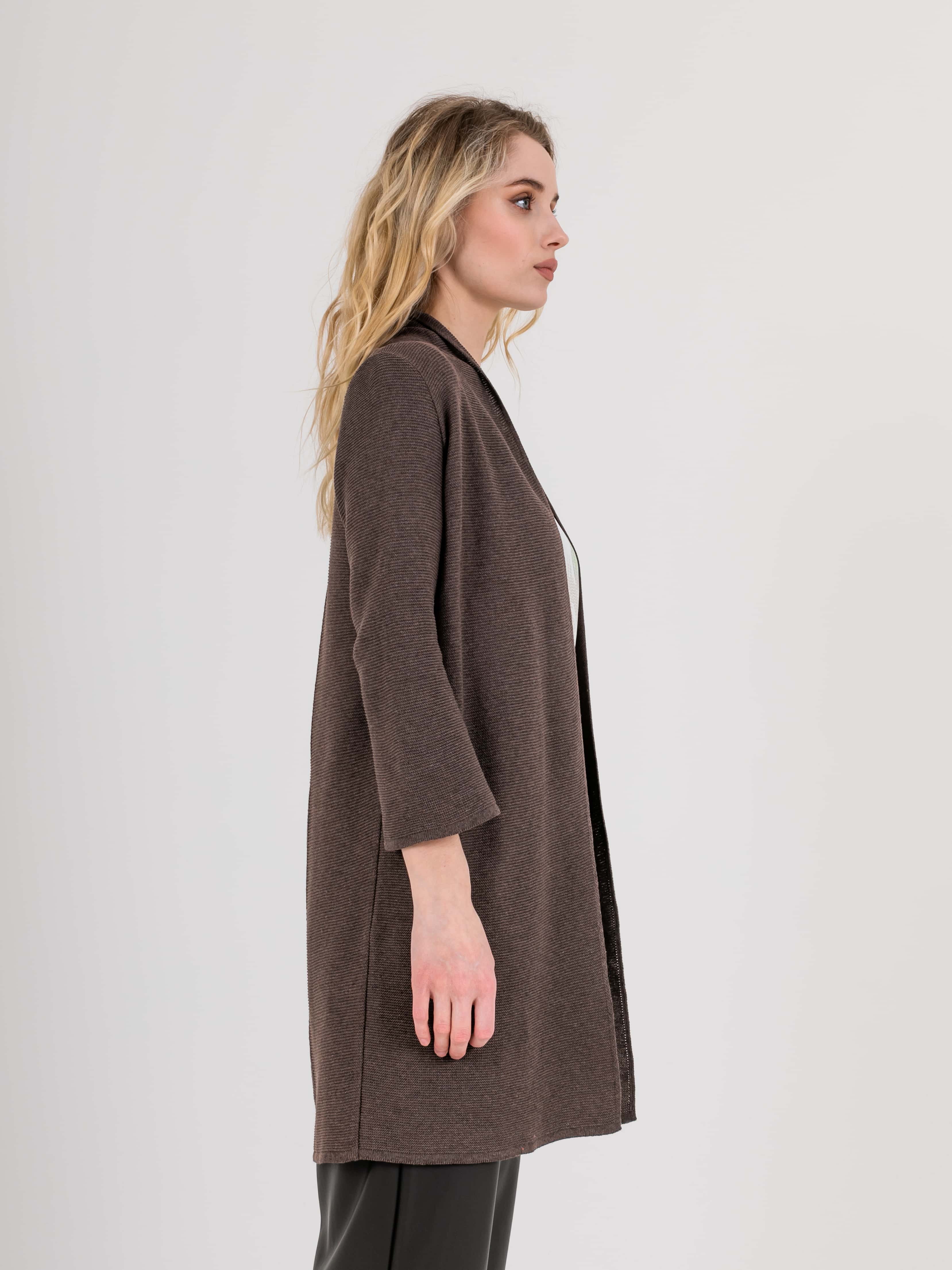 На сайте указаны российские размеры. Кардиган прямого силуэта длиной до середины бедер, из легкого хлопка с добавлением полиакрилонитрила. На спинке выполнен эффектный геометрический узор. Длинные втачные рукава со спущенной линией плеча. Горловина обработана небольшой стойкой.