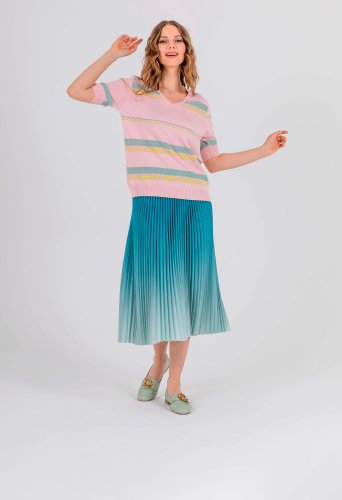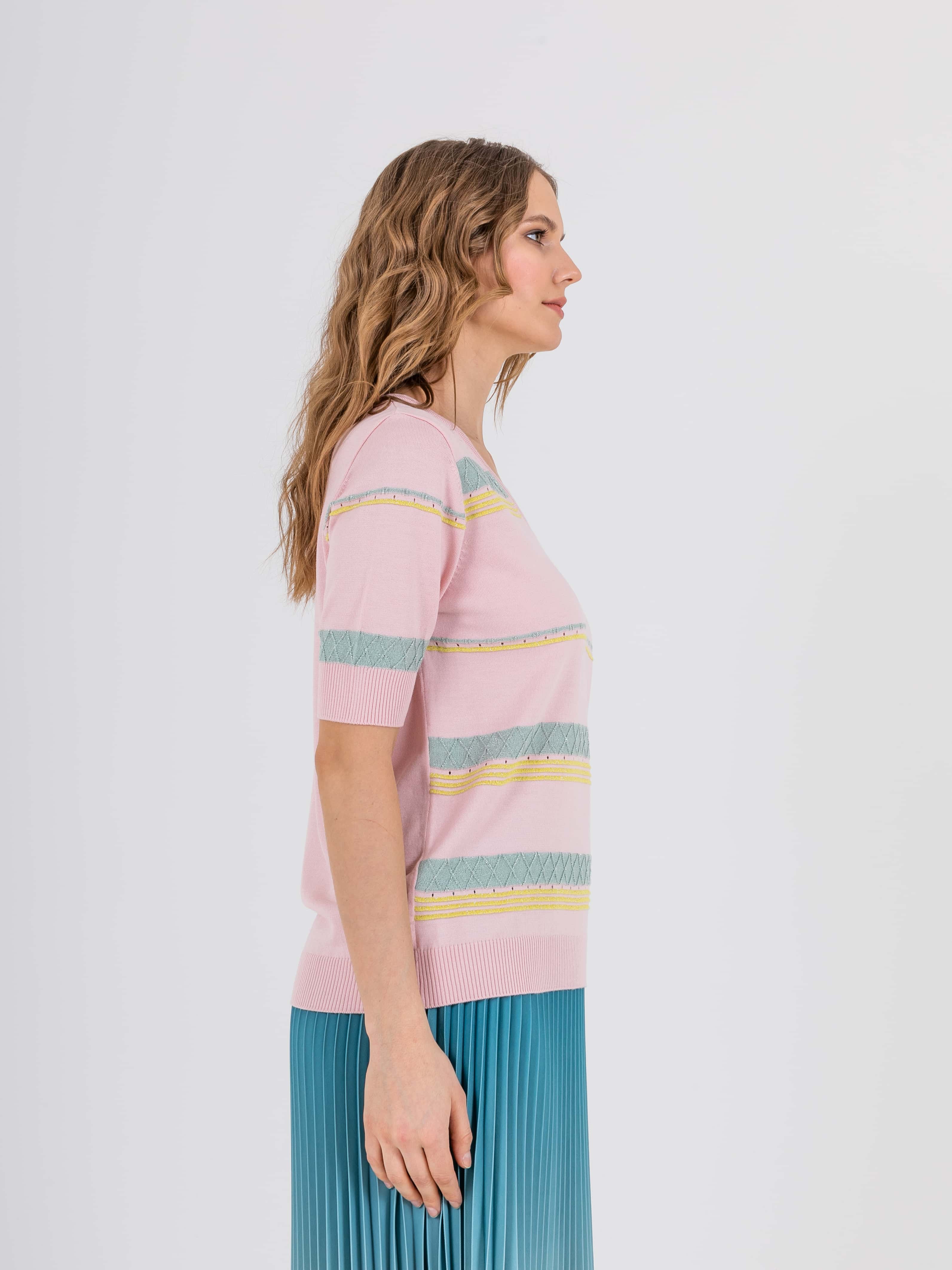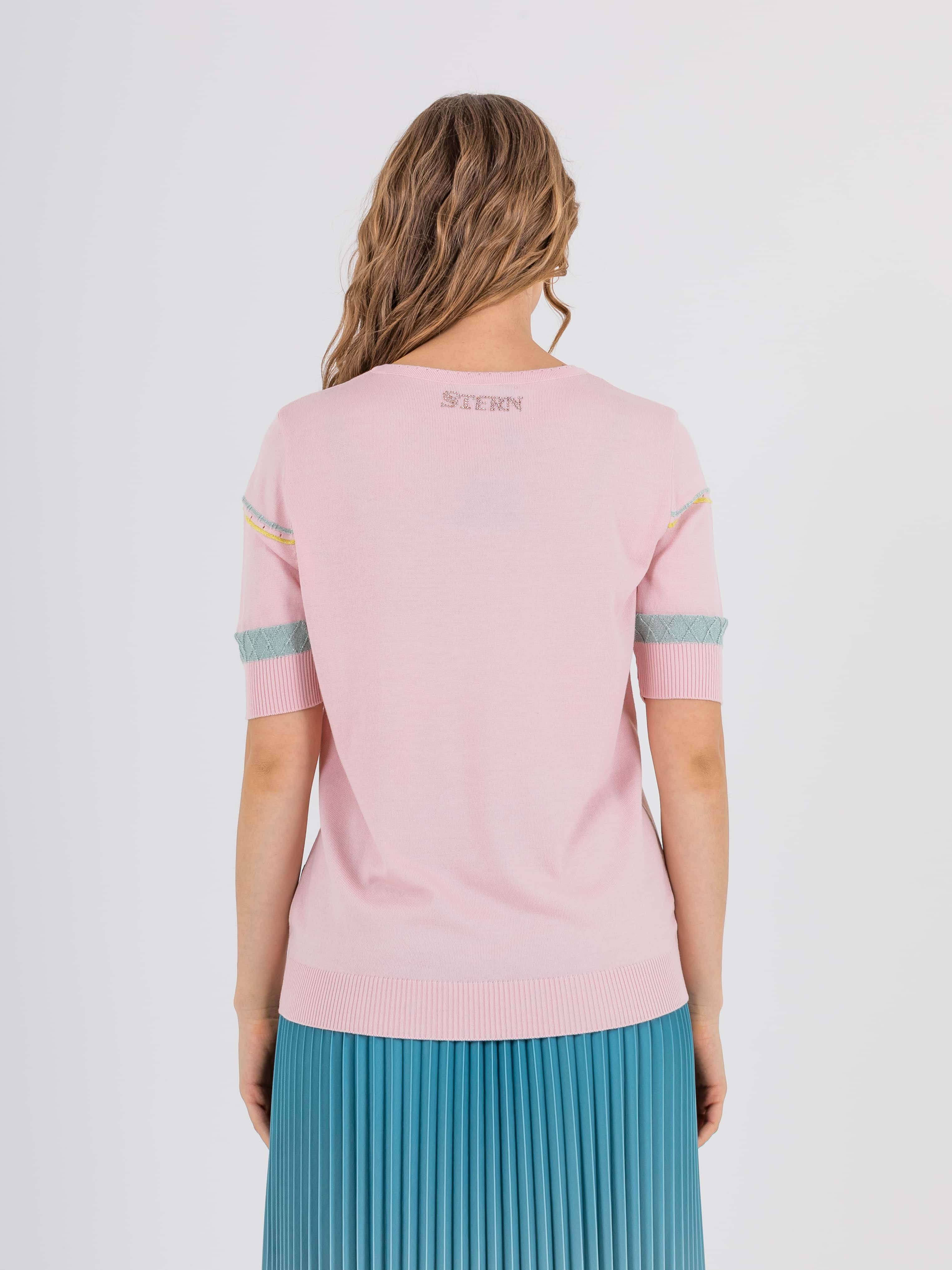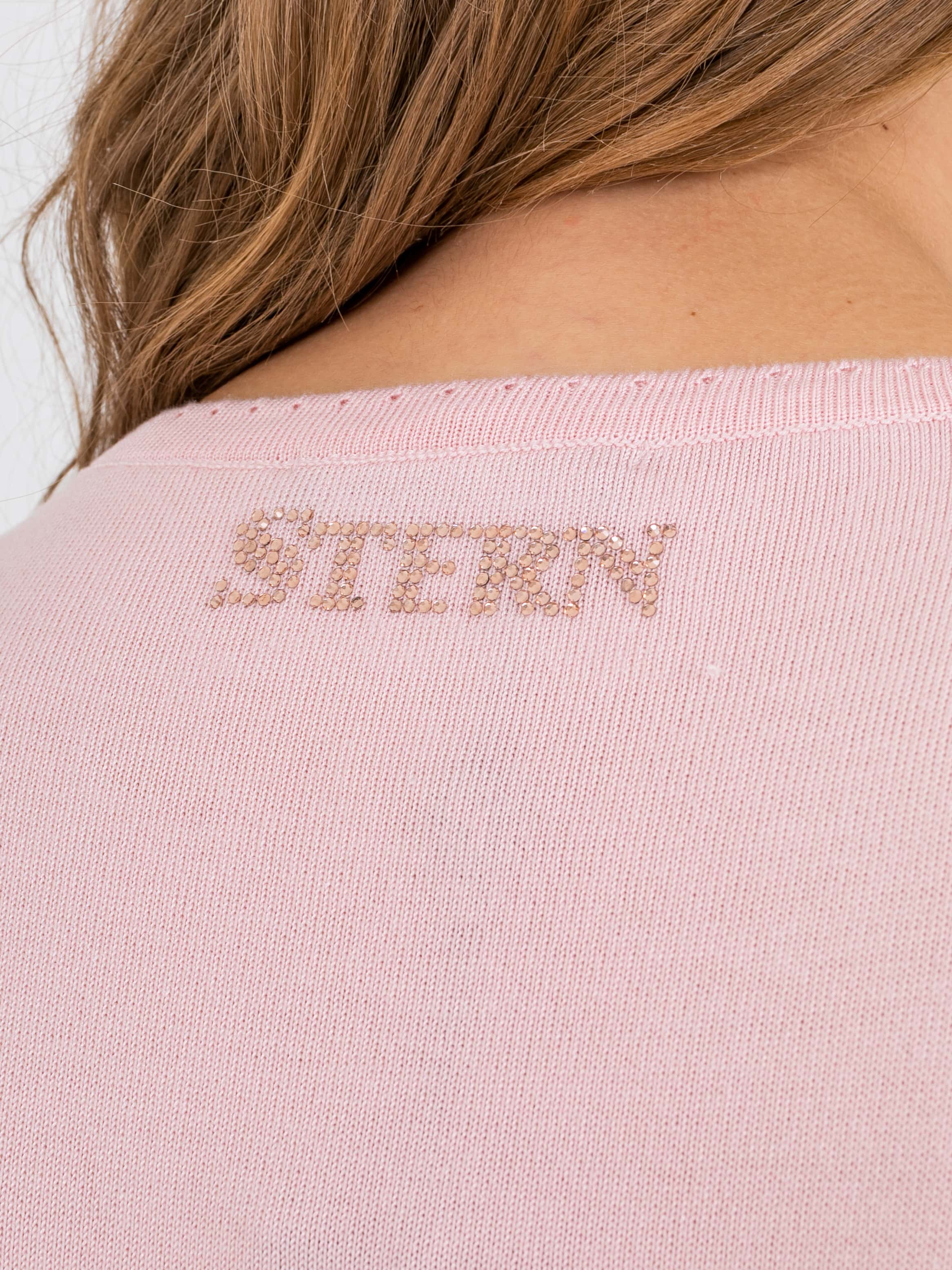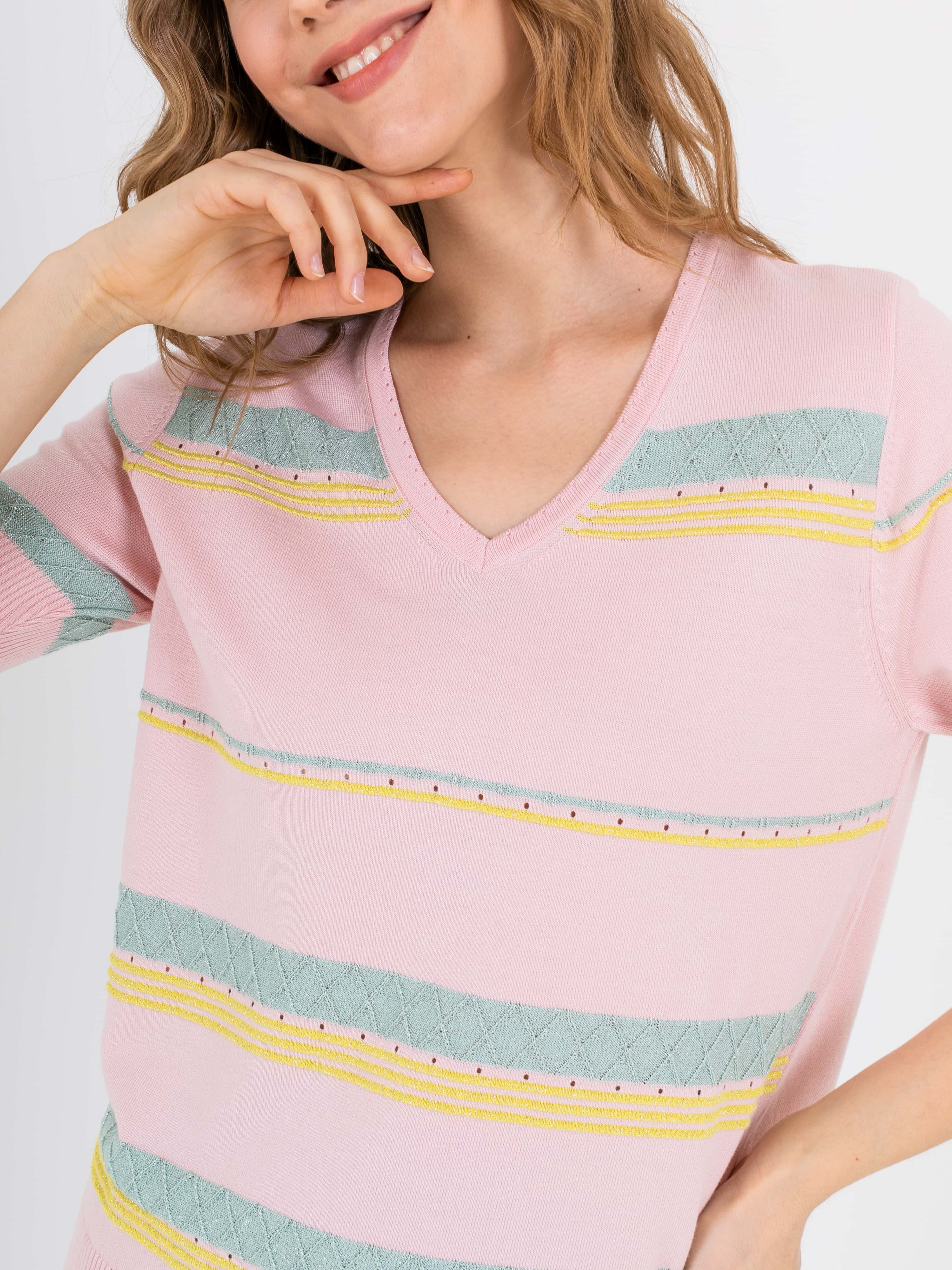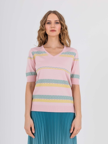 На сайте указаны российские размеры. Джемпер средней длины прямого силуэта из легкой, мягкой вискозы с добавлением люрекса, дизайнерская особенность модели – ажурный трикотаж с геометрическим рисунком. Перед и спинка по низу обработаны манжетой. На спинке аппликация со стразами. Укороченные втачные рукава с манжетами. V-образный вырез горловины.
