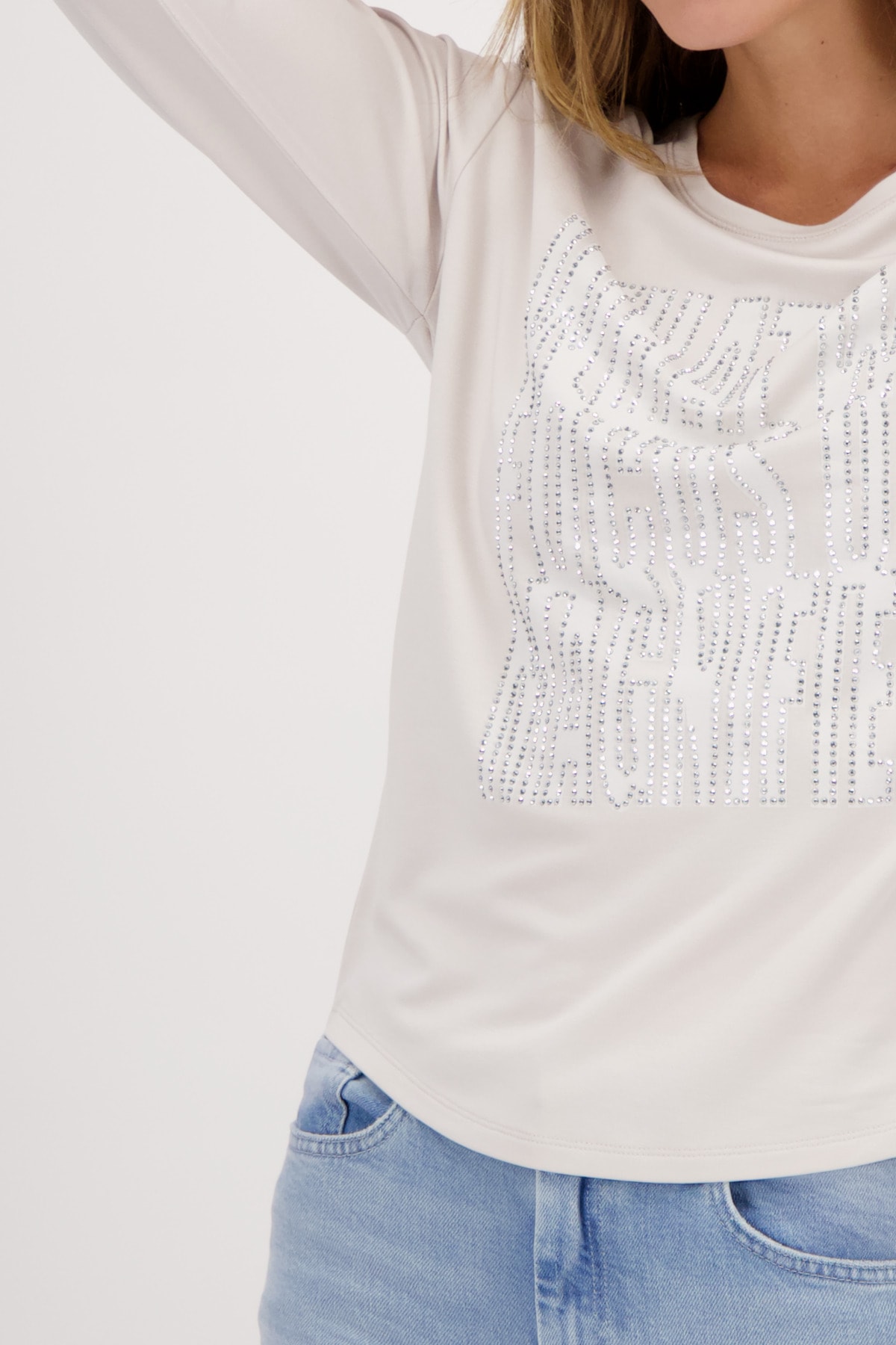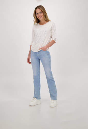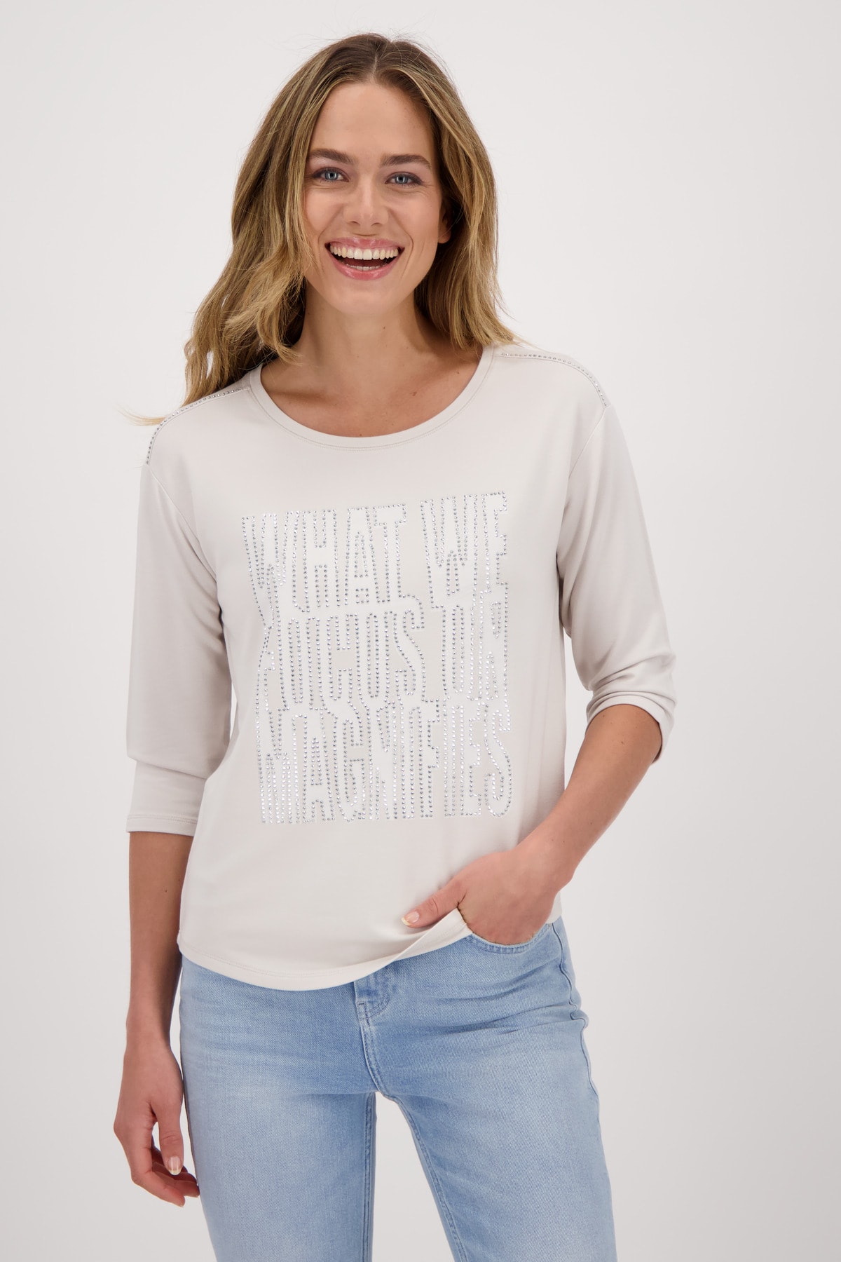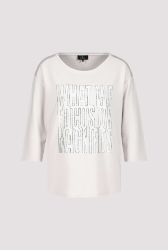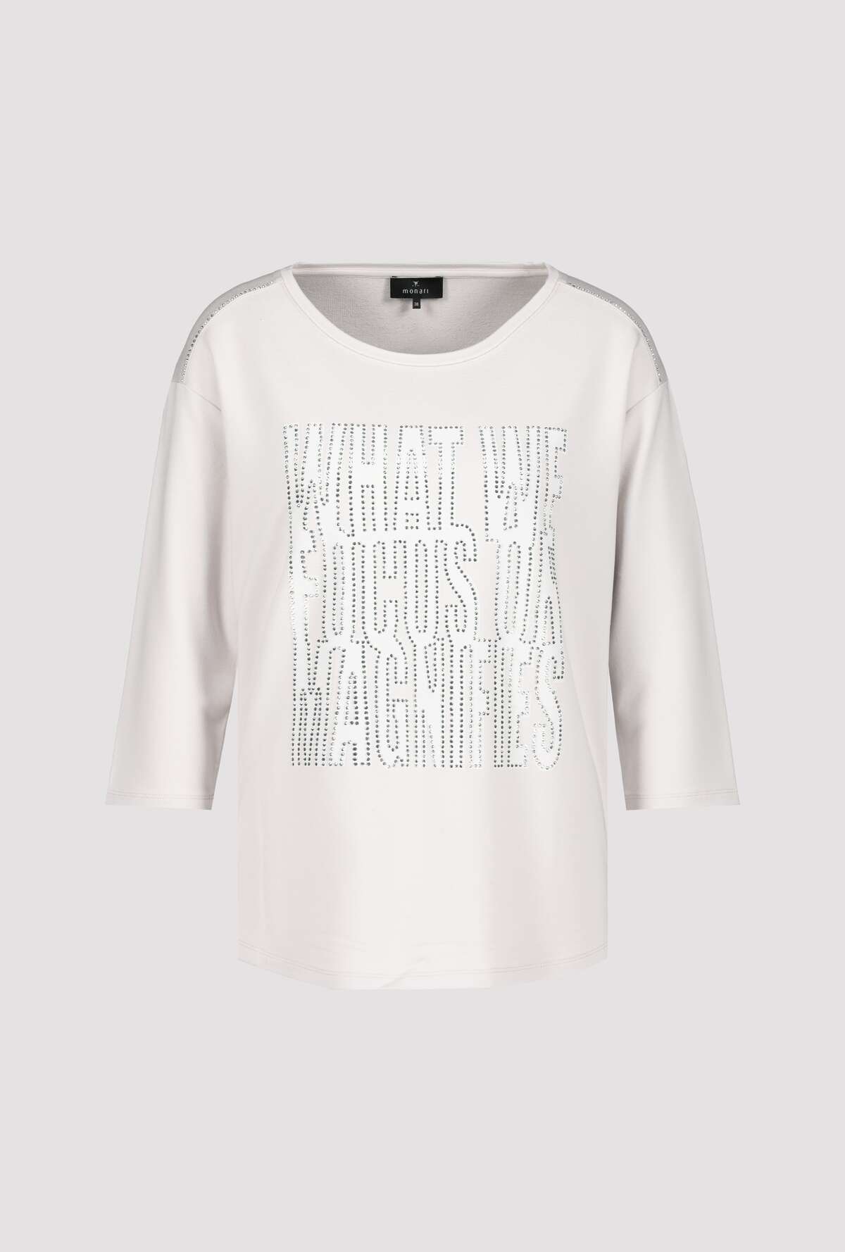 На сайте указаны российские размеры. Трикотажная рубашка от monari изготовлена из вискозы, модала и эластана и поэтому удобна в носке. Рубашка с круглым вырезом источает нотку гламура со стильными надписями из страз и привлекает внимание. Прямой силуэт и рукава 3/4 со слегка приспущенной линией плеч и закругленным низом обещают идеальную посадку на весь день. Будь то в повседневной жизни или в офисе - с этой блестящей рубашкой вы хорошо подготовлены к гламурному внешнему виду. Длина по спинке 44 размера составляет 62 см. Модель ростом 178 см