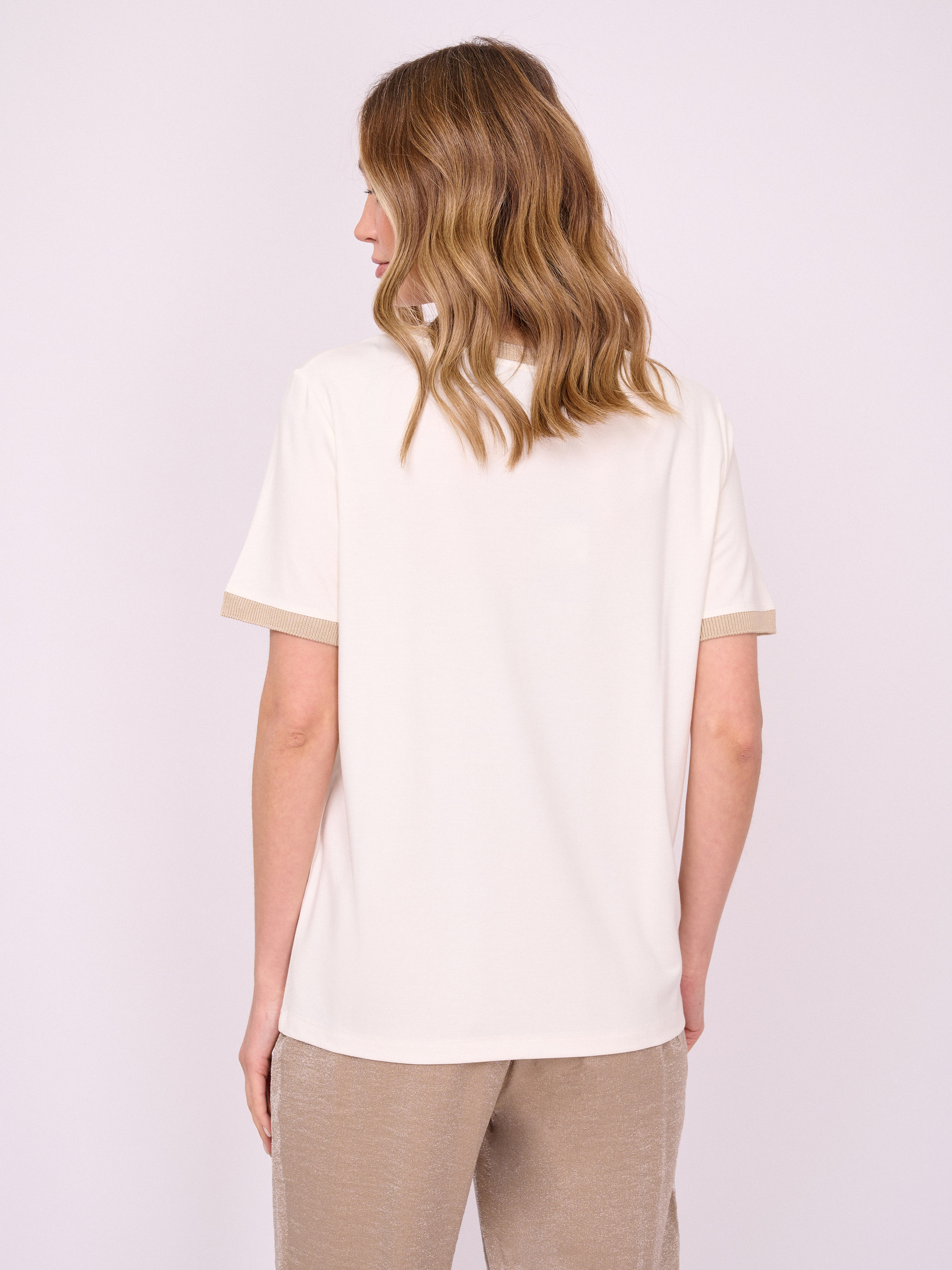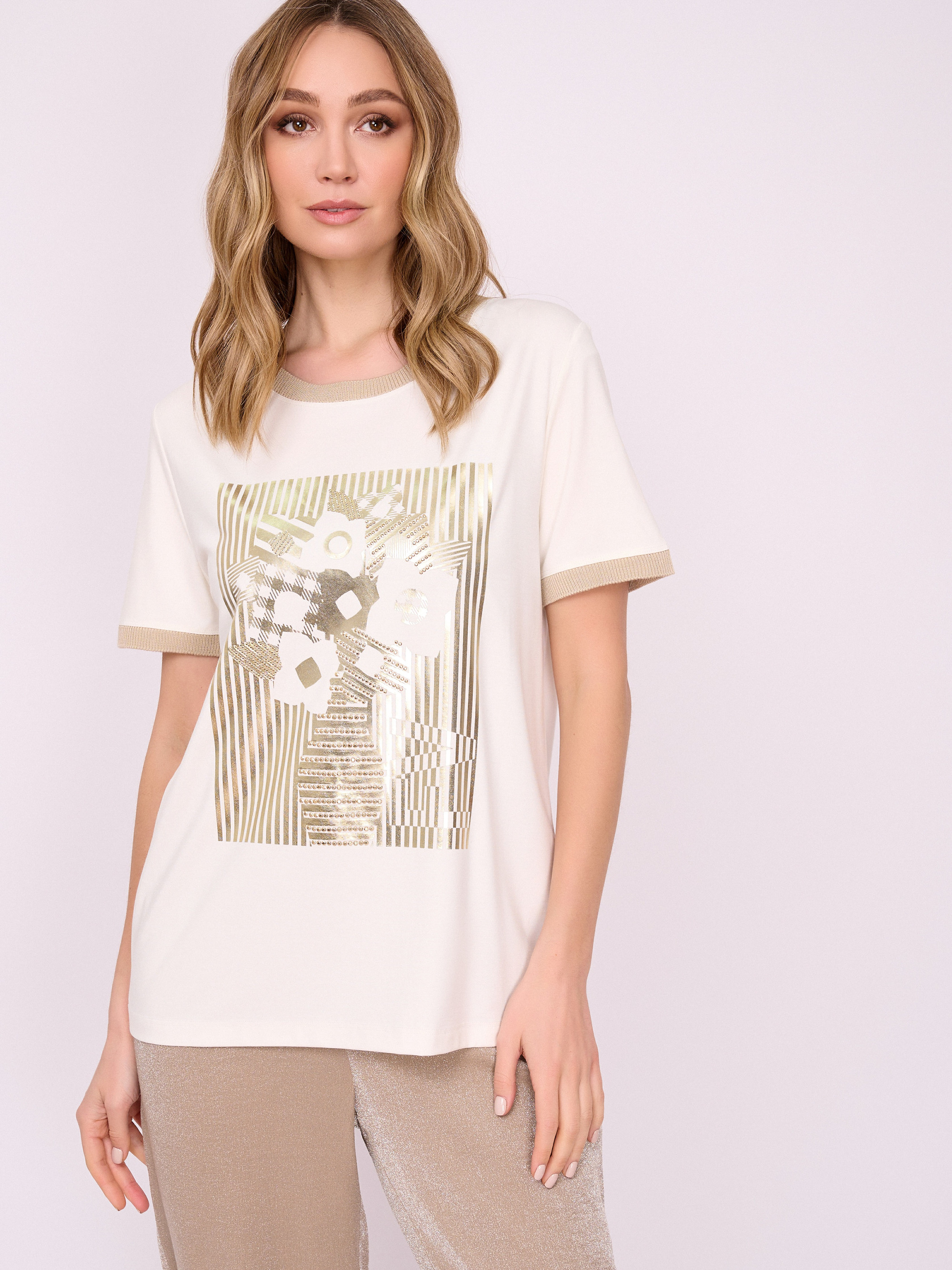 На сайте указаны российские размеры. Трикотажный прямой светло-бежевый джемпер с круглым вырезом, с коротким рукавом, с золотым абстрактным рисунком, со стразами. Длина по спинке: 60 см. Рост модели: 175 см.