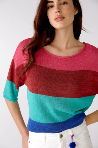 Немецкий бренд. На сайте указаны Российские размеры. Свободный фасон со спущенными плечами и короткими рукавами. Летний вырез-лодочка с закругленными краями. Узкие ребристые манжеты на руке. Закрученный край на кромке.