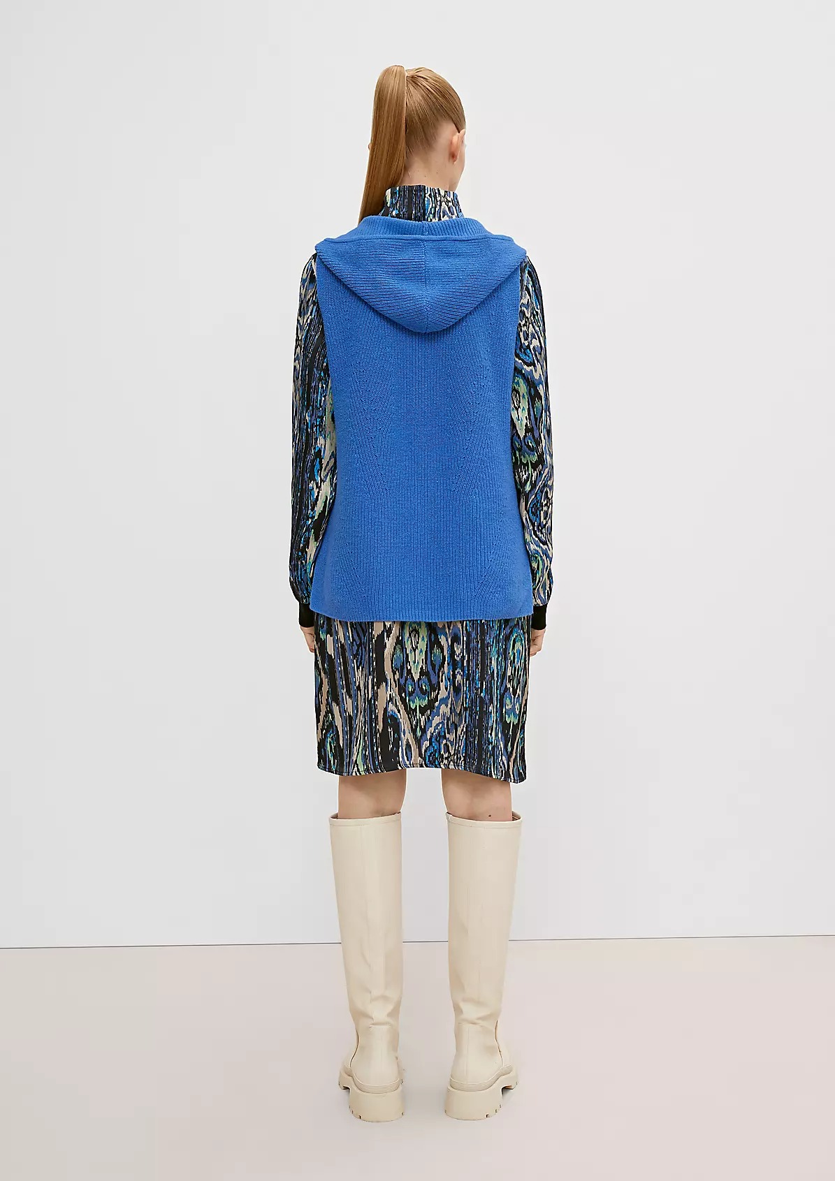 На сайте указаны российские размеры. Трикотажный жилет с капюшоном и удлиненной спинкой. Подол с разрезом сбоку. Застежка на молнию. Длина спины 63 см в размере 42 Рост модели 178 см.