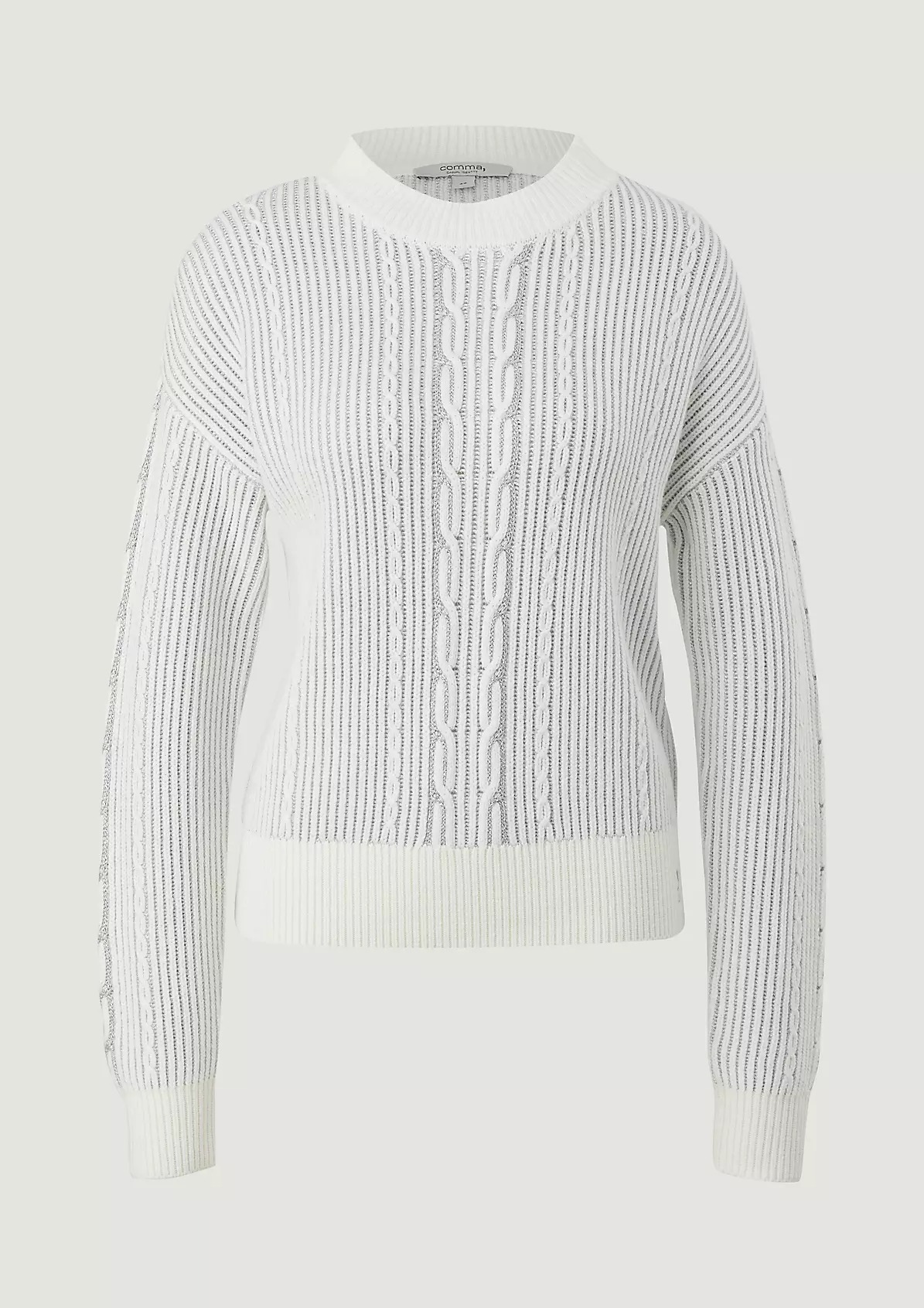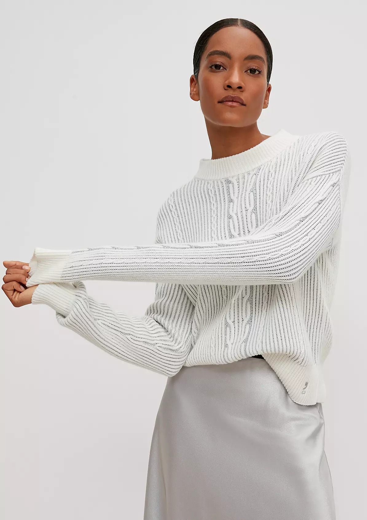 На сайте указаны российские размеры. Вязаный джемпер из смесовой шерсти. Длинные рукава, заниженная линия плеча. Детали: блестящая пряжа, узор спицами. Длина спины 57 см в размере 42 Рост модели 178 см.