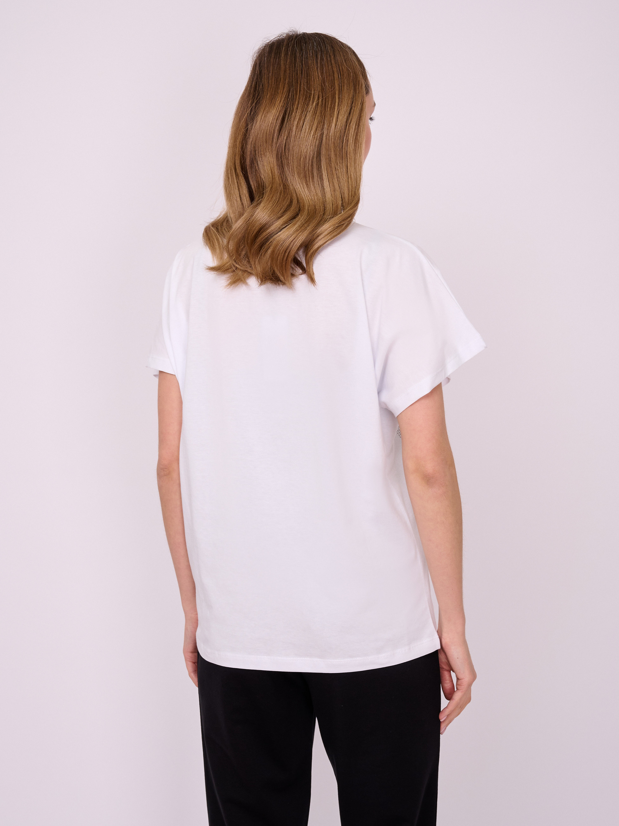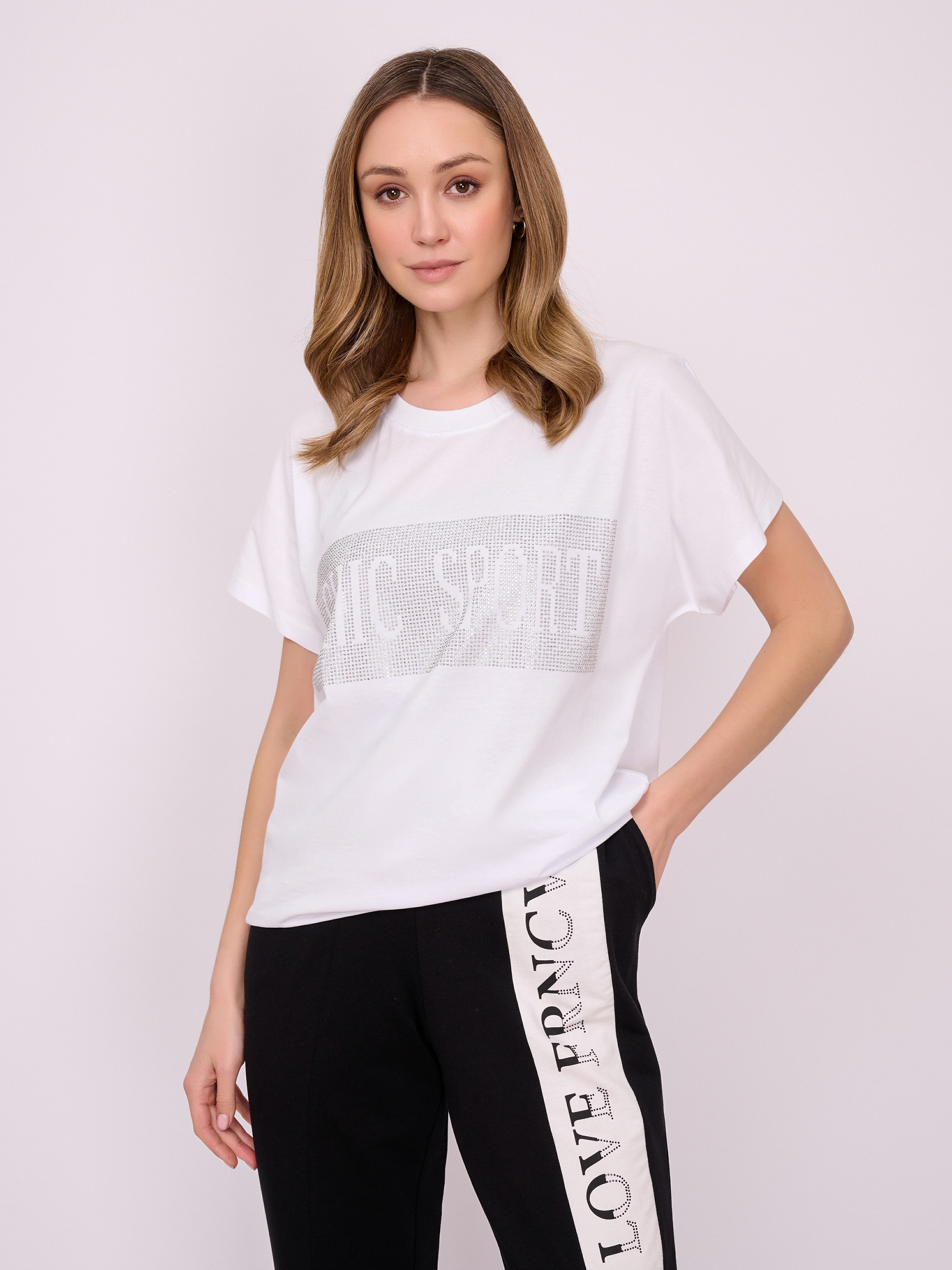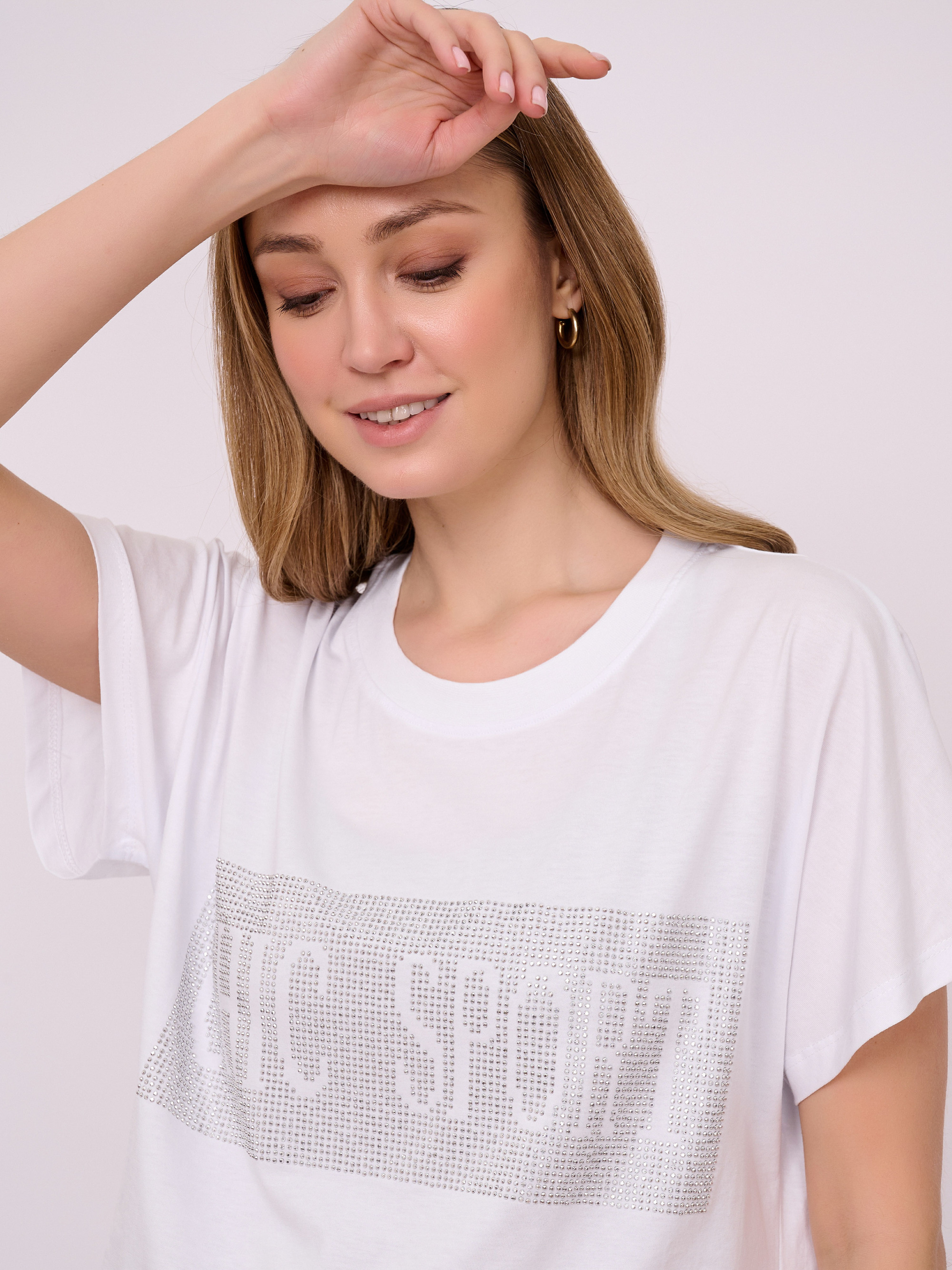 На сайте указаны российские размеры. Трикотажная футболка свободного покроя с короткими цельнокроеными рукавами, украшенная надписью со стразами. Длина по спинке: 63 см. Рост модели 175 см.