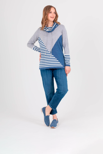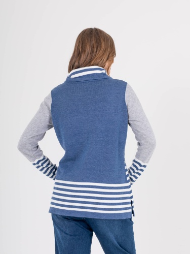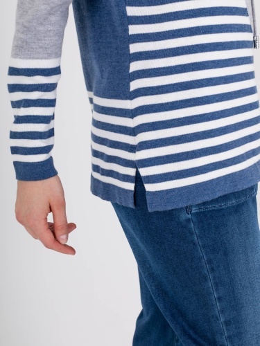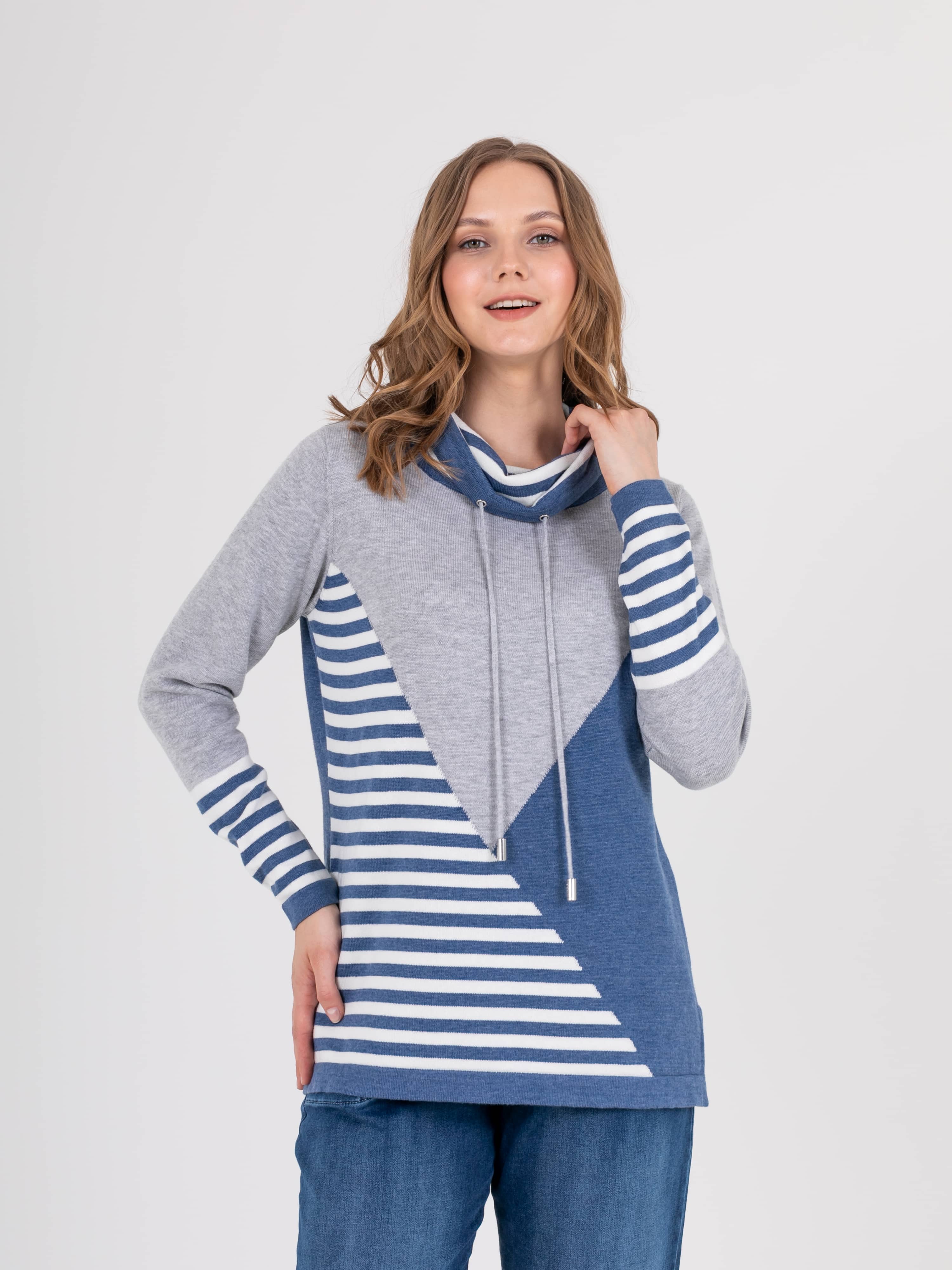Джемпер удлиненный прямого силуэта с разрезами в боковых швах из легкого хлопка с добавлением акрила, дизайнерская особенность модели – геометрический рисунок трикотажа. Длинные втачные рукава. Воротник «хомут» со шнурами и металлическими наконечниками для регулировки прилегания.