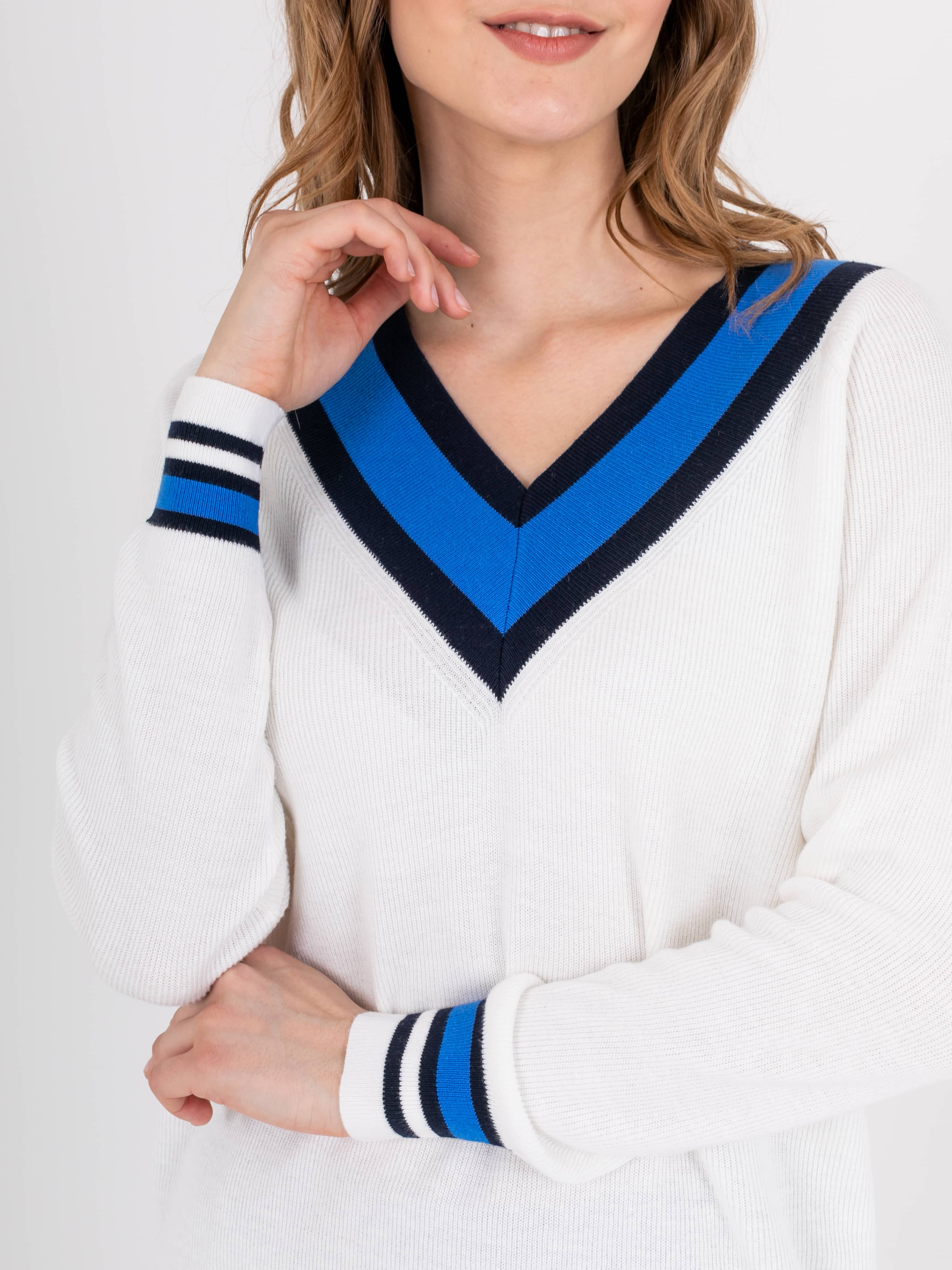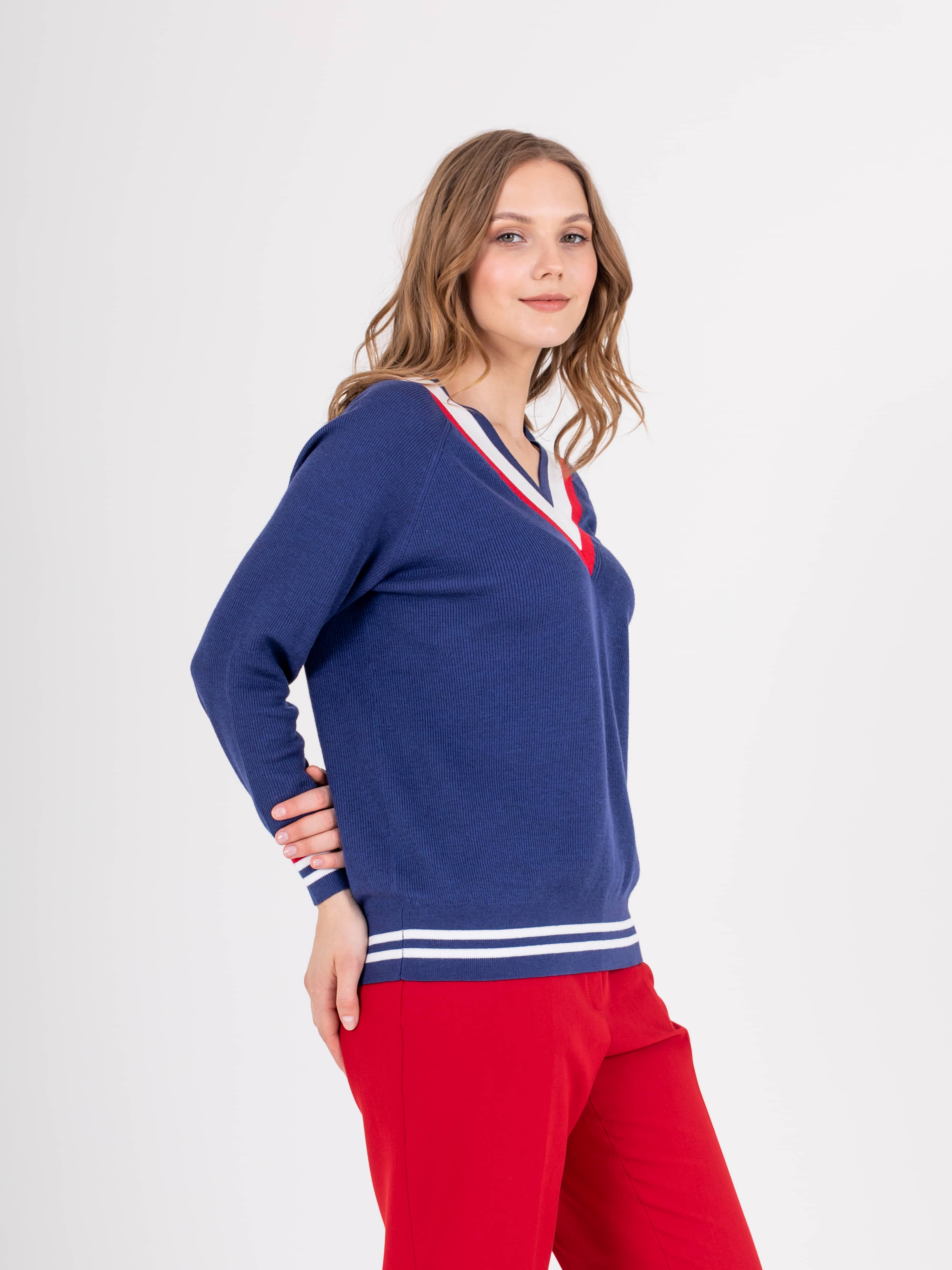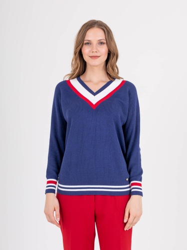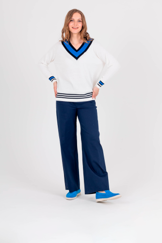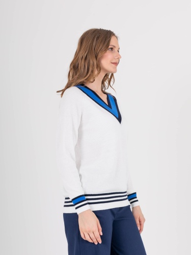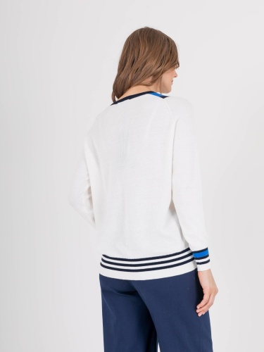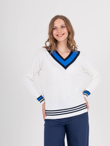 Джемпер средней длины прямого силуэта из легкого хлопка с добавлением акрила, дизайнерская особенность модели – контрастный геометрический рисунок на манжетах и горловине. Перед и спинка по низу обработаны манжетой. Длинные рукава реглан с манжетами. V-образный вырез горловины.