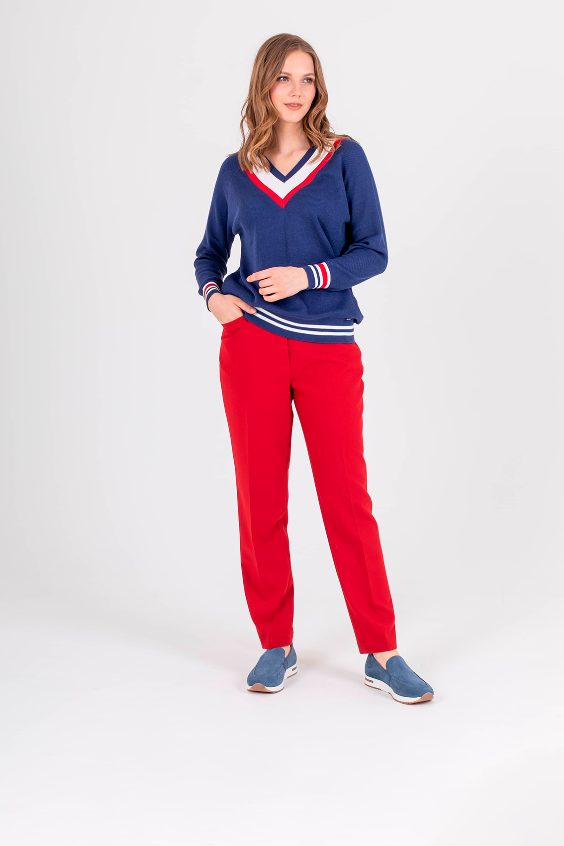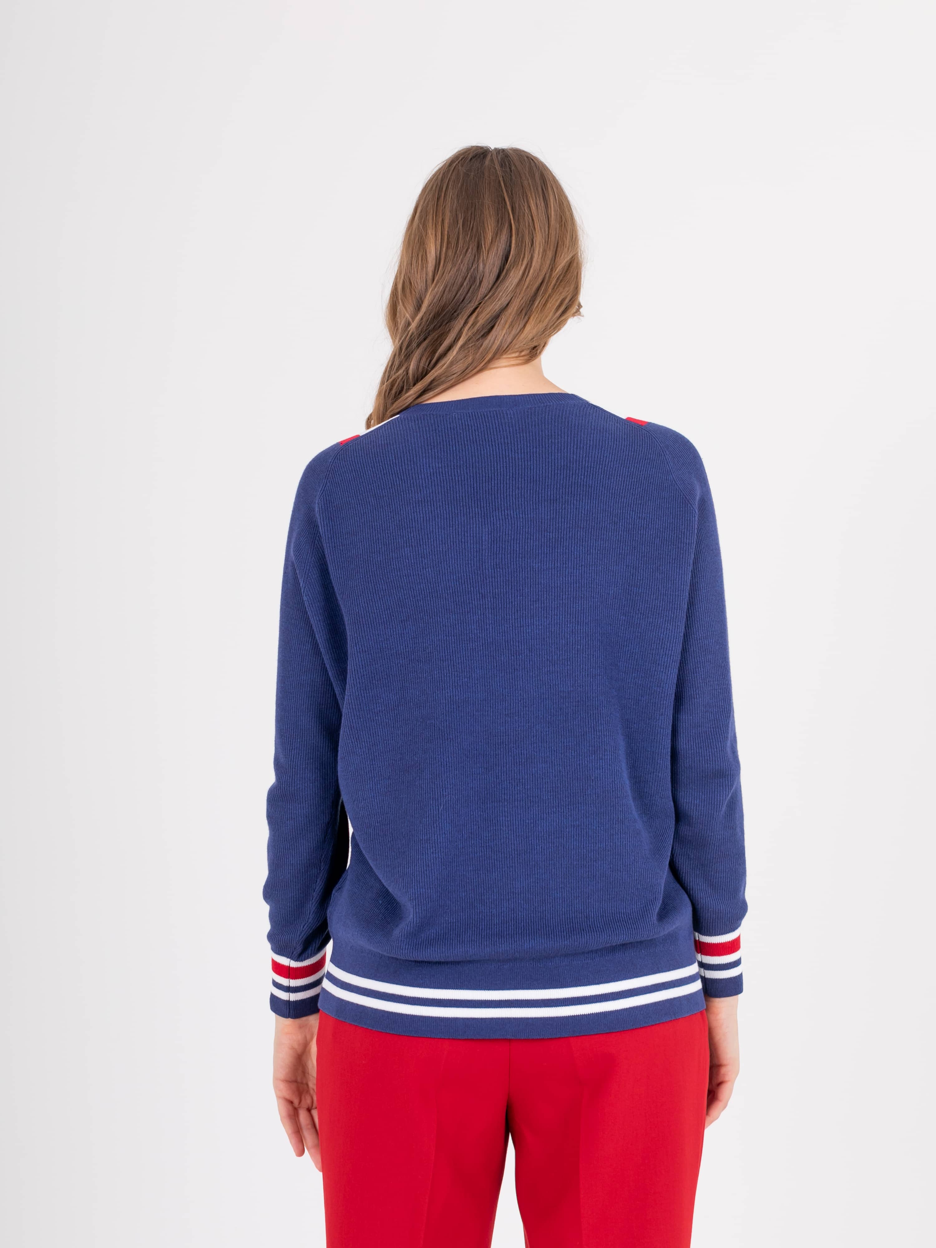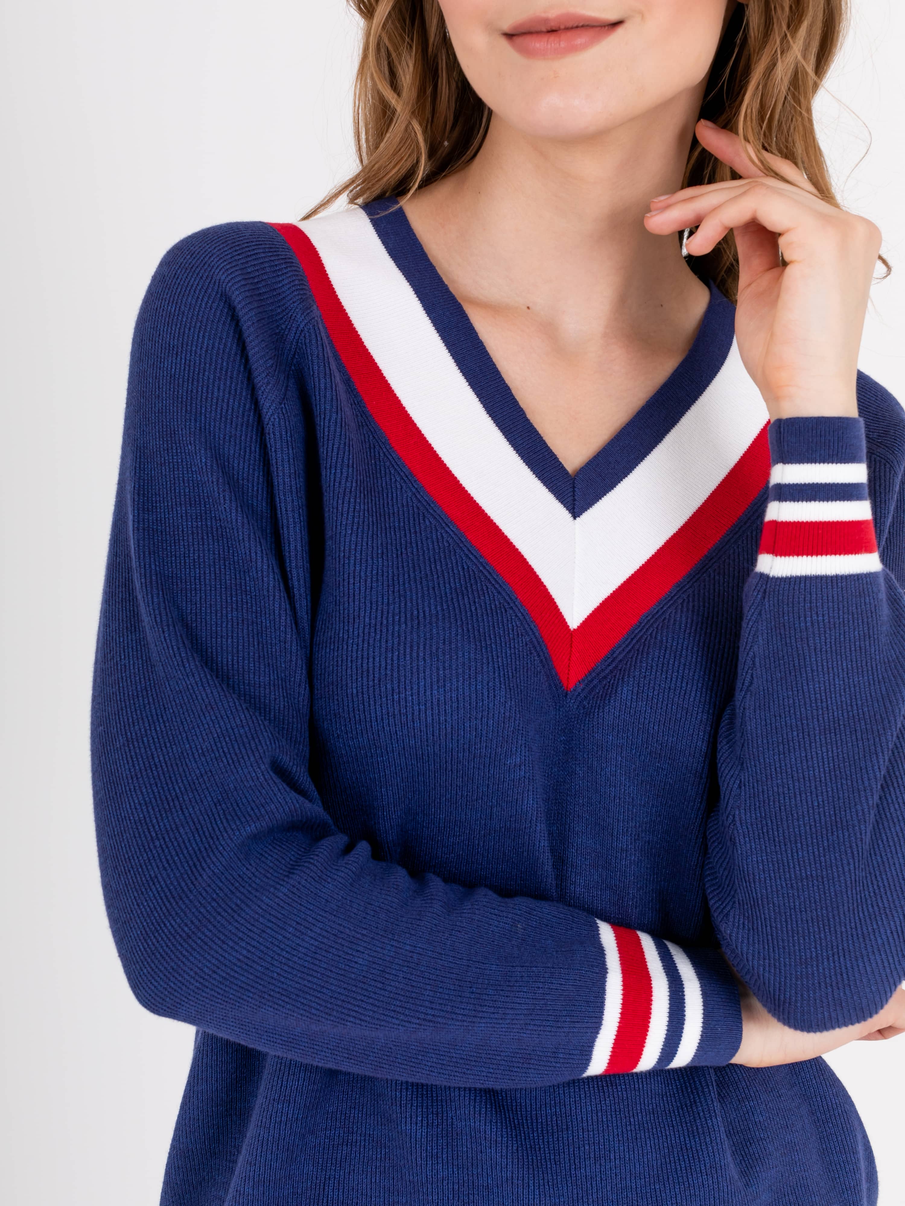Джемпер средней длины прямого силуэта из легкого хлопка с добавлением акрила, дизайнерская особенность модели – контрастный геометрический рисунок на манжетах и горловине. Перед и спинка по низу обработаны манжетой. Длинные рукава реглан с манжетами. V-образный вырез горловины.