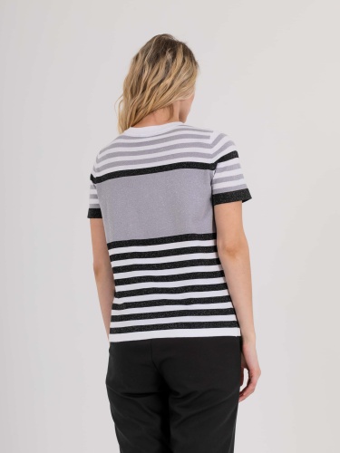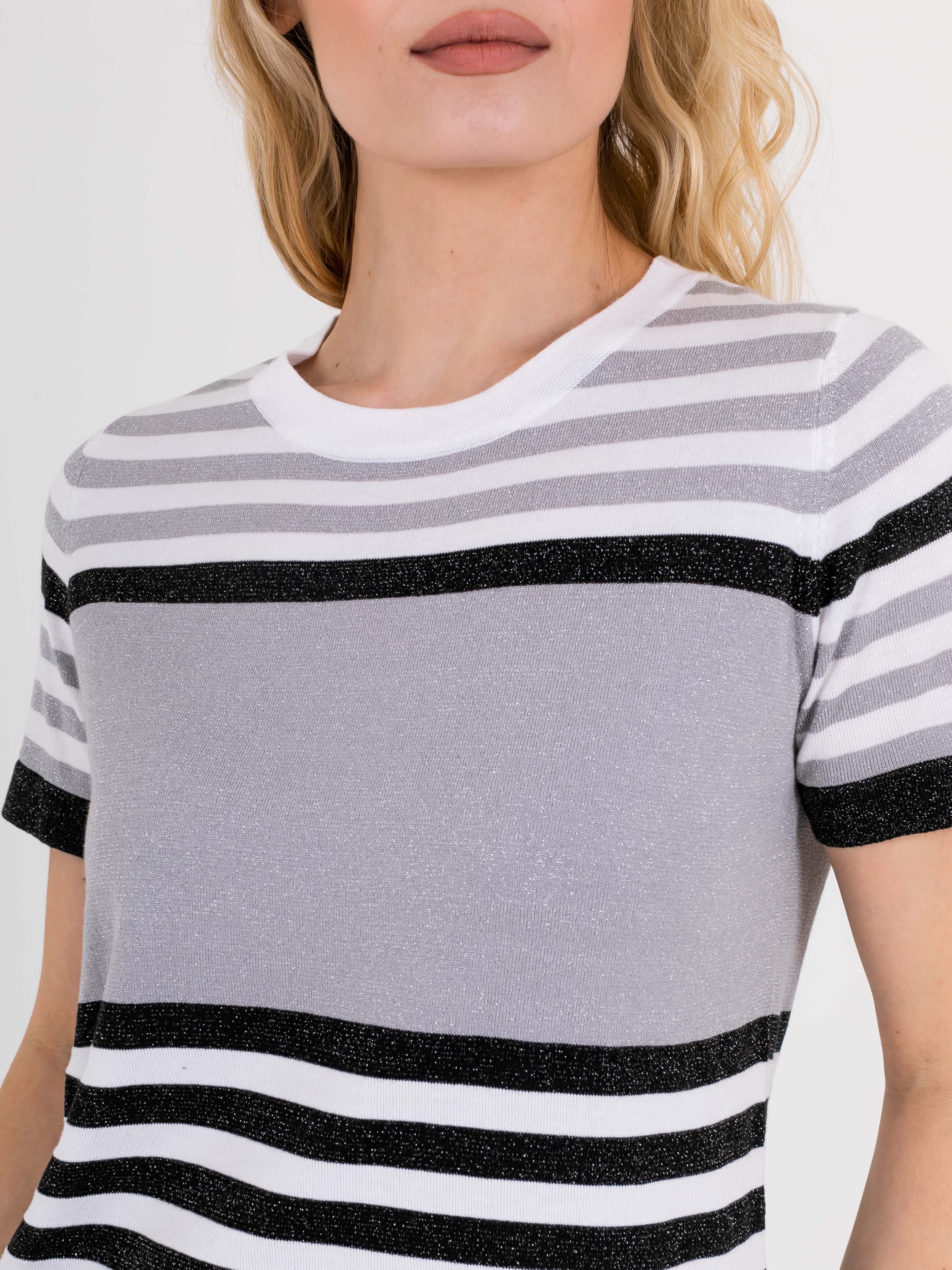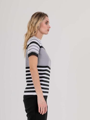 Футболка средней длины прямого силуэта из мягкой вискозы с добавлением легкого хлопка и люрекса, дизайнерская особенность модели – рисунок в полоску. Укороченные втачные рукава. Круглый вырез горловины.