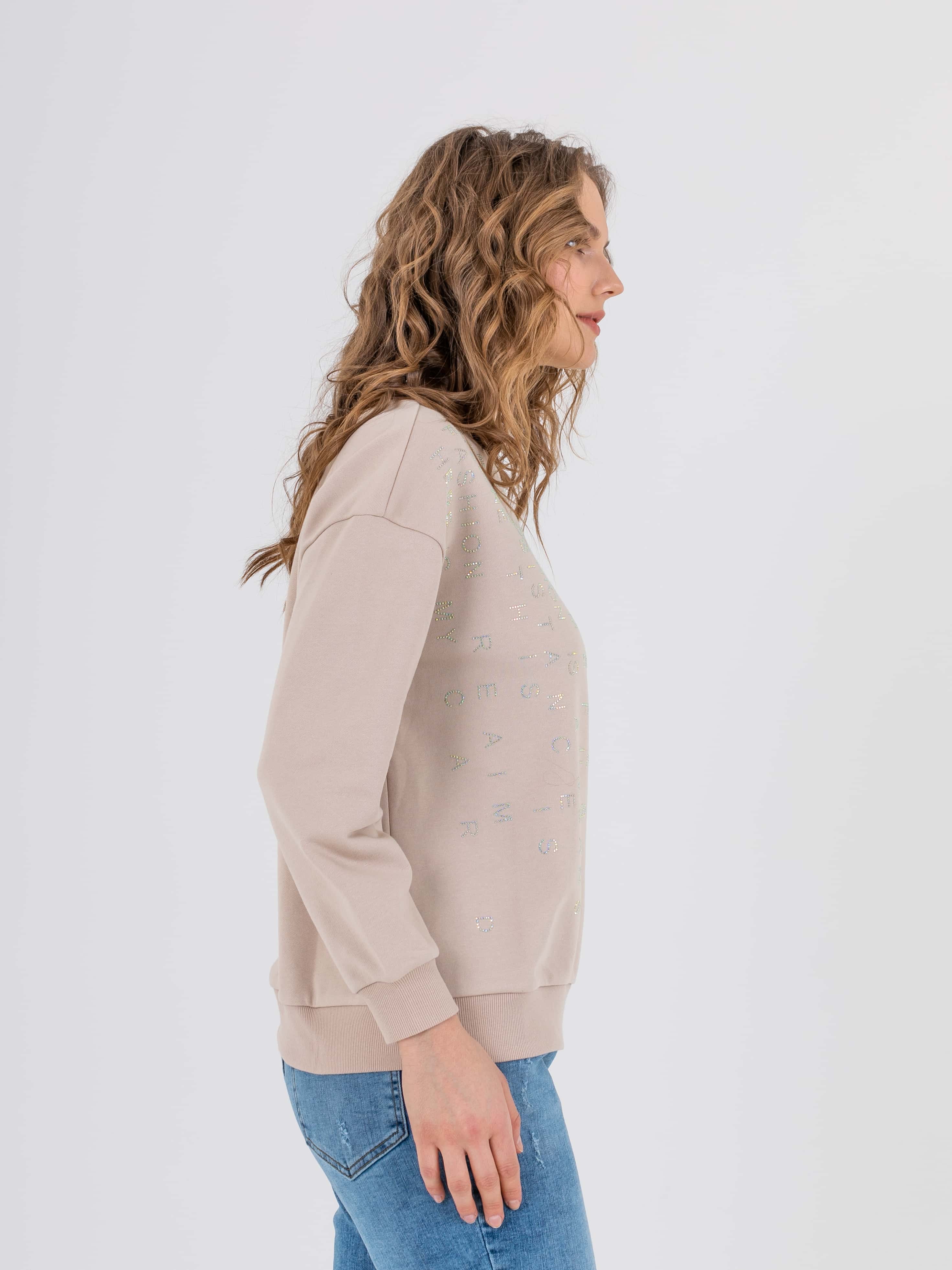 Свитшот прямого силуэта средней длины из легкого хлопка с добавлением полиэстера. Перед и спинка по низу обработаны манжетой. Перед украшен аппликациями в виде надписей из страз. Длинные втачные рукава со спущенной линией плеча и манжетами. Круглый вырез горловины.