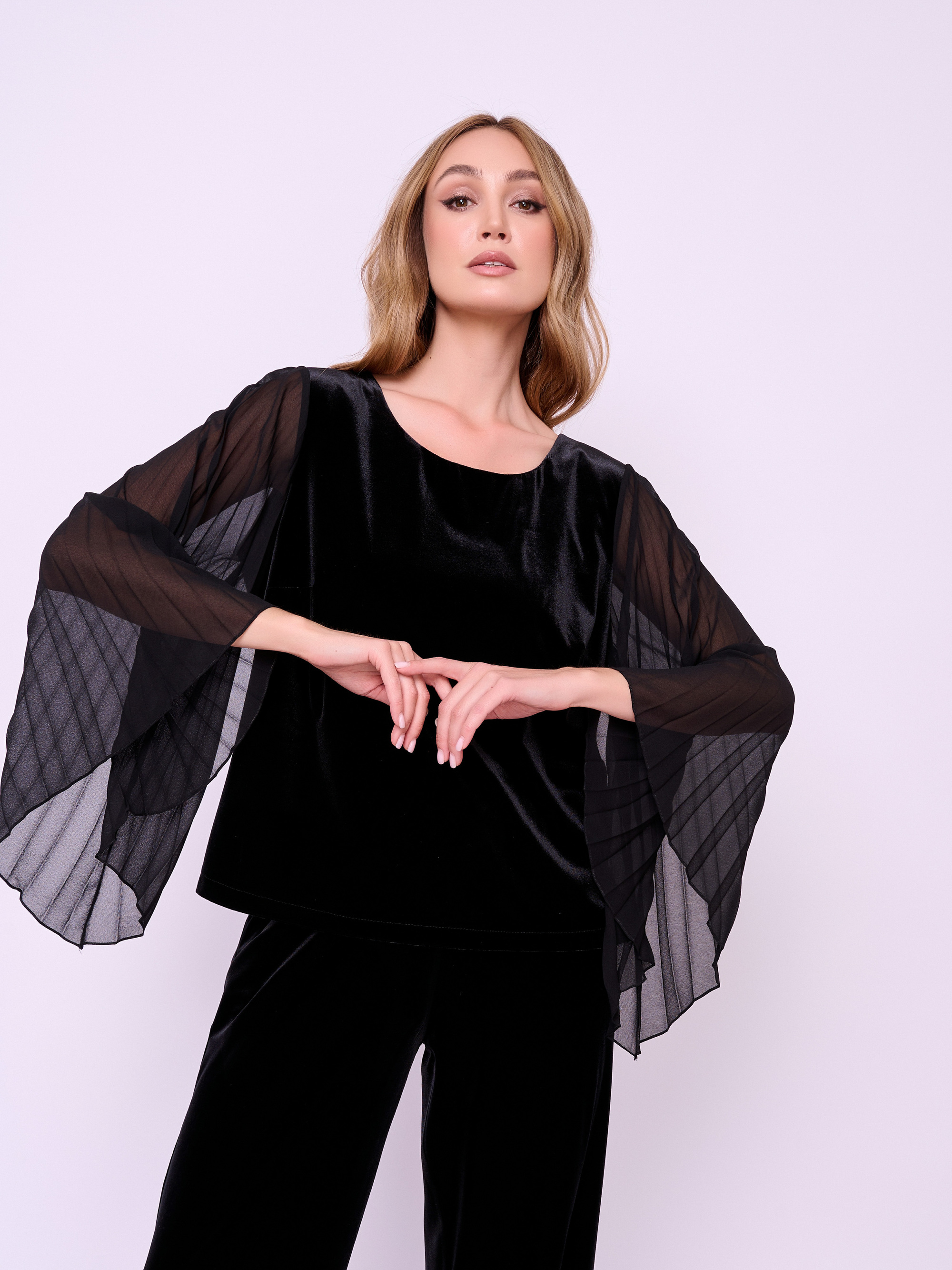 Комбинированная блуза из бархатного трикотажа с плиссированными рукавами асимметричного кроя из шифона, округлой горловиной и боковыми разрезами. Длина по спинке: 56 см.