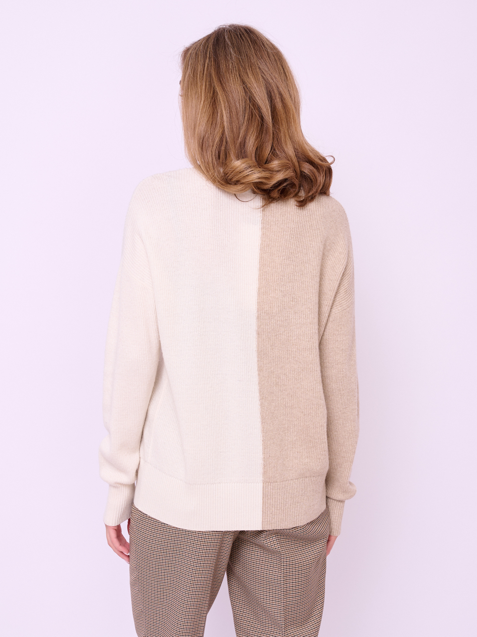 Пуловер прямого покроя в стиле «колор блок» из смесовой шерсти и кашемира с V-образным вырезом горловины, длинными рукавами-реглан и рисунком «косы». Длина по спине: 63 см.