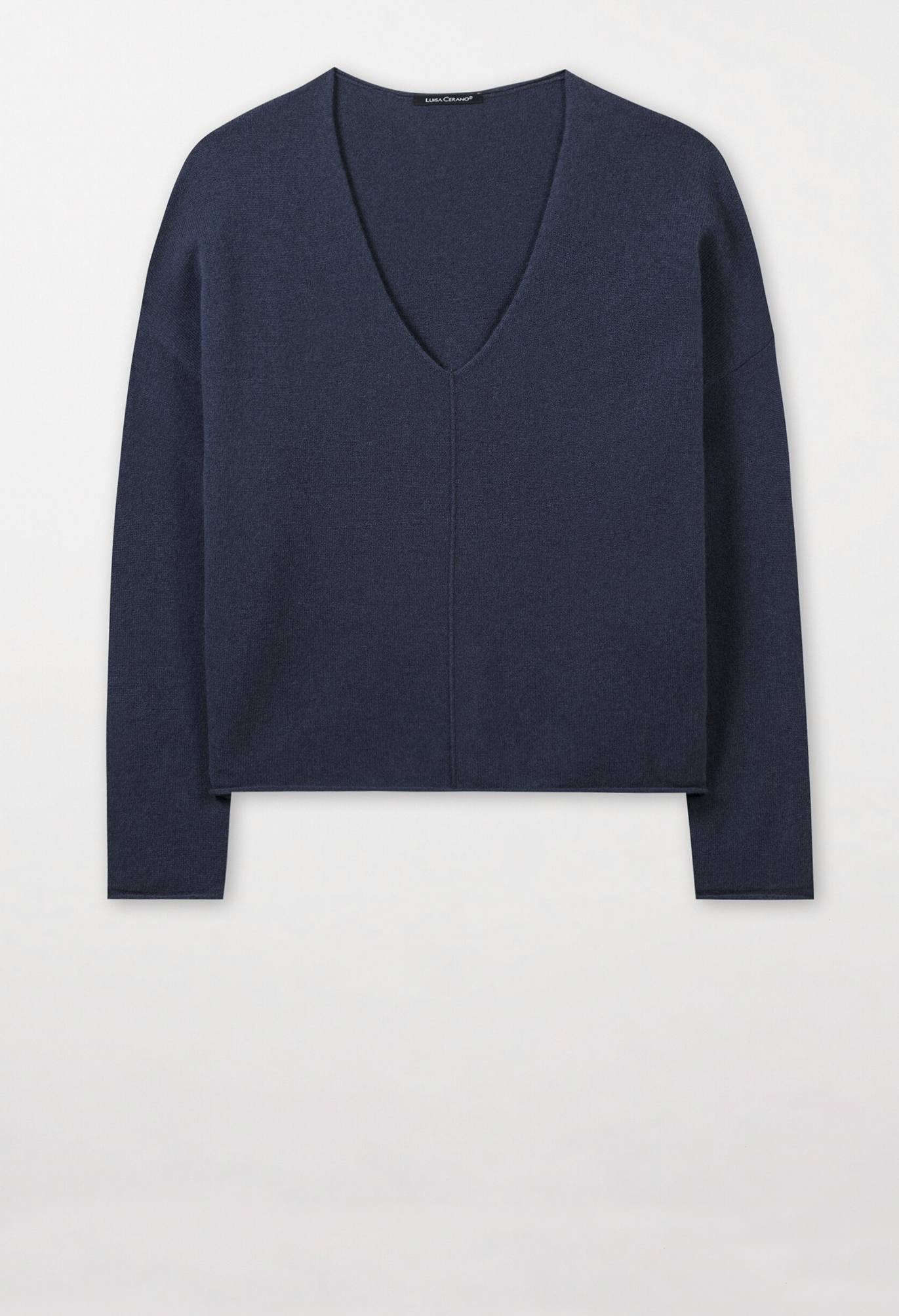 Пуловер в мелкую крапинку из тонкого смесового кашемира. V-образный вырез, заниженная линия плеча, декоративный центральный шов и закругленный низ подчеркивают утонченный дизайн.