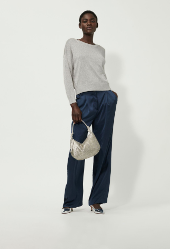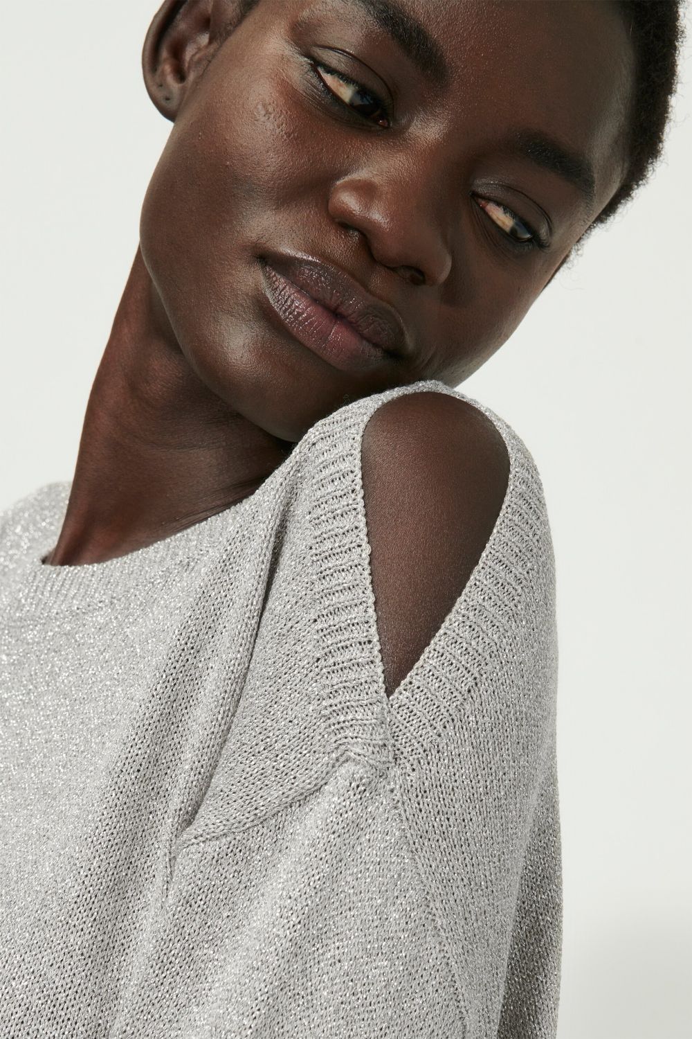 Повседневный свитер с приспущенными плечами и изысканным вырезом. Металлизированная переливающаяся ленточная пряжа придает этому свитеру гламурный вид.