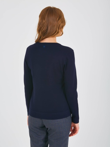 Джемпер средней длины полуприлегающего силуэта из мягкой вискозы с добавлением нейлона, дизайнерская особенность модели – небольшие нашивки по переду и спинке. Перед и спинка по низу обработаны манжетой. Длинные втачные рукава с манжетами. Круглый вырез горловины.