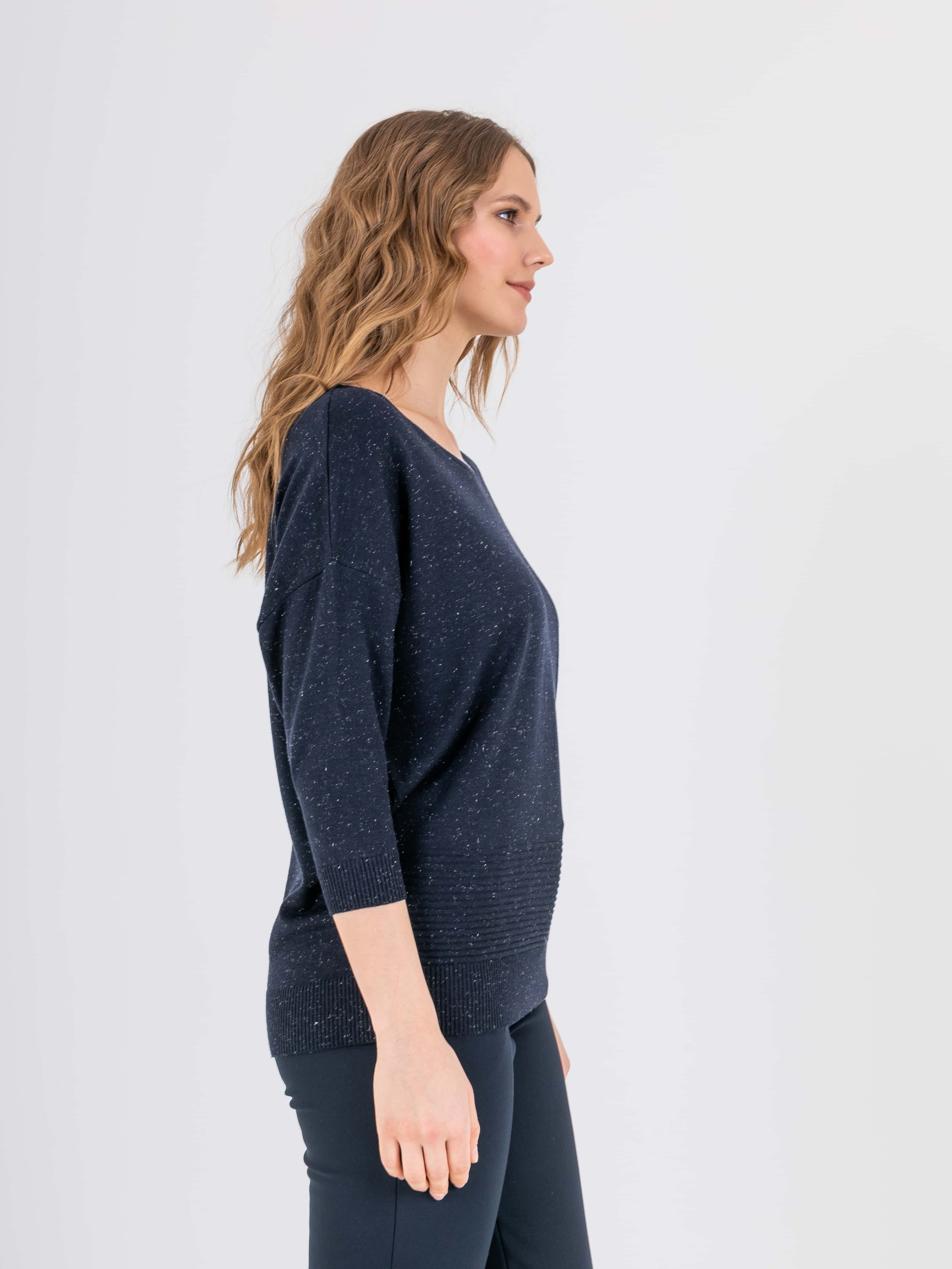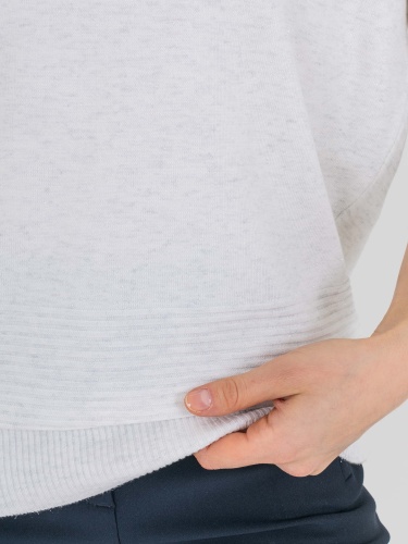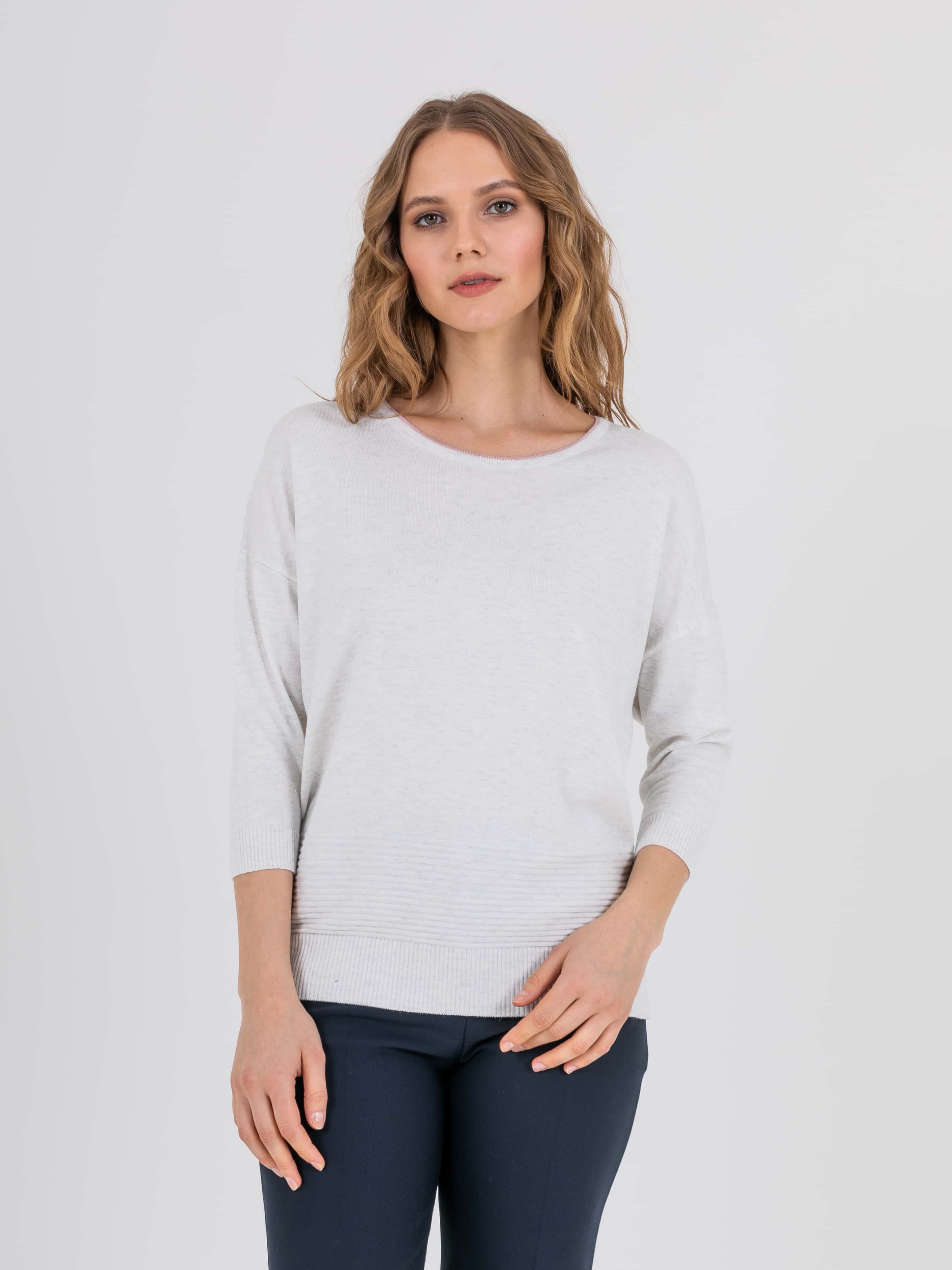 Джемпер прямого силуэта средней длины из мягкой вискозы с добавлением эластана и люрекса. Перед и спинка по низу обработаны манжетой. Перед выполнен из фактурного трикотажа. По спинке расположен нежный рисунок в виде звезды. Рукава втачные ¾ со спущенной линией плеча и манжетами. Круглый вырез горловины.