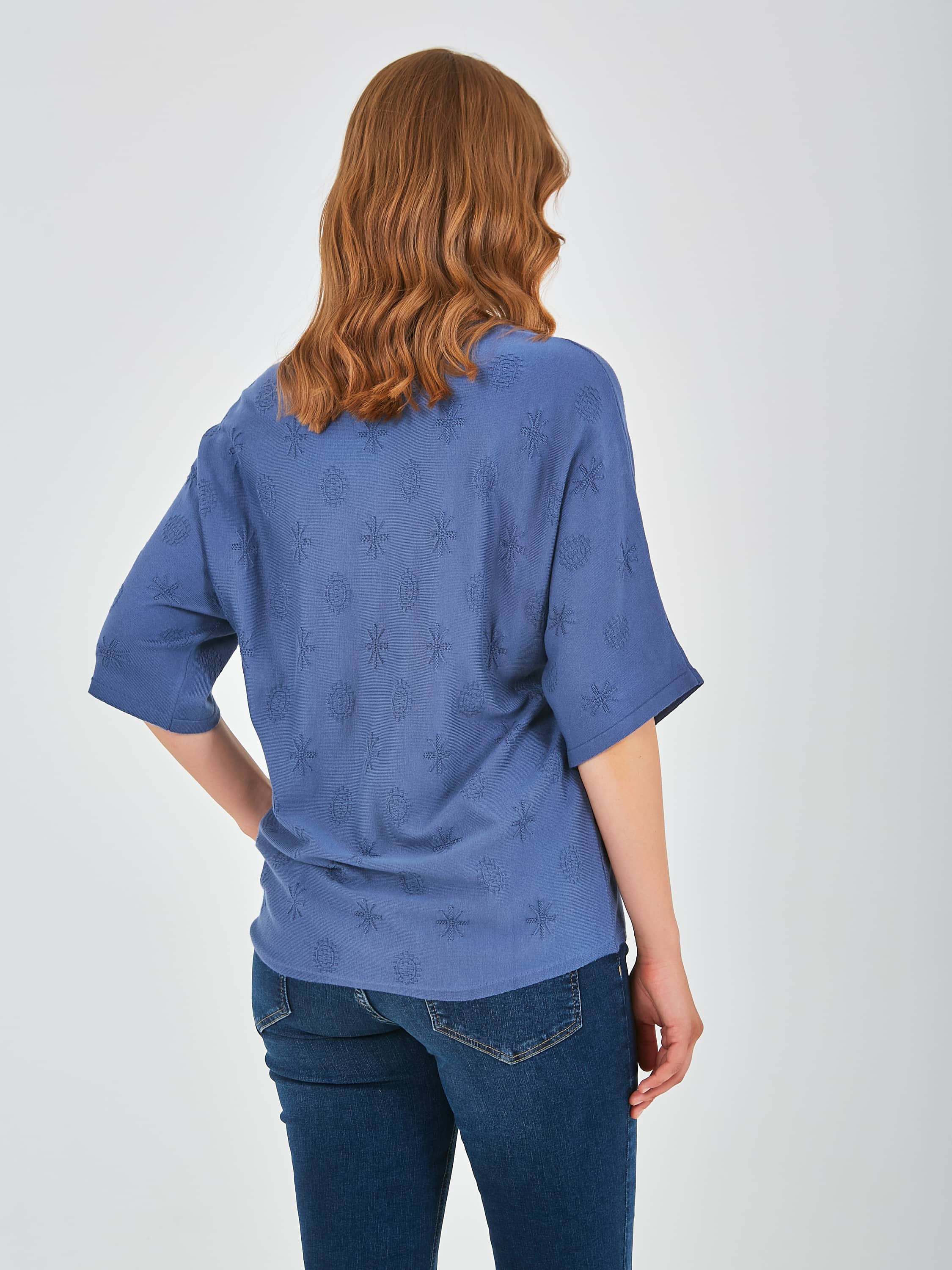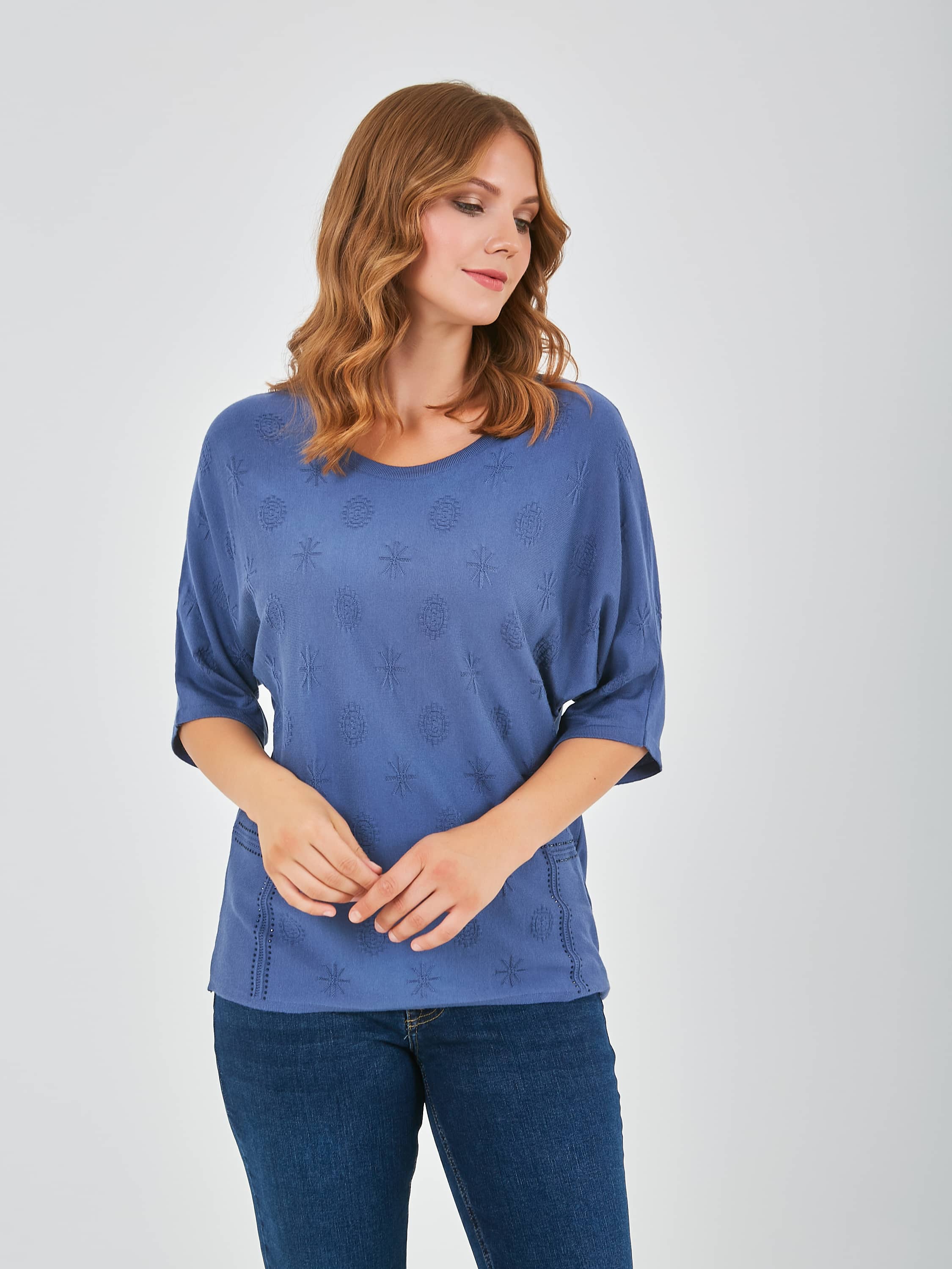 Джемпер средней длины прямого силуэта из мягкой вискозы с добавлением эластана, дизайнерская особенность модели – ажурный трикотаж с имитацией карманов и стразами. Цельнокроеные рукава до локтя. Круглый вырез горловины.