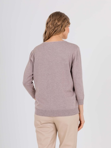 Джемпер средней длины прямого силуэта из мягкой вискозы с добавлением эластана. Перед и спинка по низу обработаны манжетой. По переду выполнен нежный тропический рисунок со стразами. Удлиненные втачные рукава со спущенной линией плеча и манжетами. V–образный вырез горловины.