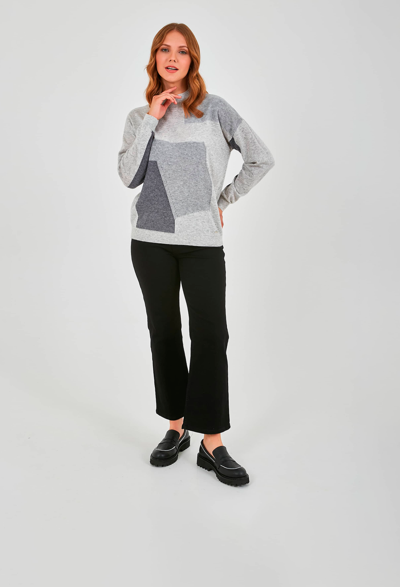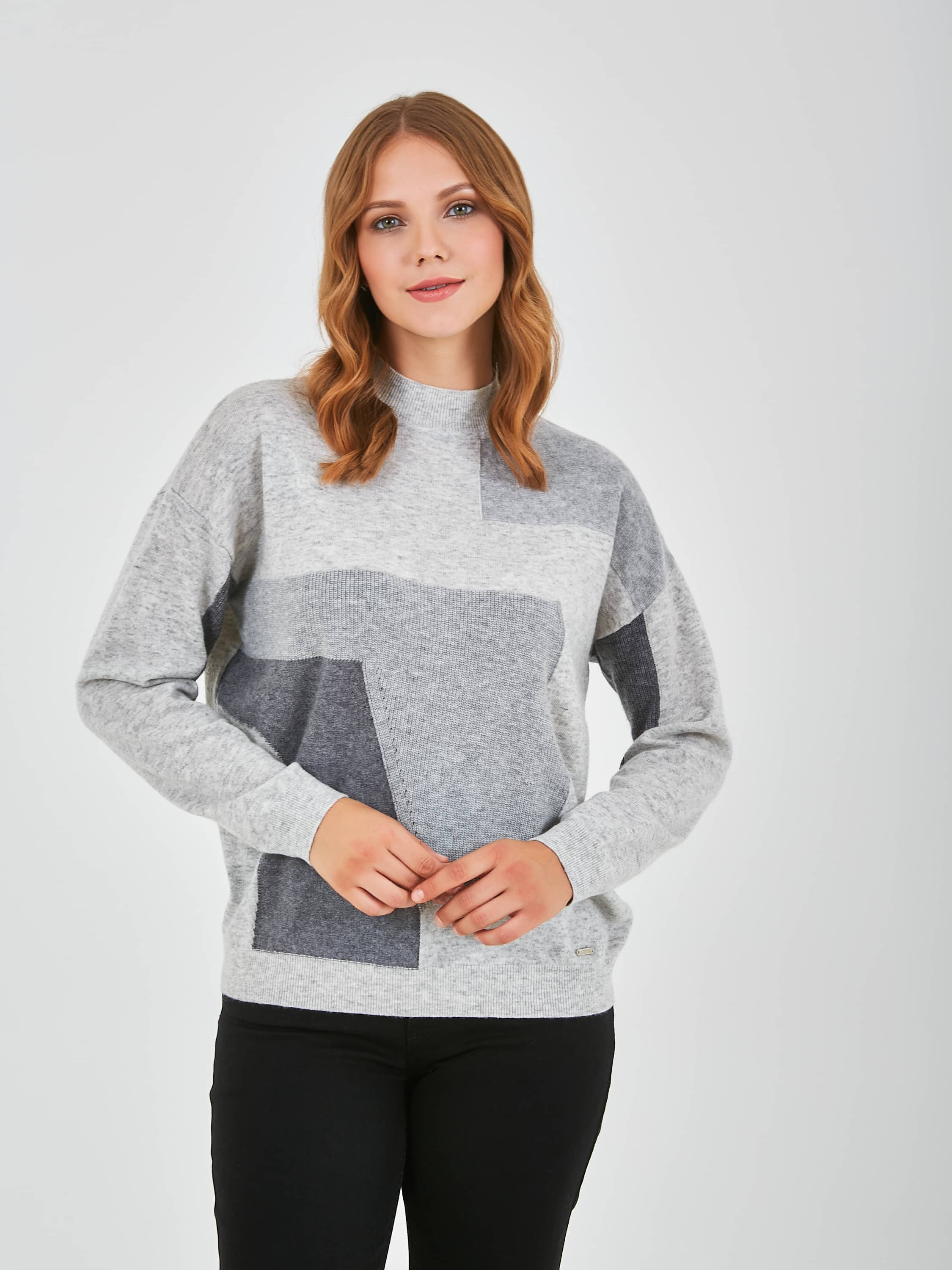 Джемпер средней длины прямого силуэта из мягкой шерсти с добавлением полиэстера и нейлона, дизайнерская особенность модели – геометрический рисунок и перфорированный трикотаж. Перед и спинка по низу обработаны манжетой. Длинные втачные рукава со спущенной линией плеча и манжетами. Воротник стойка.