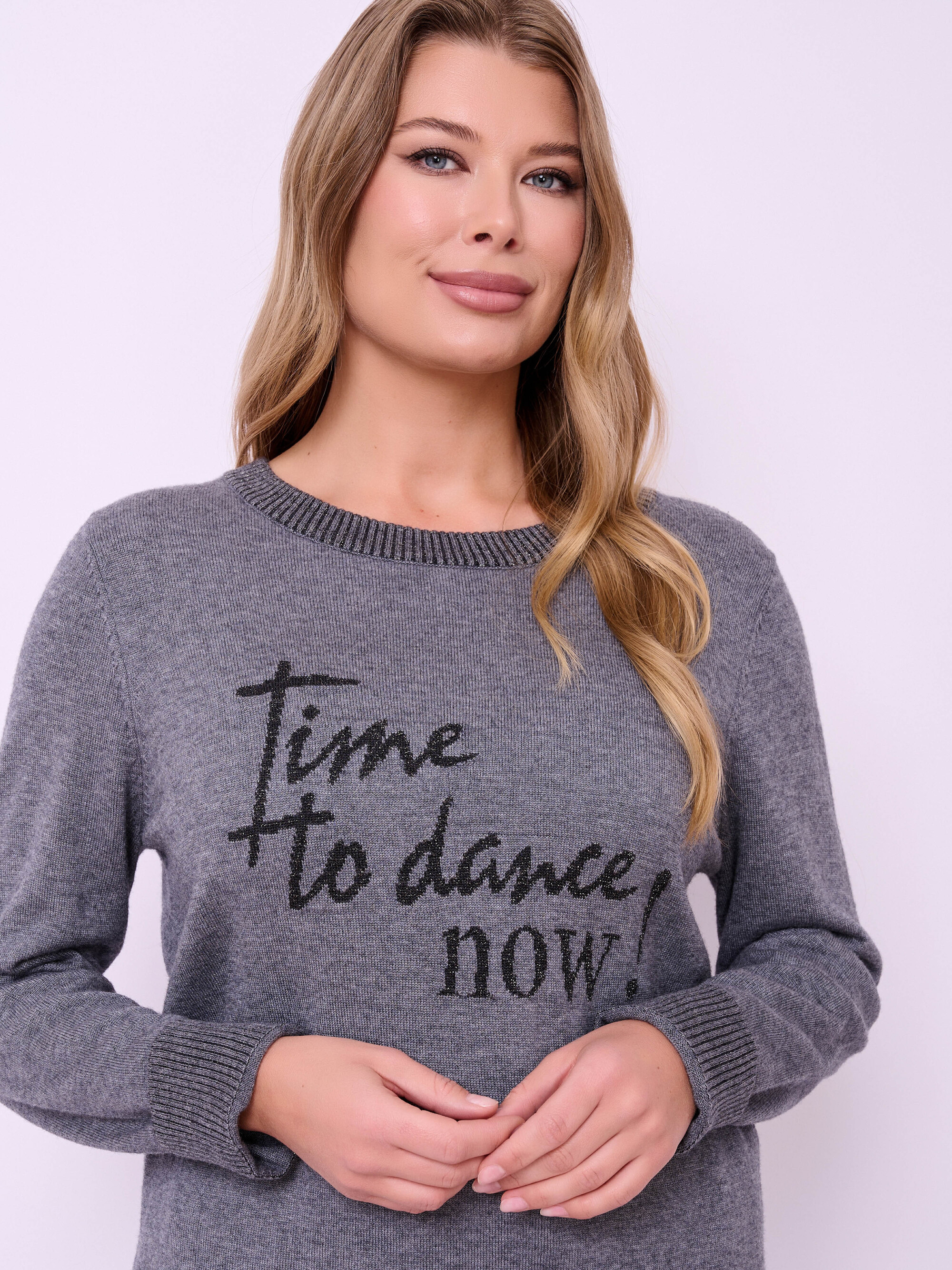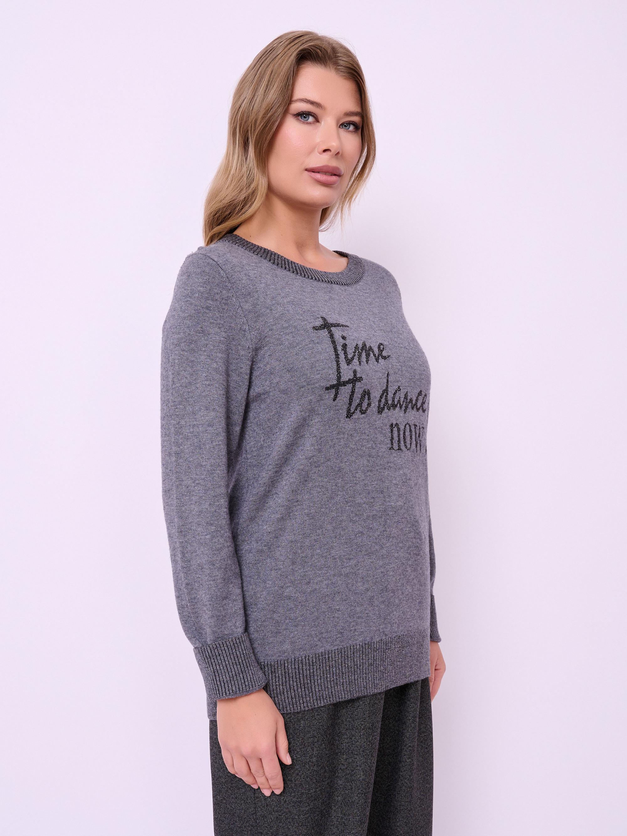 Джемпер трикотажный из смесовой шерсти прямого покроя с округлой горловиной, длинными рукавами и надписью из люрекса на груди. Длина по спинке: 66 см