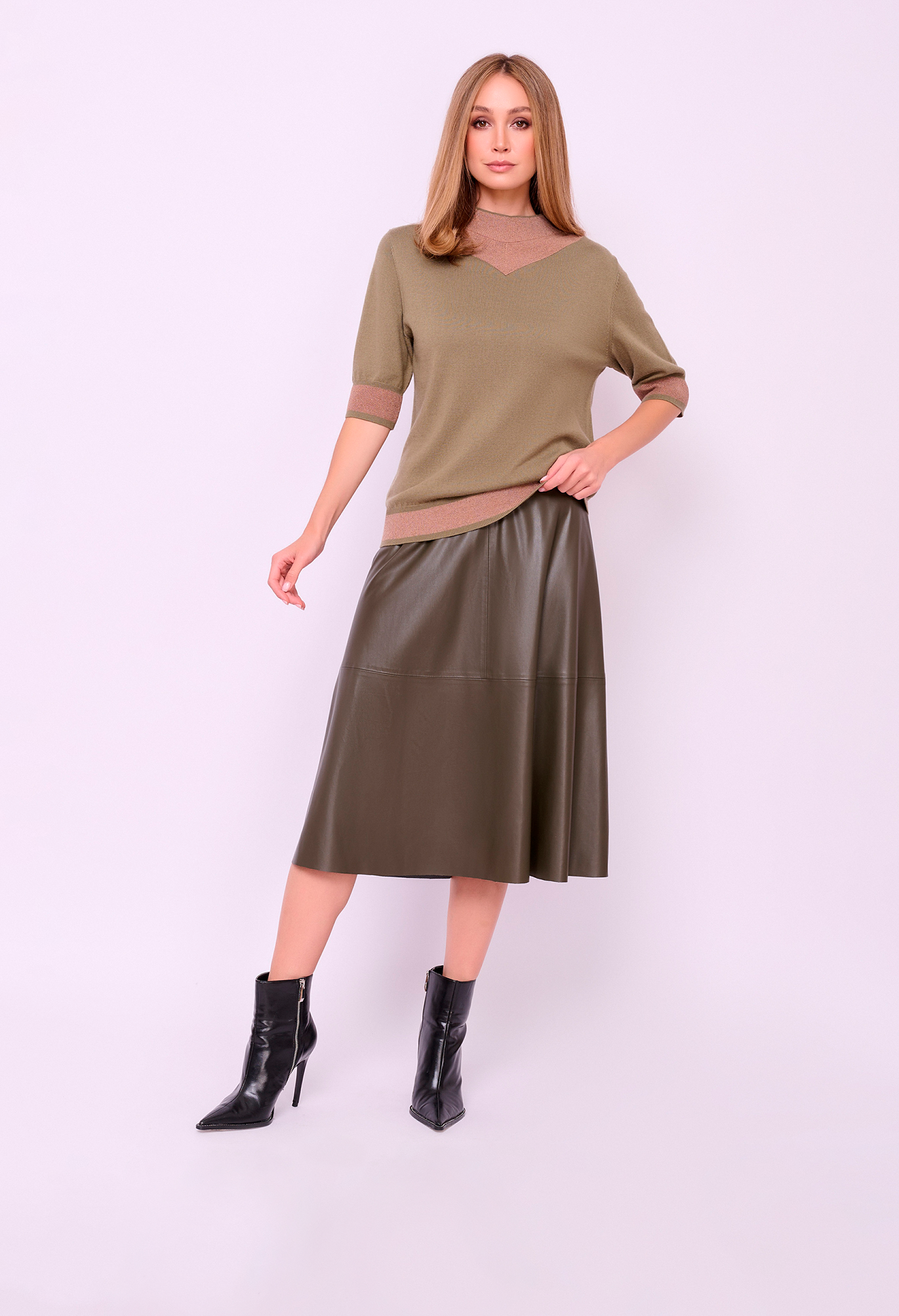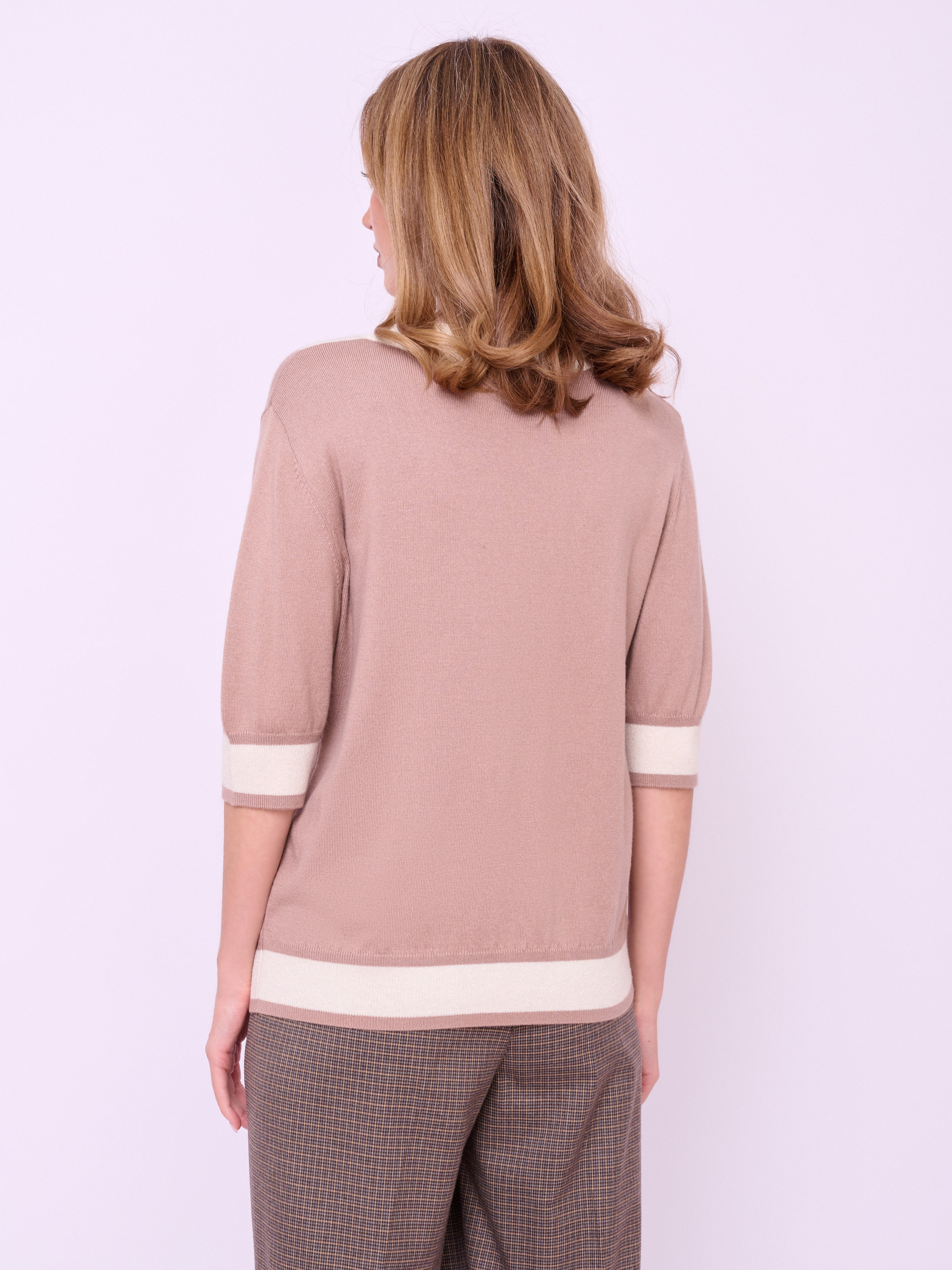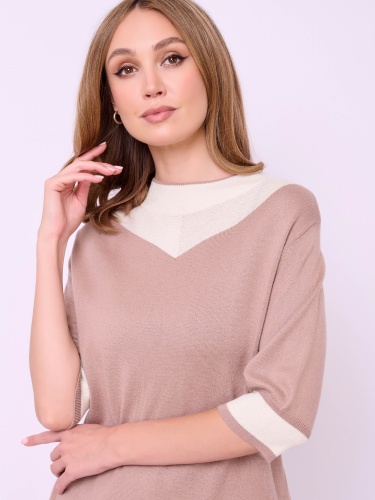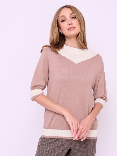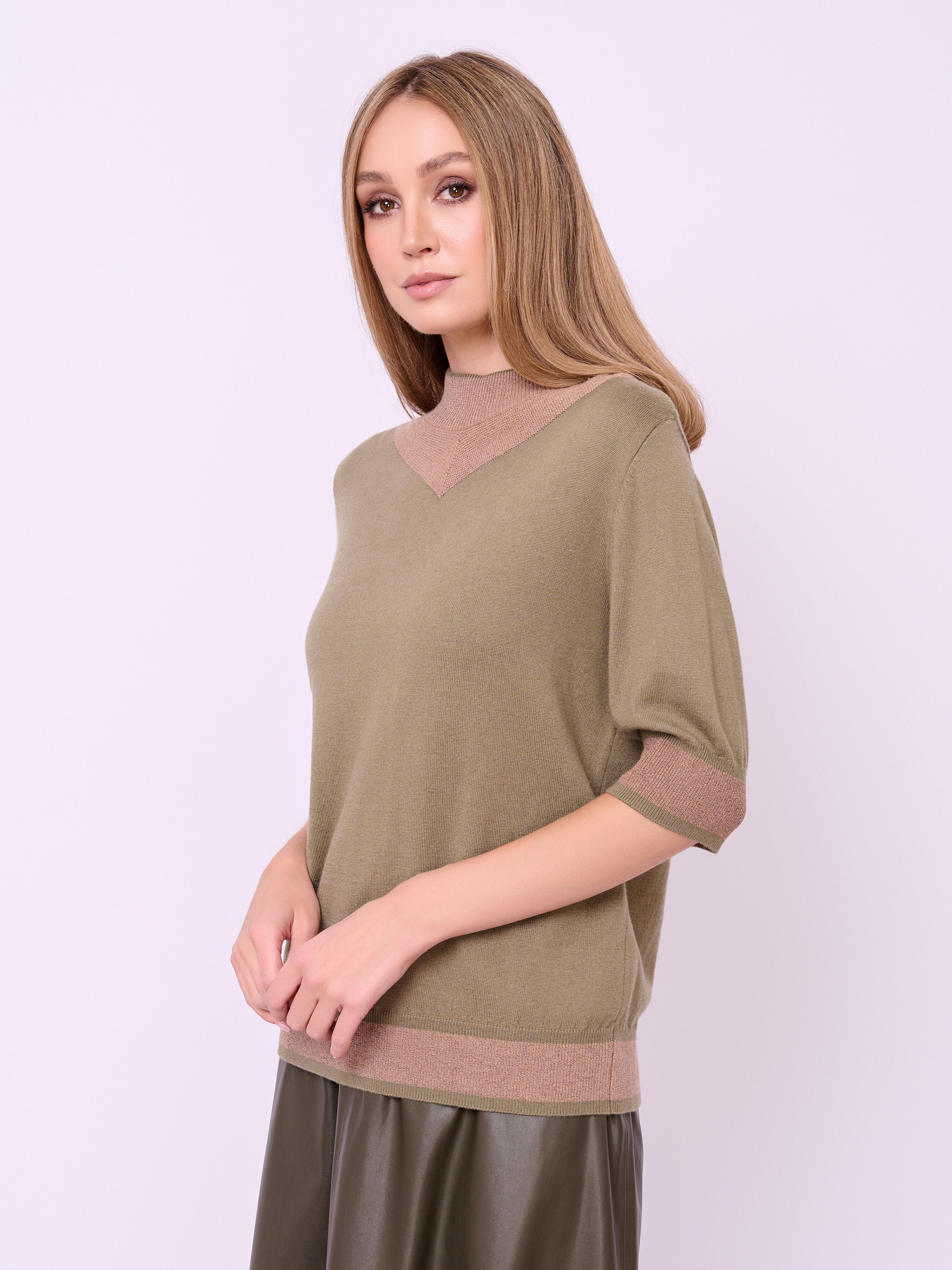 Трикотажный джемпер с воротником-стойкой, рукавами 1/2 и деталями из люрекса. Длина по спинке: 67 см