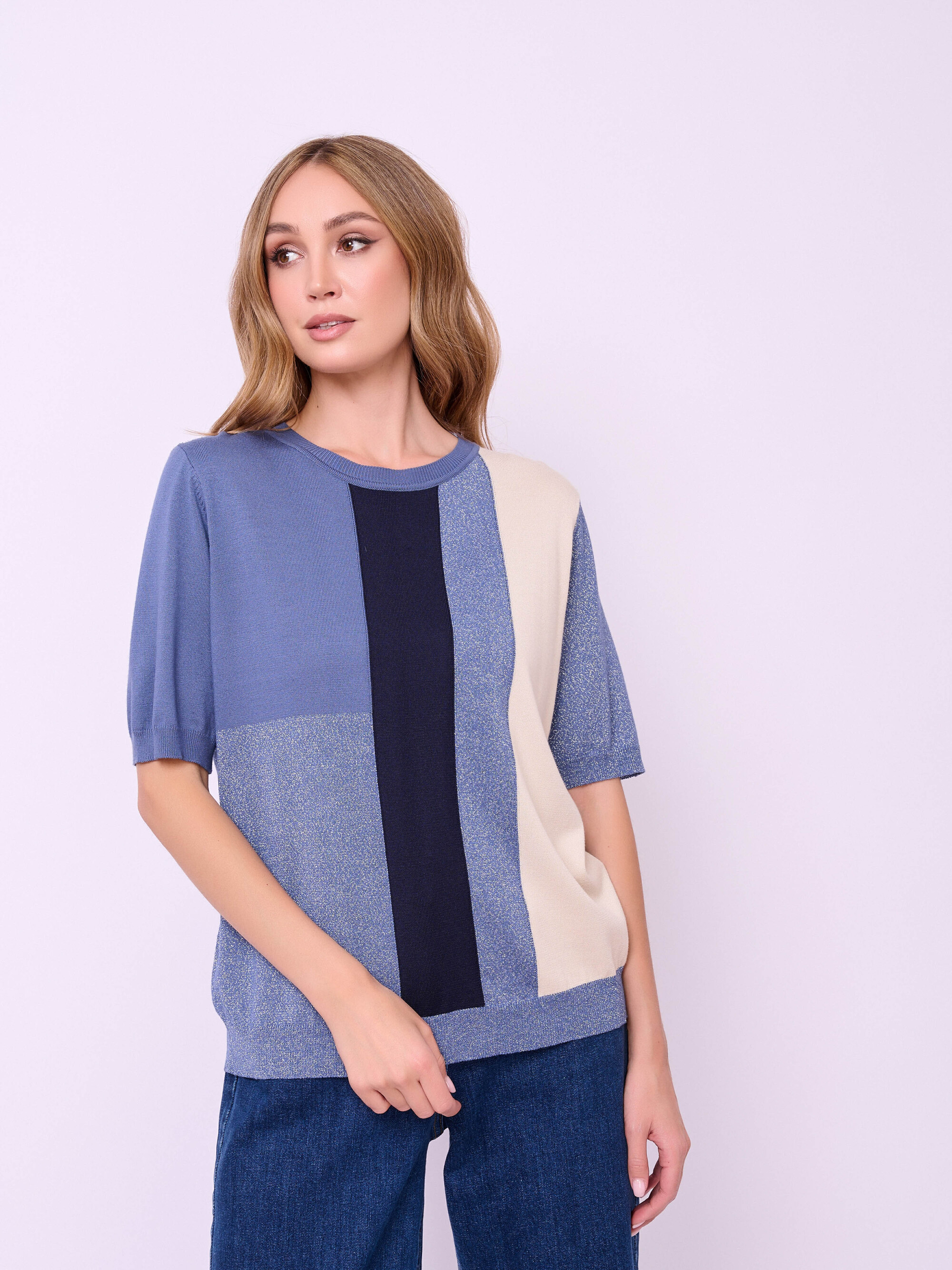 Трикотажный джемпер прямого покроя в стиле «колор блок» с округлой горловиной и короткими рукавами. Длина по спинке: 62 см