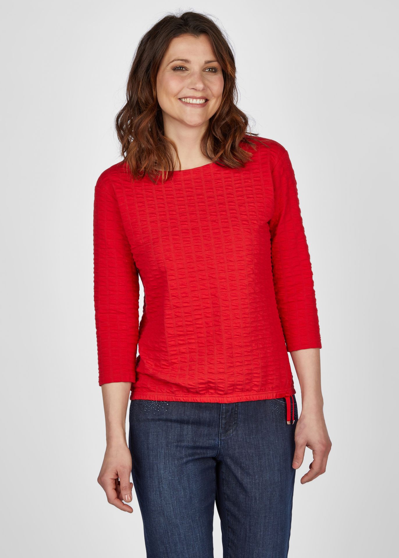 Универсальный однотонный джемпер с круглым вырезом! Этот стильный джемпер идеально подходит для любого случая и имеет удобный рукав длиной 3/4. Петли по нижнему краю придают джемперу особый вид, а структурированный материал гарантирует привлекательный вид. Прямая посадка обеспечивает оптимальную и удобную посадку. Длина спинки от плеча для 44 размера: 62см.