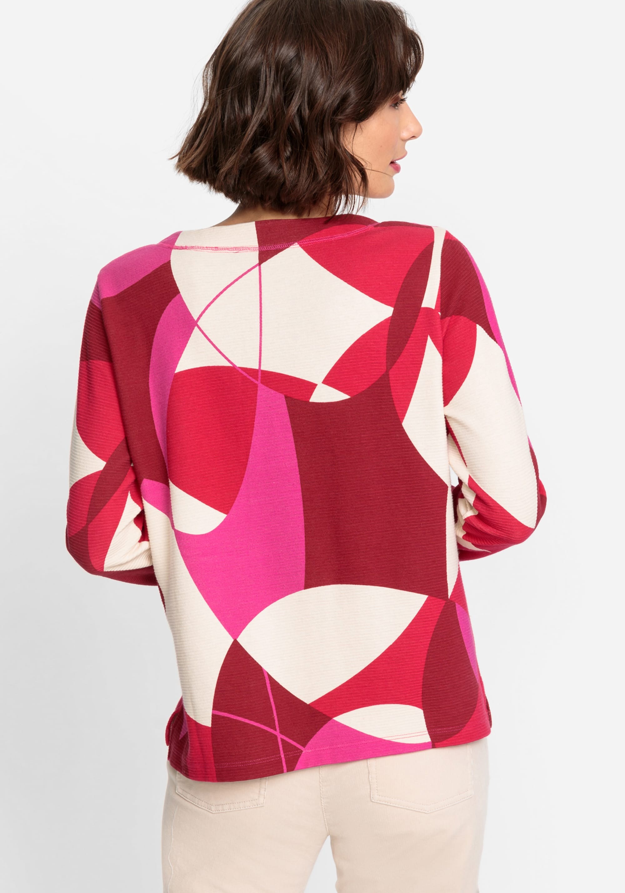 Трикотажный джемпер из джерси в рубчик украшен геометрическим узором по всей поверхности, напоминающим 70-е годы в ярких тонах. Детали включают небольшие боковые разрезы и завязки на закругленном вырезе. Модель Henny имеет прямой крой и слегка прилегает к телу.