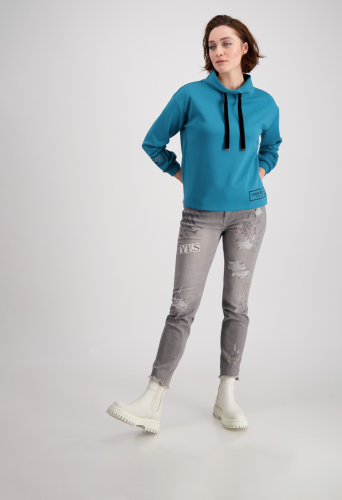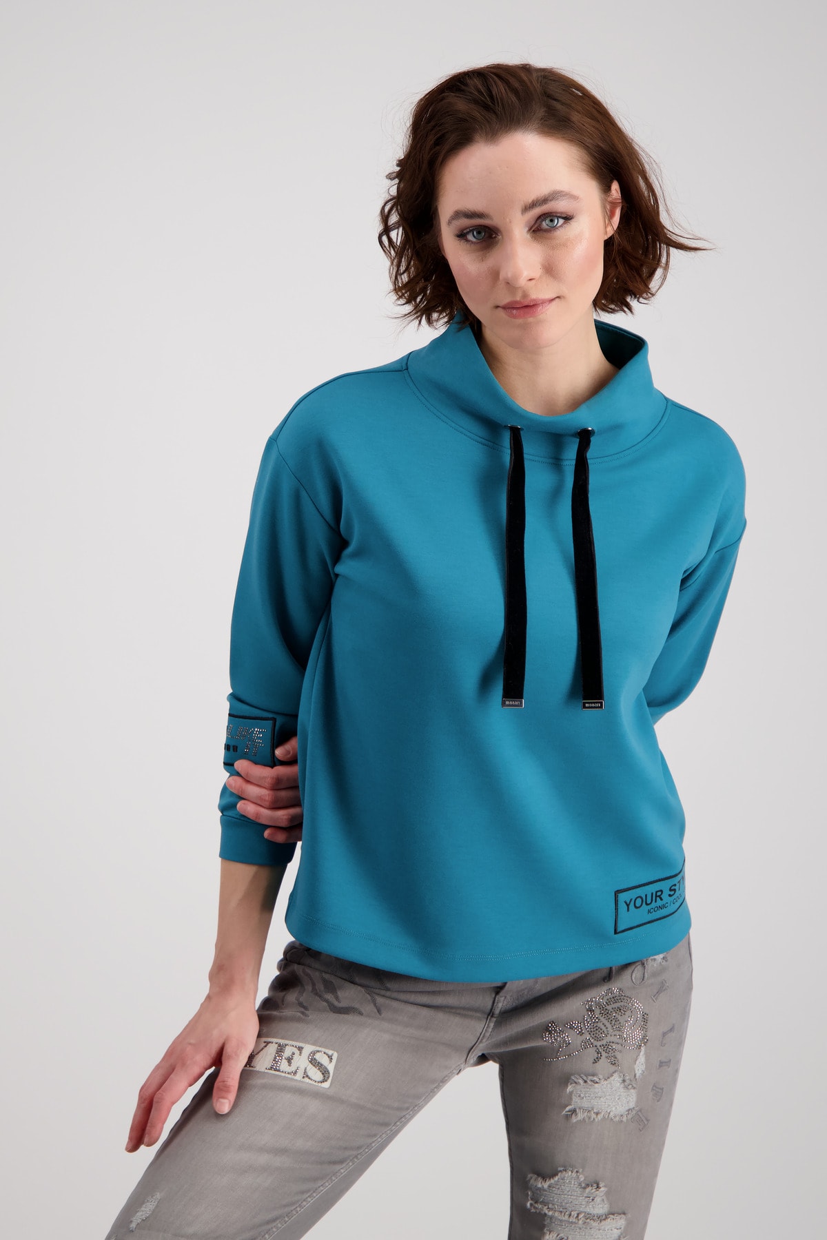 Повседневный свитер с длинными рукавами выполнен из мягкого, приятного на ощупь материала, эластичного и женственного вида. На правом рукаве и спереди модная нашивка с вышивкой и стразами. Длина 44 размера 62 см.