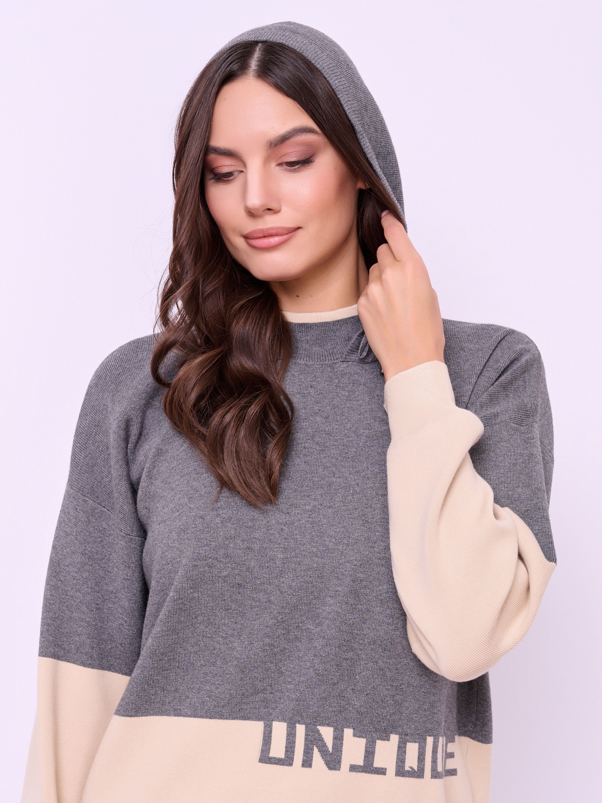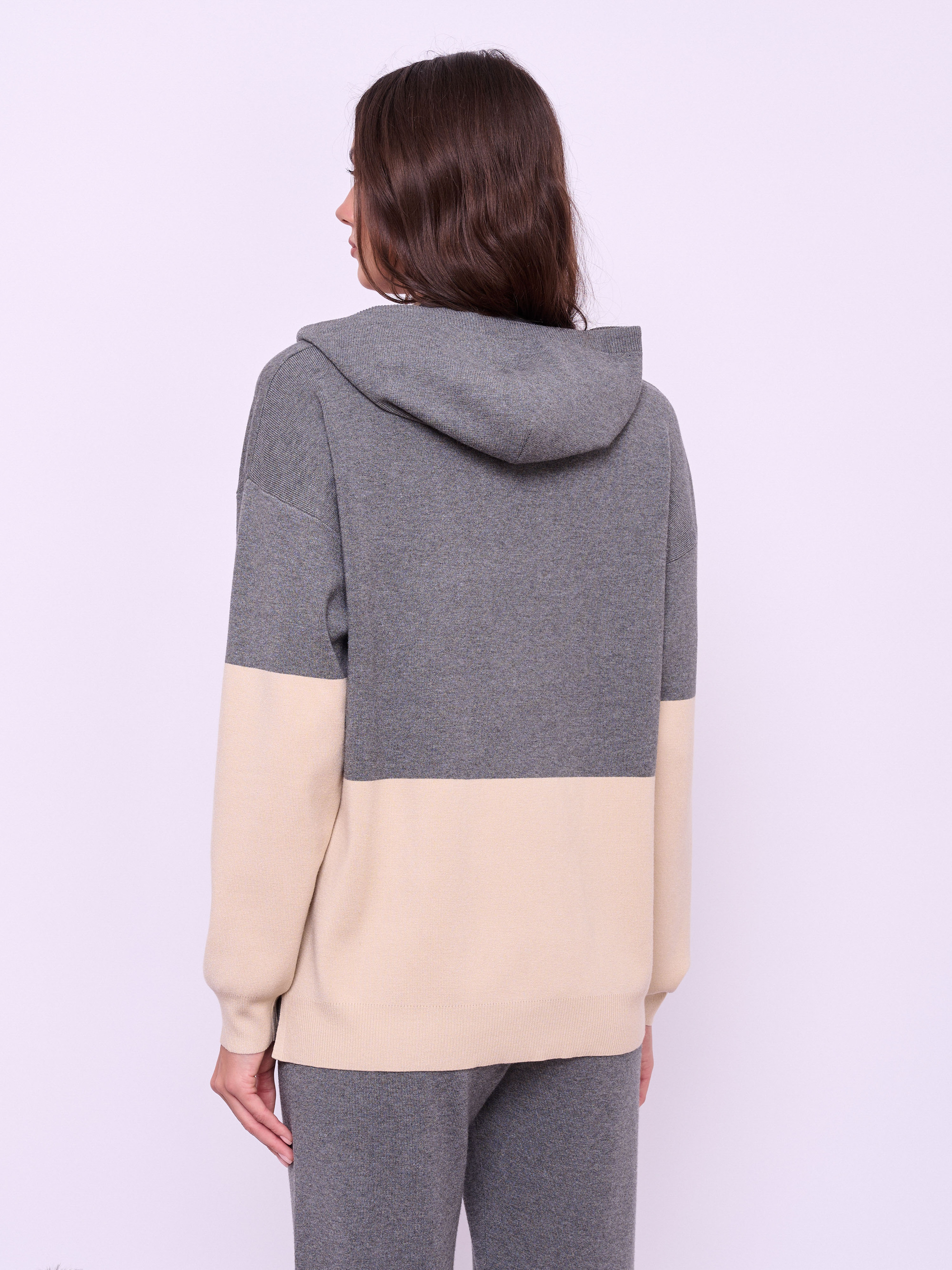 Детали: вырез горловины воротник-капюшон на кулиске, рукава длинные, покрой прямой, рисунок цветные блоки, с надписью, боковые разрезы. Длина по спинке: 66 см.