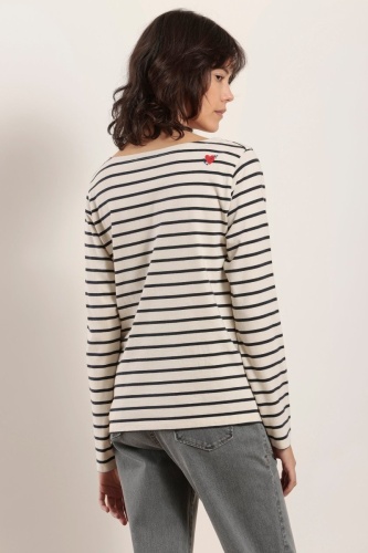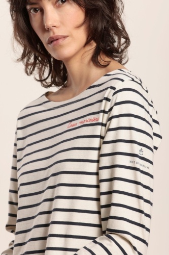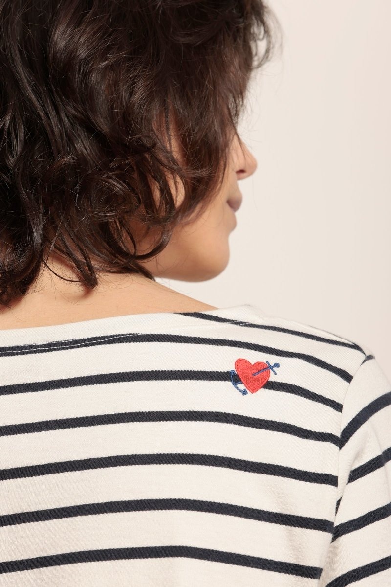 Джемпер из органического хлопка с вышивкой. Прямого покроя. Круглый воротник. Длинные рукава. Контрастная вышивка Coeur Marinière на груди. Вышивка в виде сердца на правом плече и спине. Шелкография на левом рукаве. Небольшой боковой разрез внизу изделия. Длина: 57,5 см для размера 44.