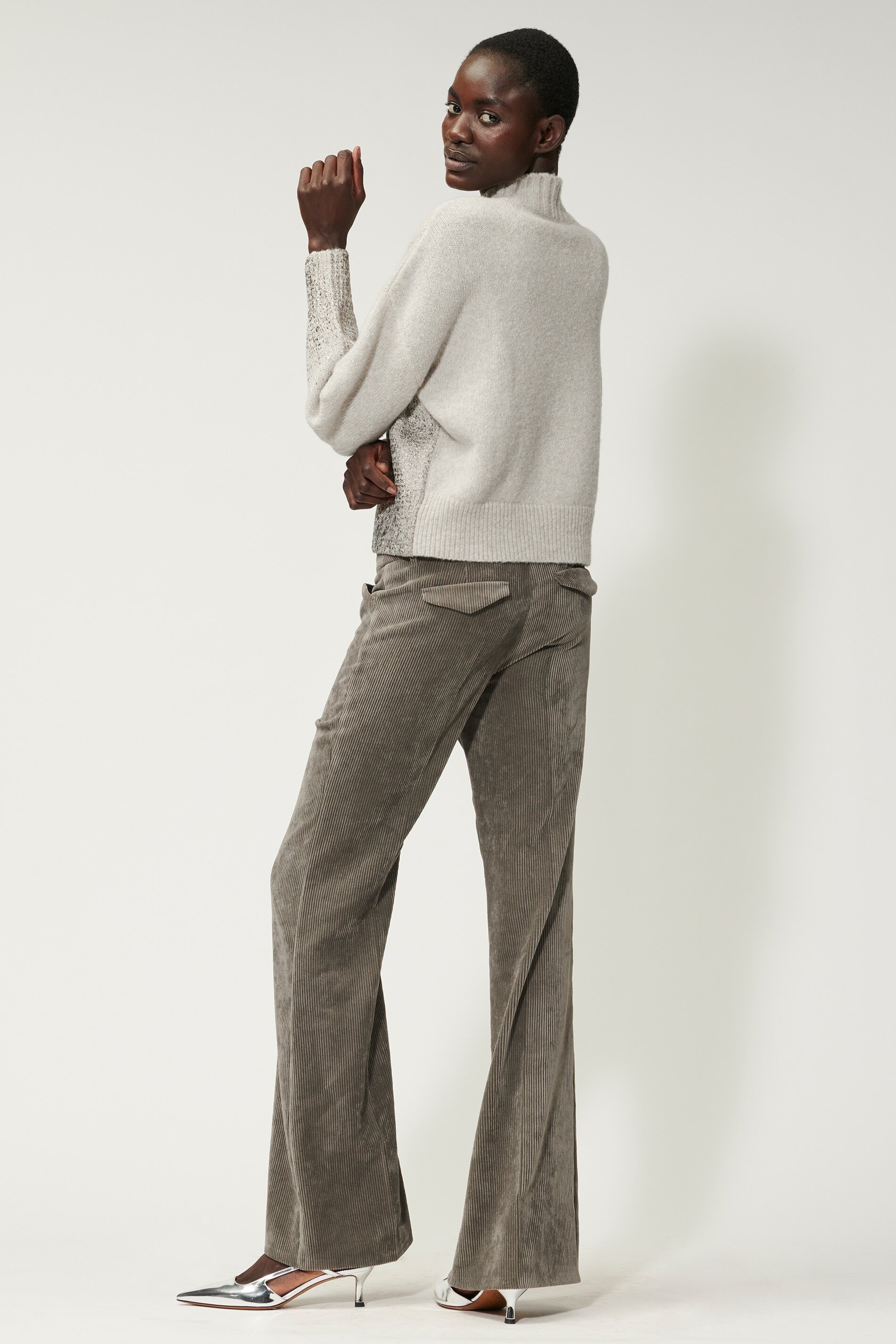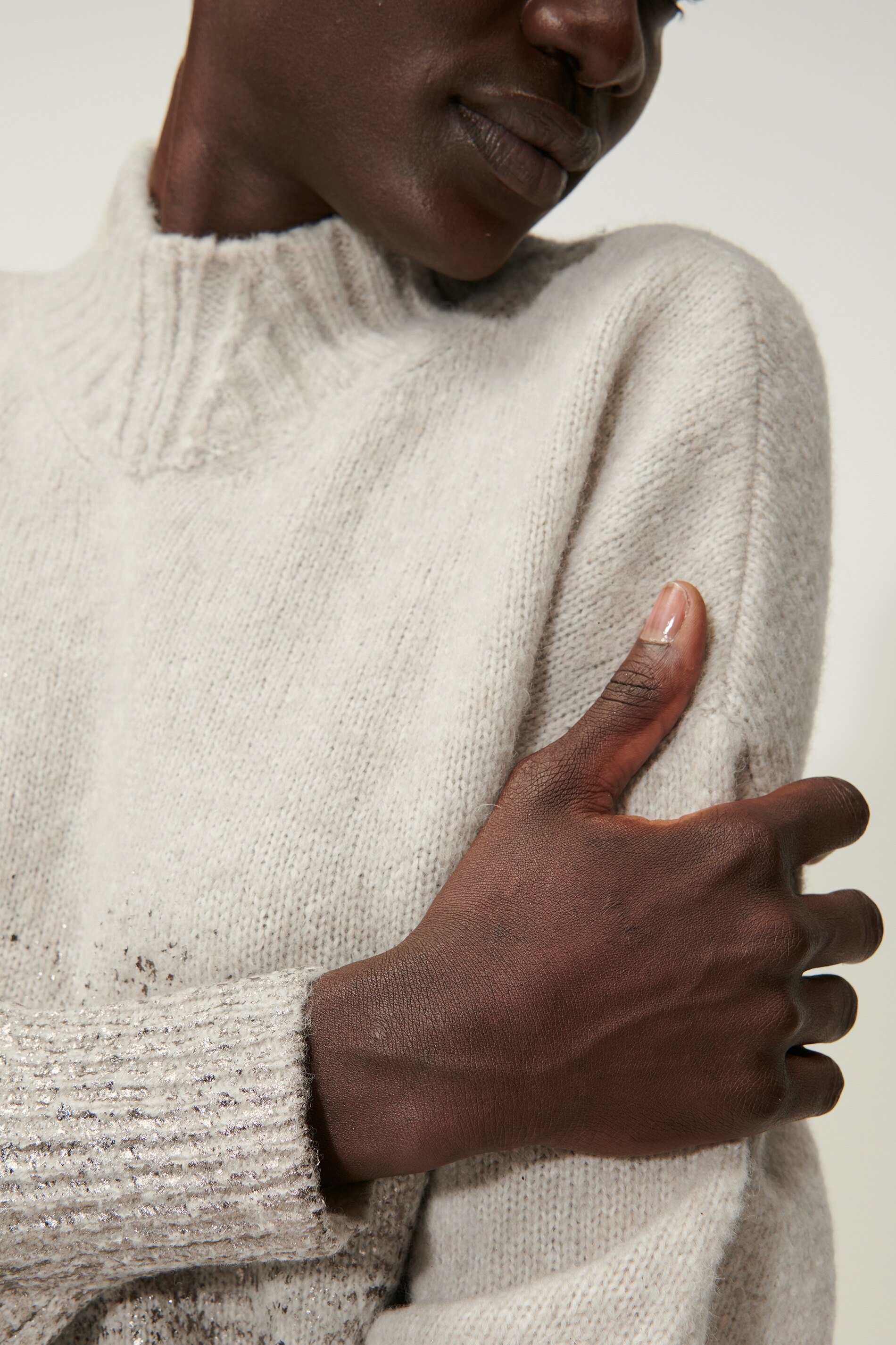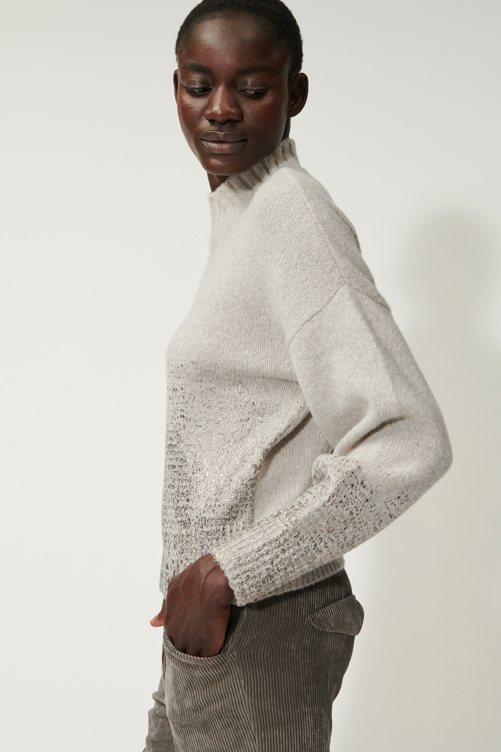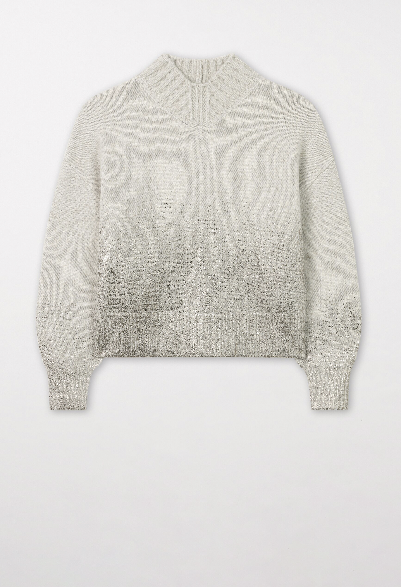 Легкий вязаный пуловер из высококачественной итальянской смесовой шерсти с эффектом меланжа и стильным принтом из металлизированной фольги. Пуловер имеет свободный крой, короткий воротник в рубчик и небольшой V-образный вырез.