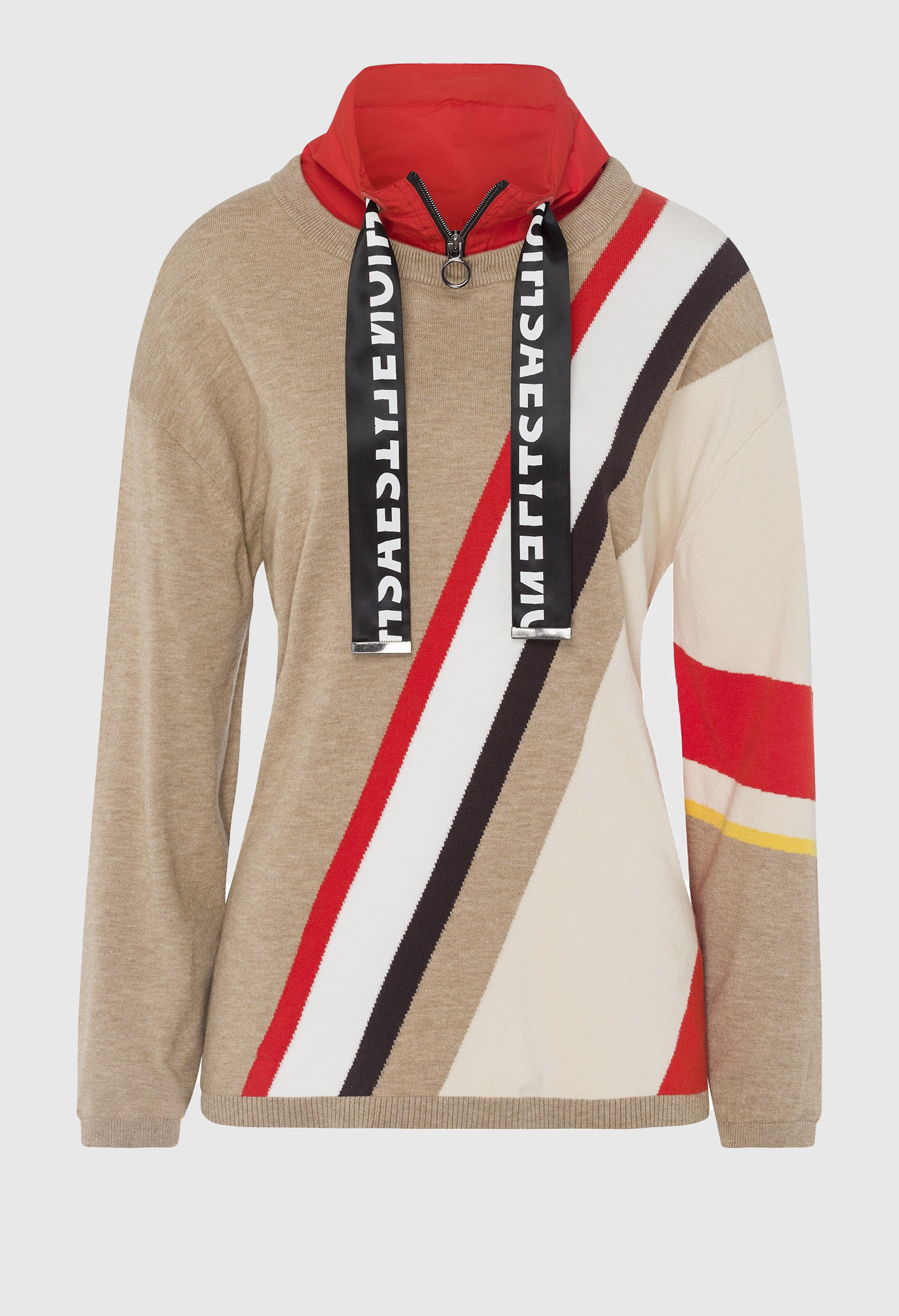 Вязаный женский свитер с вырезом в многослойном виде. Облегающий фигуру свитер из легкой, тонкой вязки с высоким содержанием вискозы. Сплошной узор в гармоничной цветовой гамме определенно заслуживает внимания. Воротник-стойка контрастного цвета с застежкой-молнией и атласными лентами с принтом создает эффектный многослойный образ. Вязаный свитер – это модно и необычно.