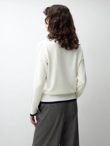 Джемпер с V-образной горловиной в нежно-белом оттенке из 100% хлопка, актуален в любое время года. Тонкая темно-синяя отделочная полоса придаст легкие морские нотки и будет выразительно смотреться с синими низами.