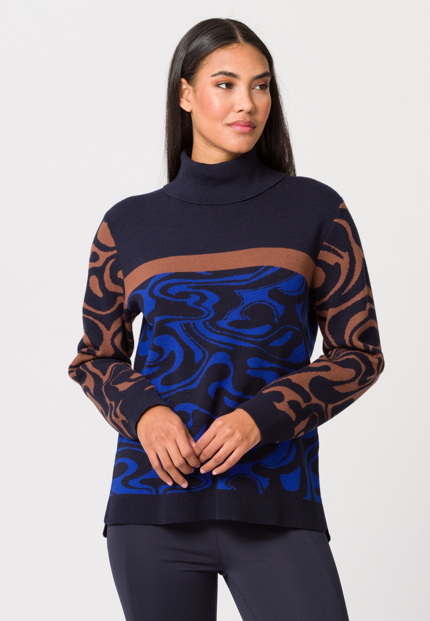Вязаный свитер для женщин с чуть удлиненной спиной. Этот свитер тонкой вязки с высоким содержанием вискозы максимизирует повседневный эффект своего свободного кроя благодаря стильному узору по всей поверхности, слегка удлиненной спине и коротким разрезам по бокам.