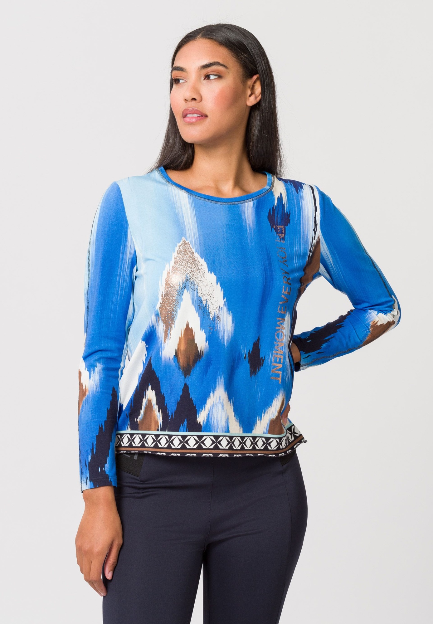 Базовый джемпер с рисунком. Освежающий эффект принта по всей поверхности и металлических деталей покоряет модные сердца и делает эту базовую модель с круглым вырезом незаменимой вещью для спортивного и шикарного повседневного гардероба.