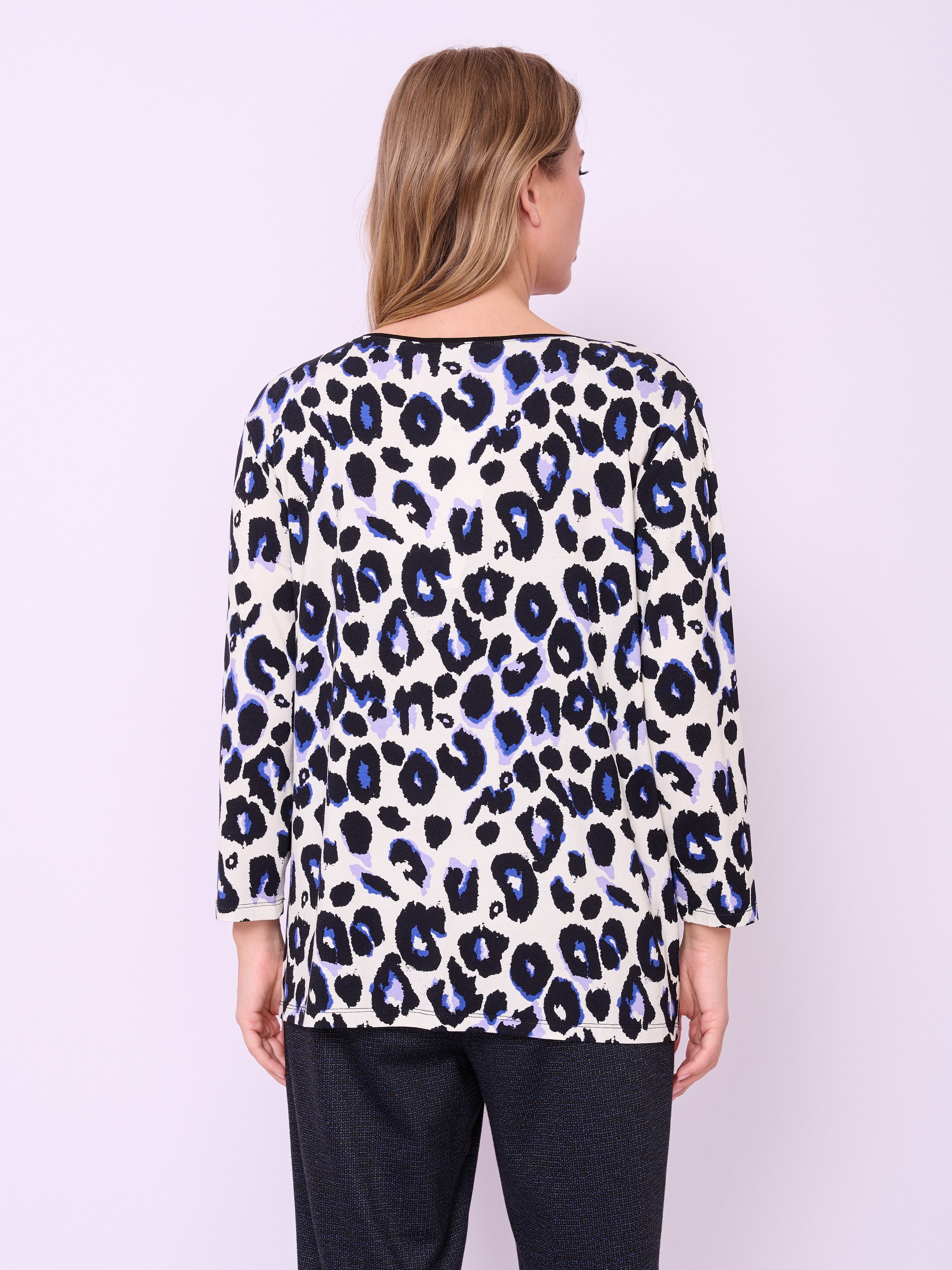 Джемпер трикотажный прямого покроя с глубоким округлым вырезом горловины, рукавами 7/8 и анималистическим рисунком. Длина по спинке: 64 см.