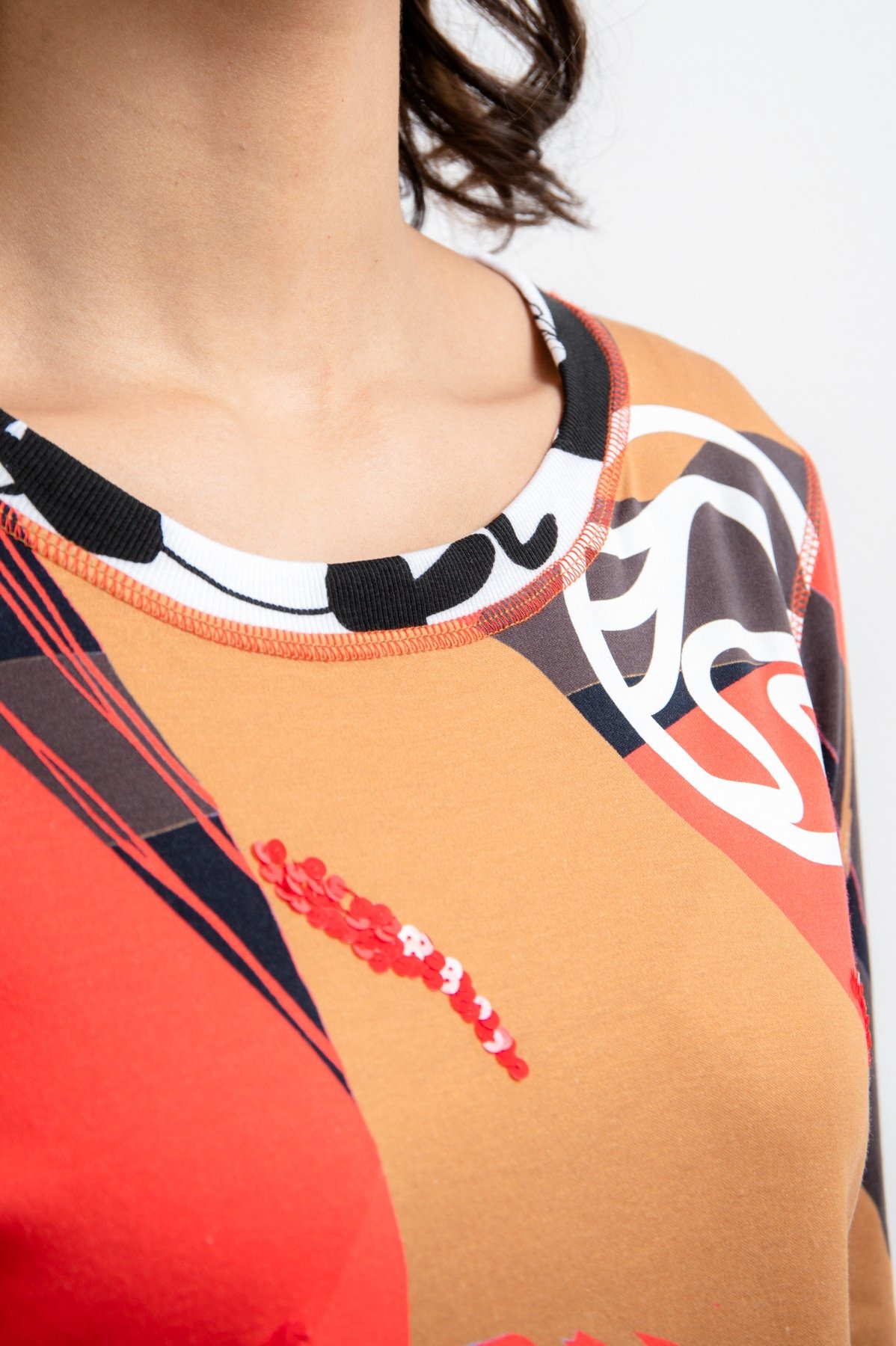 Джемпер с принтом по всей поверхности свободного кроя. Круглый вырез дополнен ребристой манжетой с принтом. Также имеется модная надпись Sportalm спереди, а левое плечо украшено логотипом Sportalm, выполненным из сочетания глянцевого и флока. Контрастные декоративные швы придают джемперу спортивный вид. В боковом шве имеются небольшие разрезы.