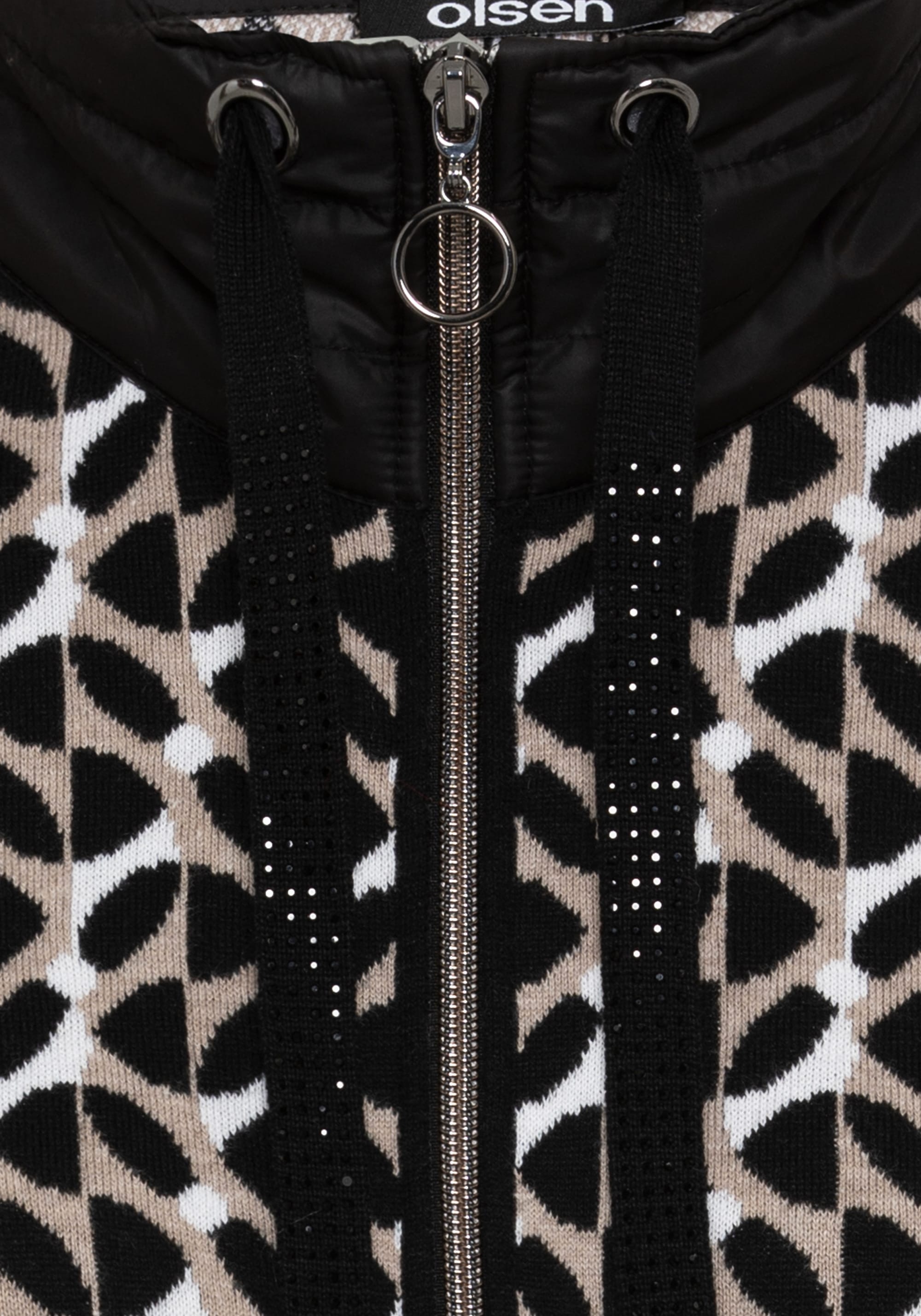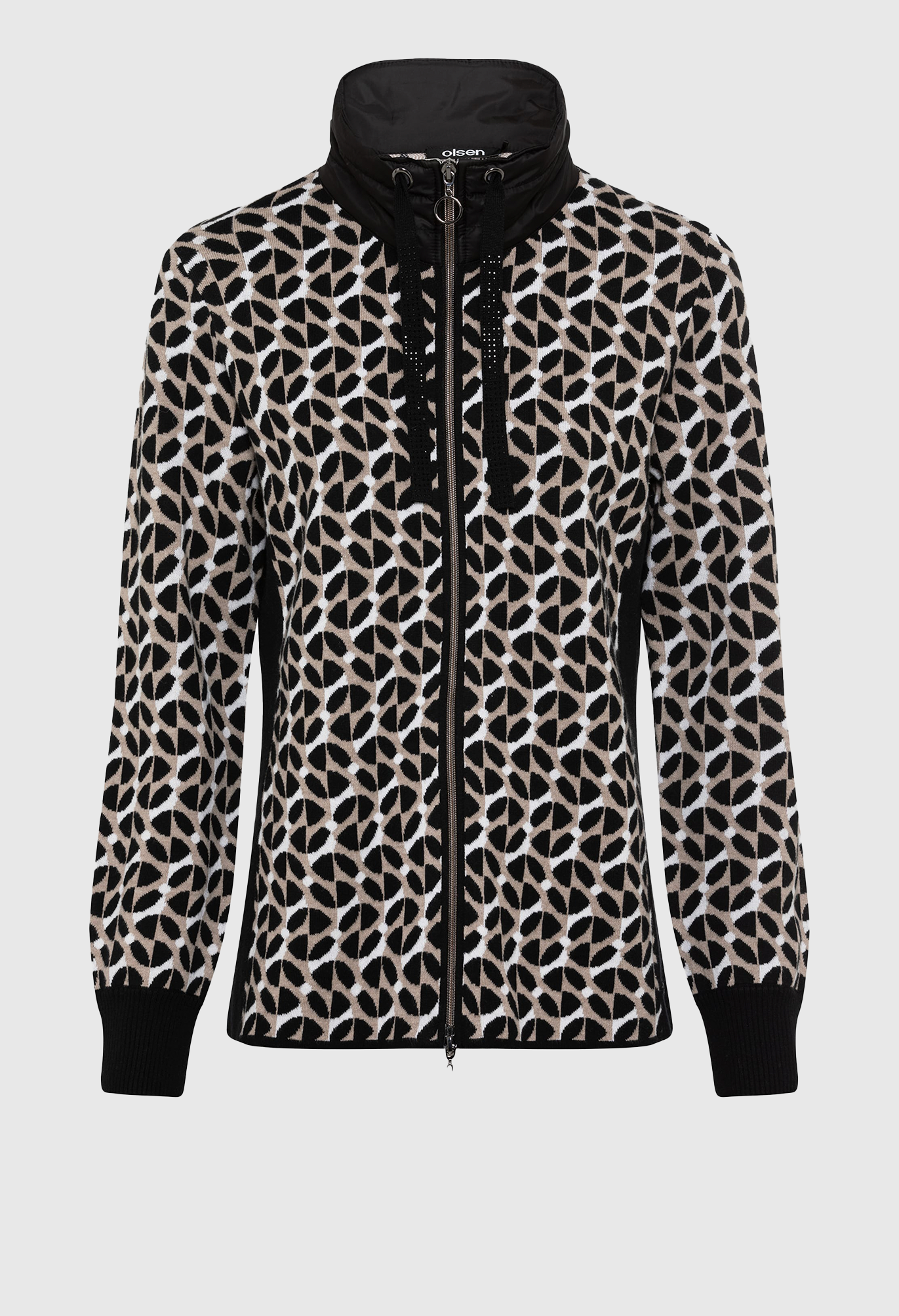 Трендовый геометрический узор по всей поверхности делает яркий акцент в этом спортивном стиле. Сочетание материалов: контрастный нейлоновый воротник в спортивном стиле дополнен стильной, но функциональной кулиской, украшенной стразами. Сплошные черные боковые панели создают иллюзию стройности фигуры. Высокое содержание хлопка для комфорта и воздухопроницаемости, двойная застежка-молния. Облегающий крой плотно прилегает к телу.