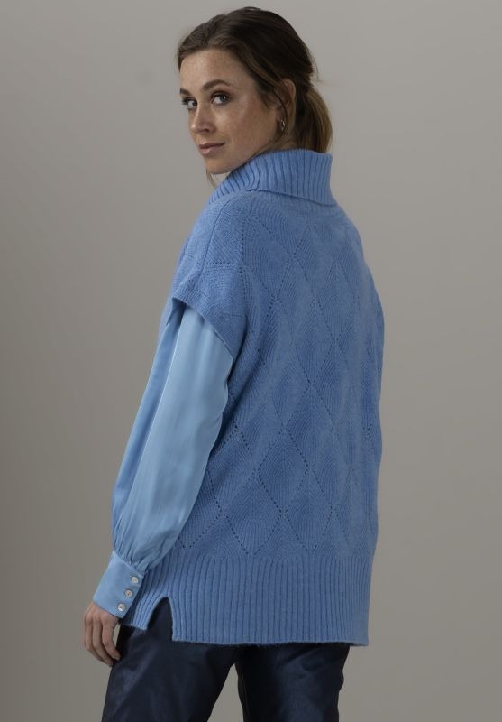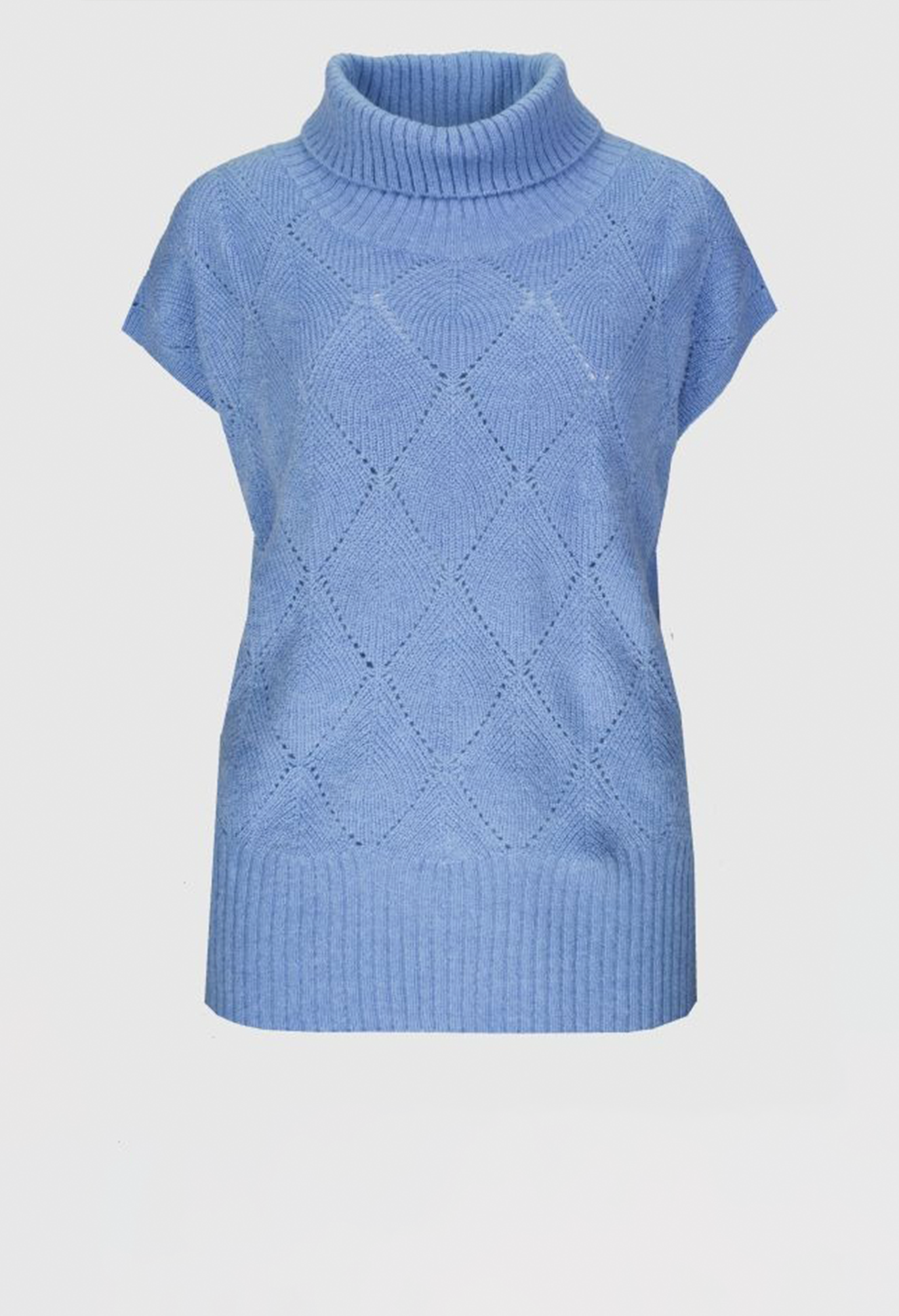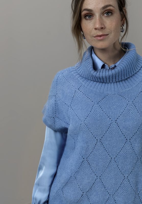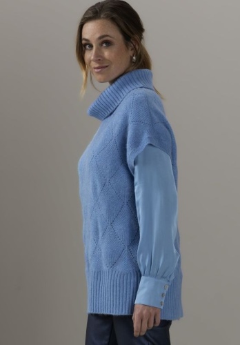 Вязаный свитер с короткими рукавами внахлест. Высококачественная смесь материалов с содержанием шерсти. С широким ребристым краем. Прямой свободный крой с боковыми разрезами по низу. Длина модели в 44 размере - 63 см.