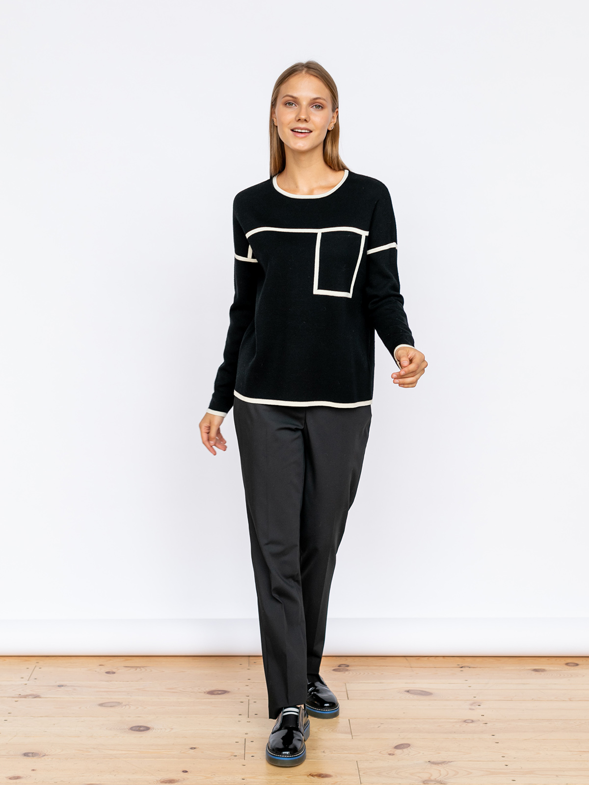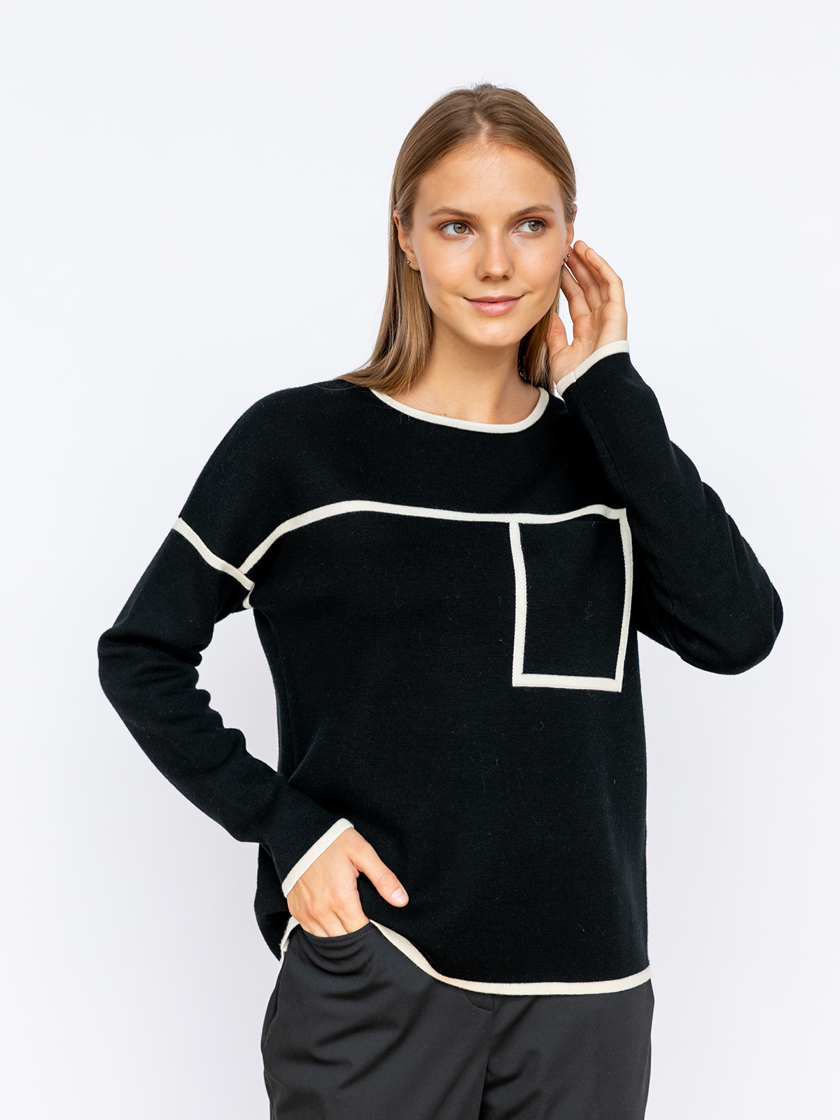 Однотонный джемпер с контрастными линиями – оригинальный дизайн для образов в стиле кэжуал. Вырез горловины лодочка, длинный втачной рукав, спущенная линия плеч. Накладной карман на груди. Джемпер из 100% шерсти приятен к телу и хорошо сохраняет тепло. Предпочтительно носить навыпуск с джинсами, брюками или юбкой длиной миди.