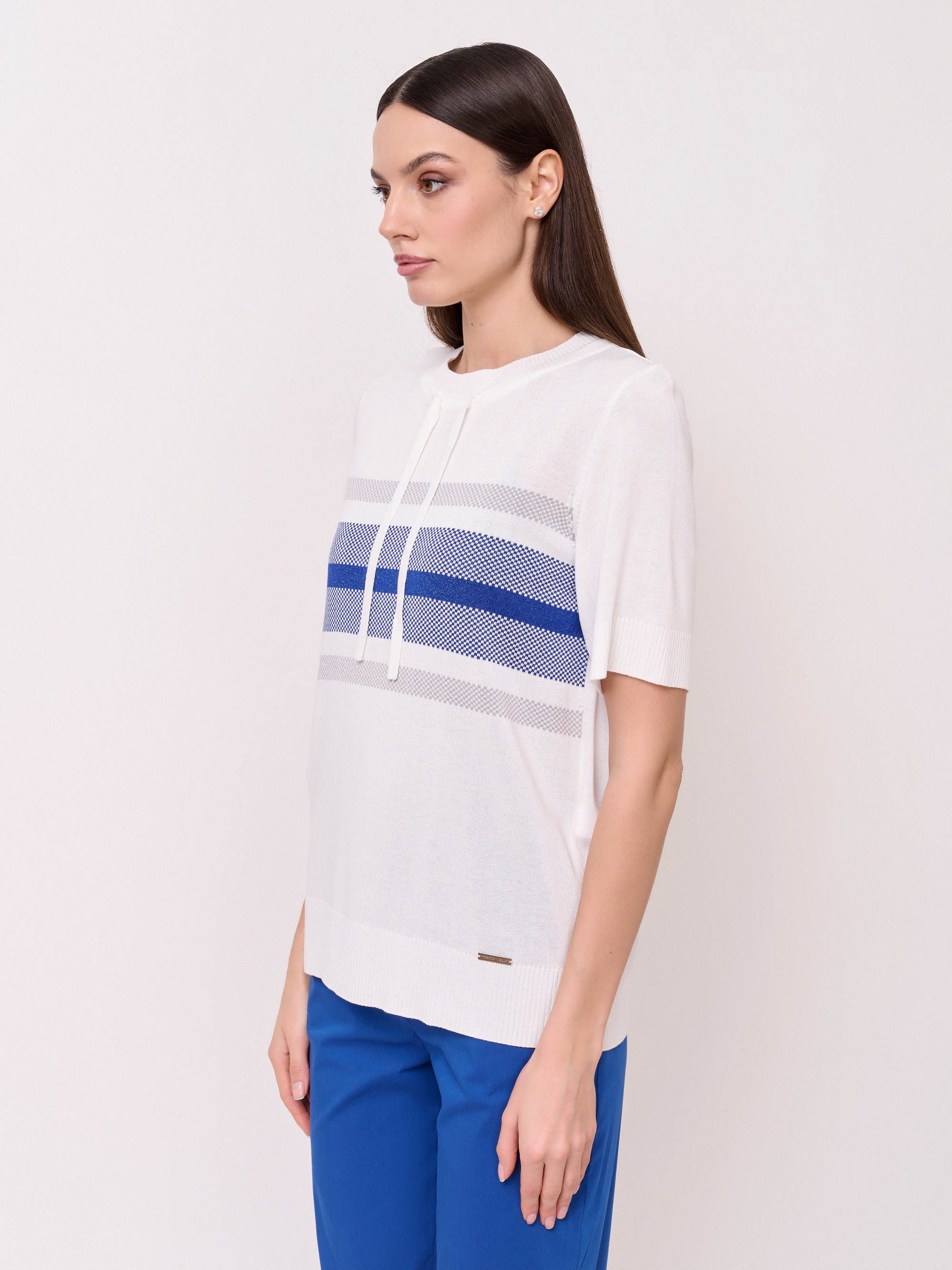 Детали: вырез горловины округлый, кулиска по линии горловины, рукава короткие, покрой прямой, рисунок полоски с люрексом. Длина по спинке: 61 см.