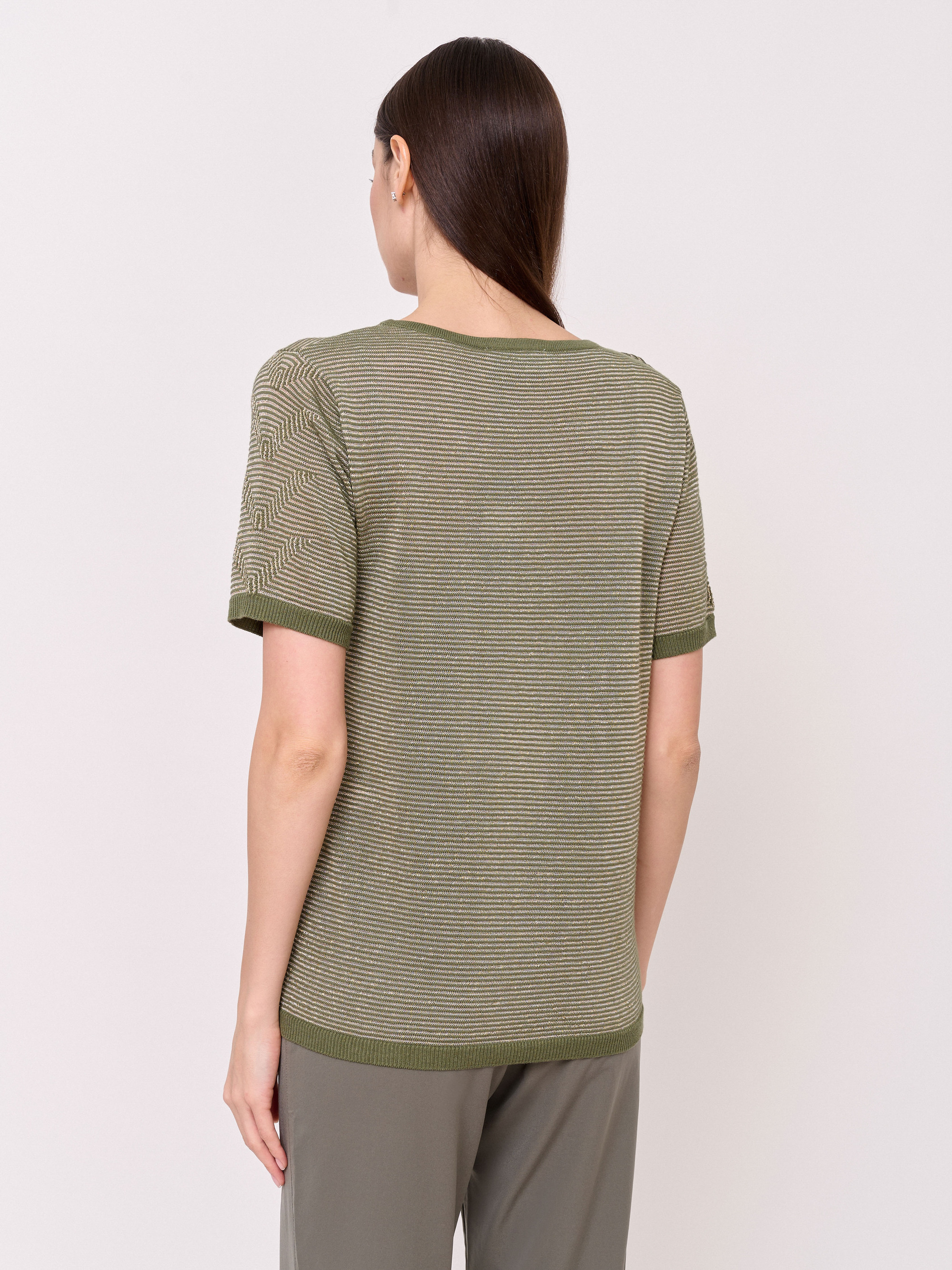 Детали: вырез горловины округлый, рукава короткие, покрой прямой, рисунок полоска, люрекс. Длина по спинке: 62 см.