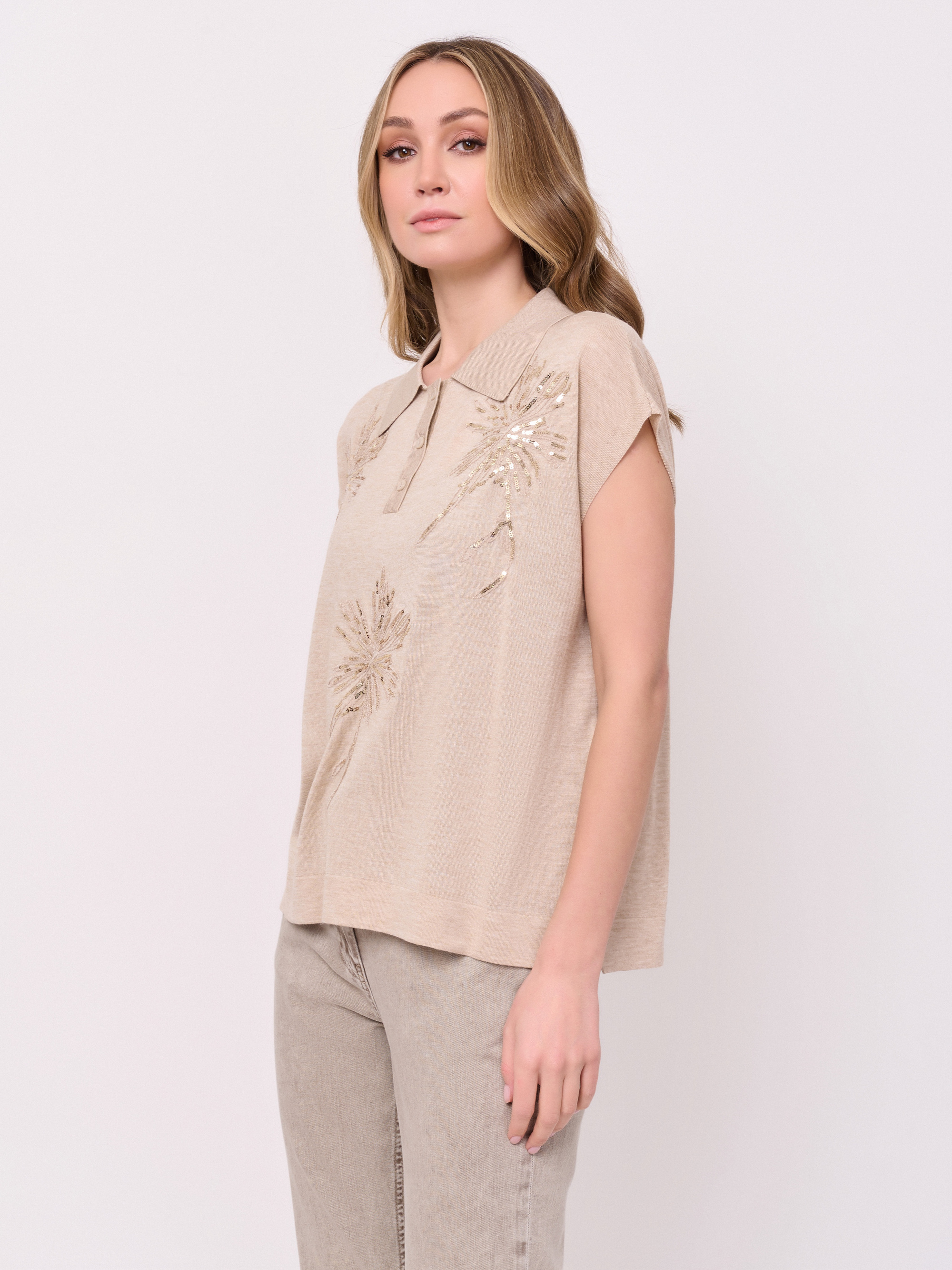 Детали: вырез горловины отложной воротничок, рукава короткие, покрой прямой, рисунок фактурный с пайетками - цветы. Длина по спинке: 59 см.