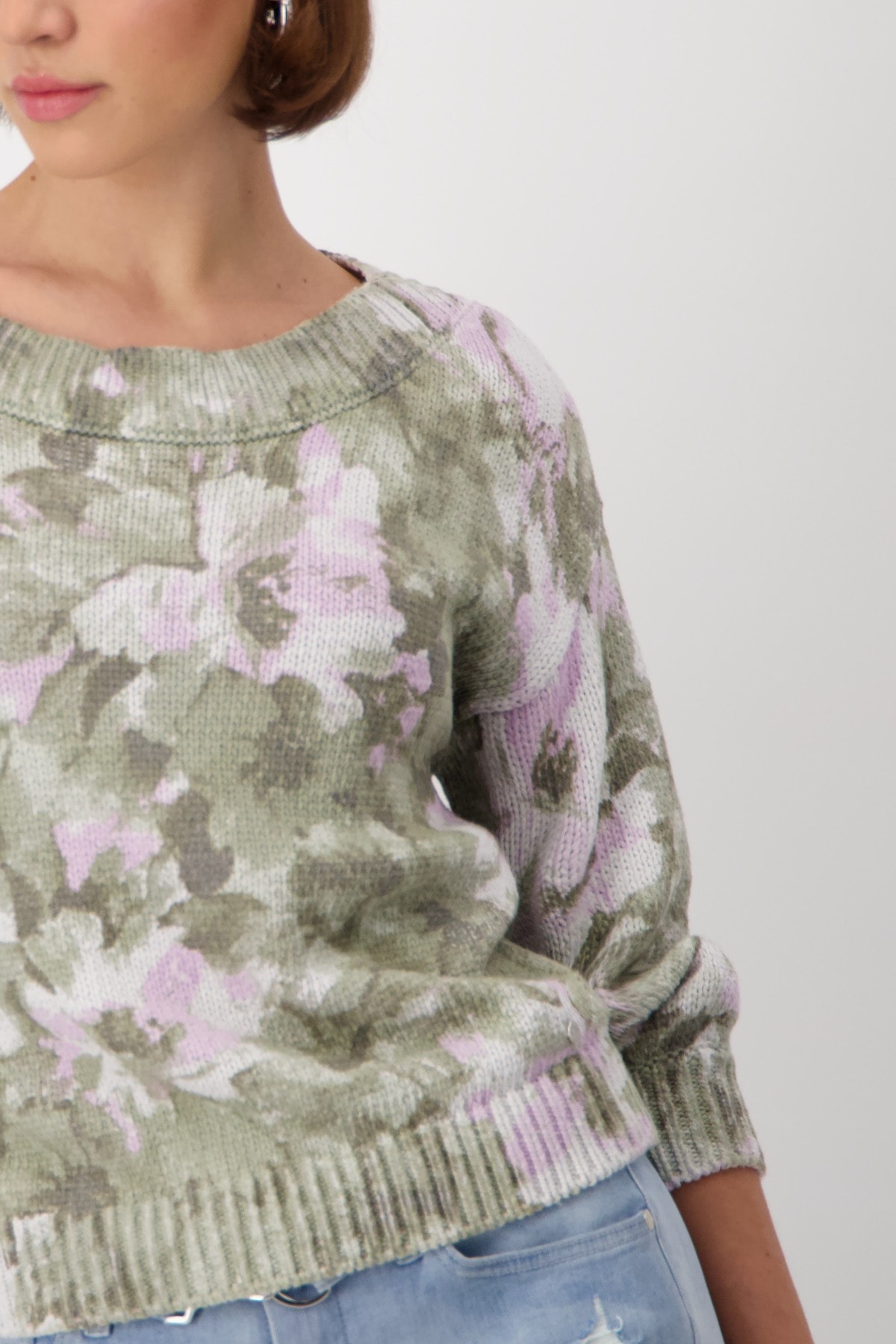 Свитер из 100% хлопка отличается красивым цветочным узором и ребристым вырезом-лодочкой. Регулярная посадка. Перерез на 3/4 руки. Ребристые манжеты и подол. Длина 44 размера 54 см.